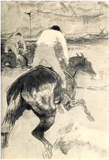 Certes, je pourrais citer bien d'autres anecdotes pour montrer que le comte Alphonse de Toulouse-Lautrec-Monfa était vraiment un gentilhomme d'une totale extravagance; mais, aussi 11 bien, il faut, peut-être, se contenter du significatif dessin que Forain fit d'après lui, et qui le représente, cet insolite gentilhomme, à cheval, son ample manteau déroulé, comme une robe de cour, sur la croupe de la bête?