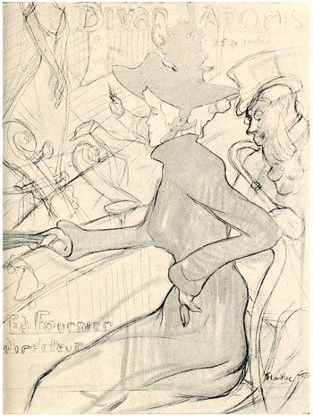 Les Japonais! Théodore Duret et Cernuschi, de retour d'un féerique voyage au Japon, les avaient mis à la mode; et on commençait de collectionner les si neuves estampes du Nippon, arrivées par les bateaux de commerce. Portier, le marchand de tableaux, en avait acquis un lot; et Lautrec lui acheta certaines de ces estampes. Il se passionna, comme Van Gogh, pour ces planches qu'avaient griffé Harounobu, Kiyonaga, Toyokouni, Outamaro, Hiroschigé et Hokousaï.