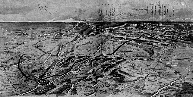 Au commencement de la bataille de l'Aisne, les fronts des deux armées occupaient deux lignes parallèles entre elles, orientées suivant la direction Soissons-Reims-Verdun. Actuellement, notre aile gauche, par une avance régulière, a repoussé, vers le Nord-Est, l'aile droite allemande.