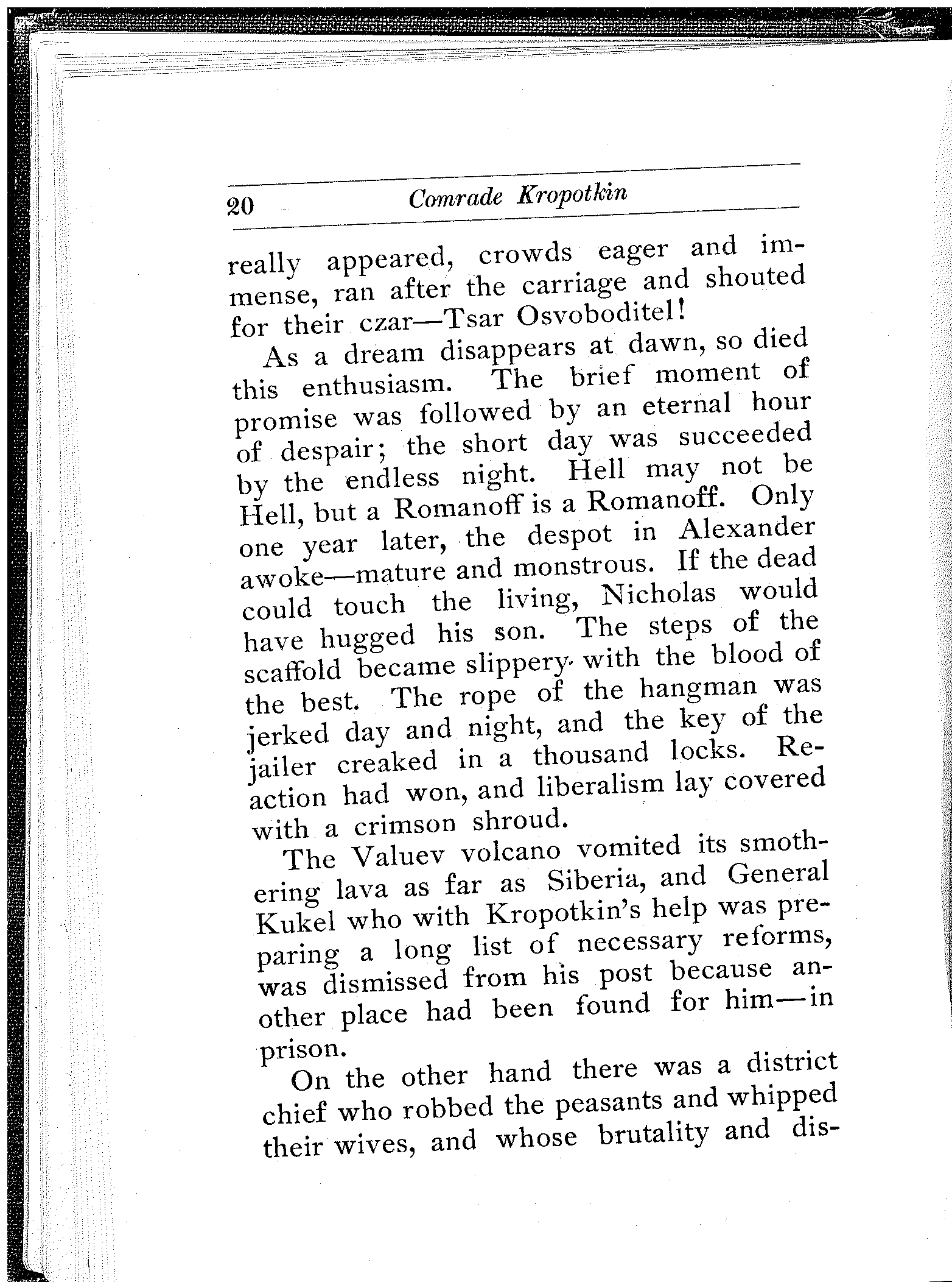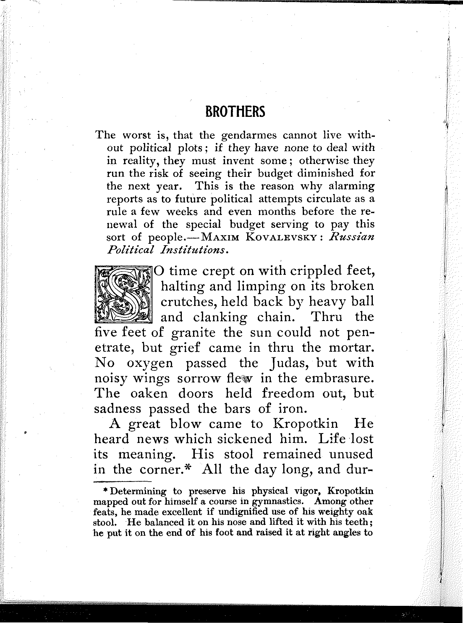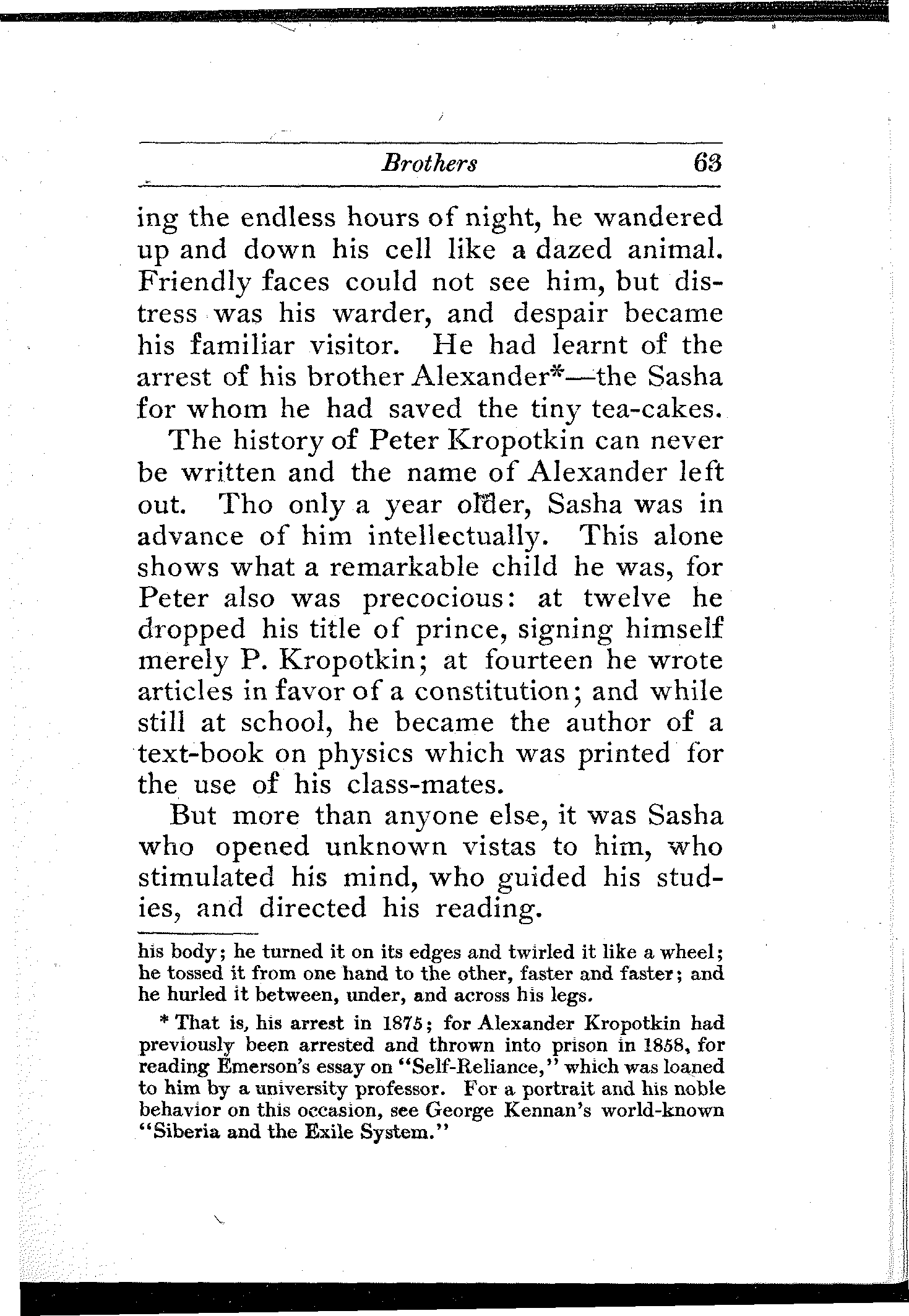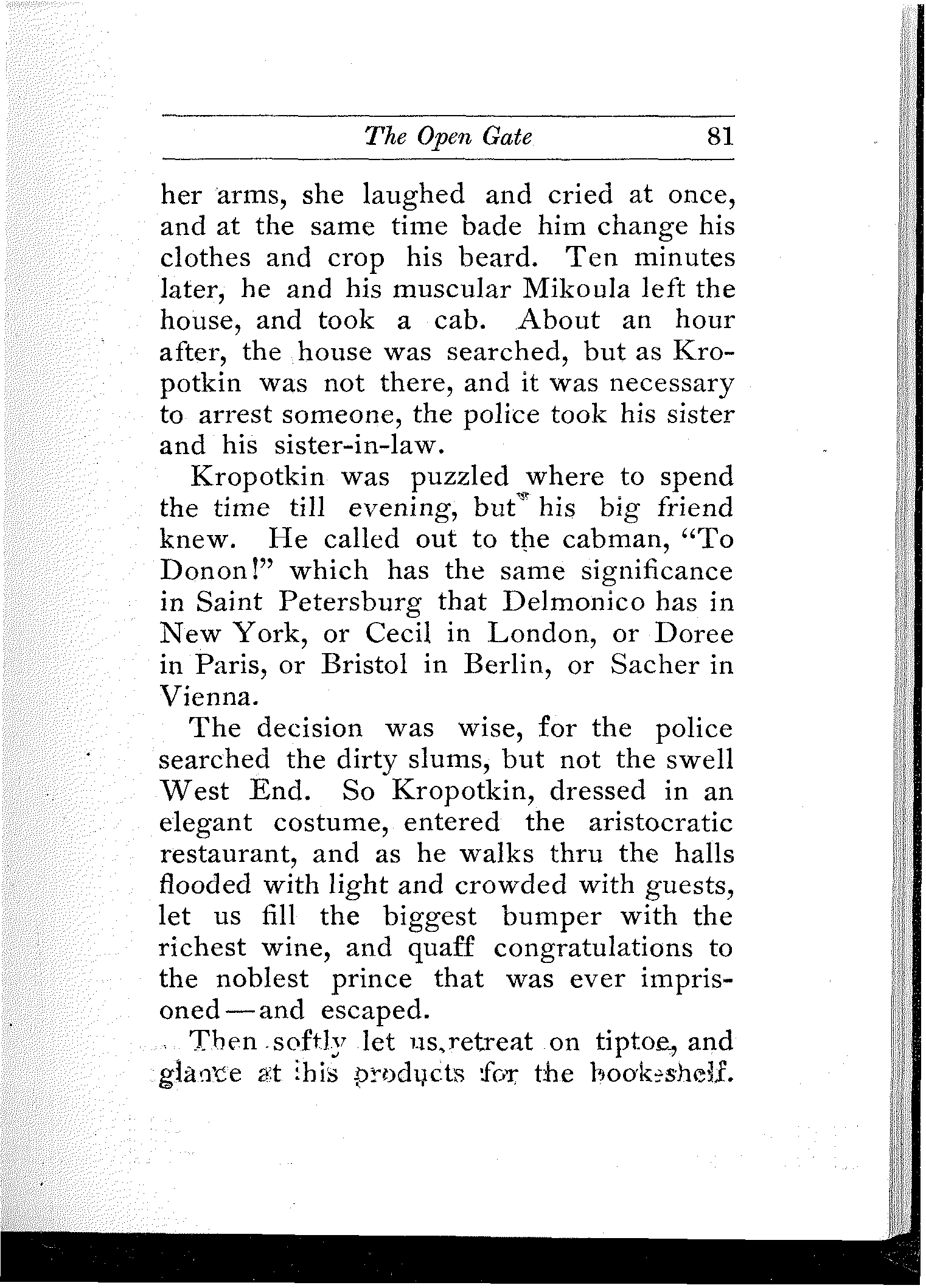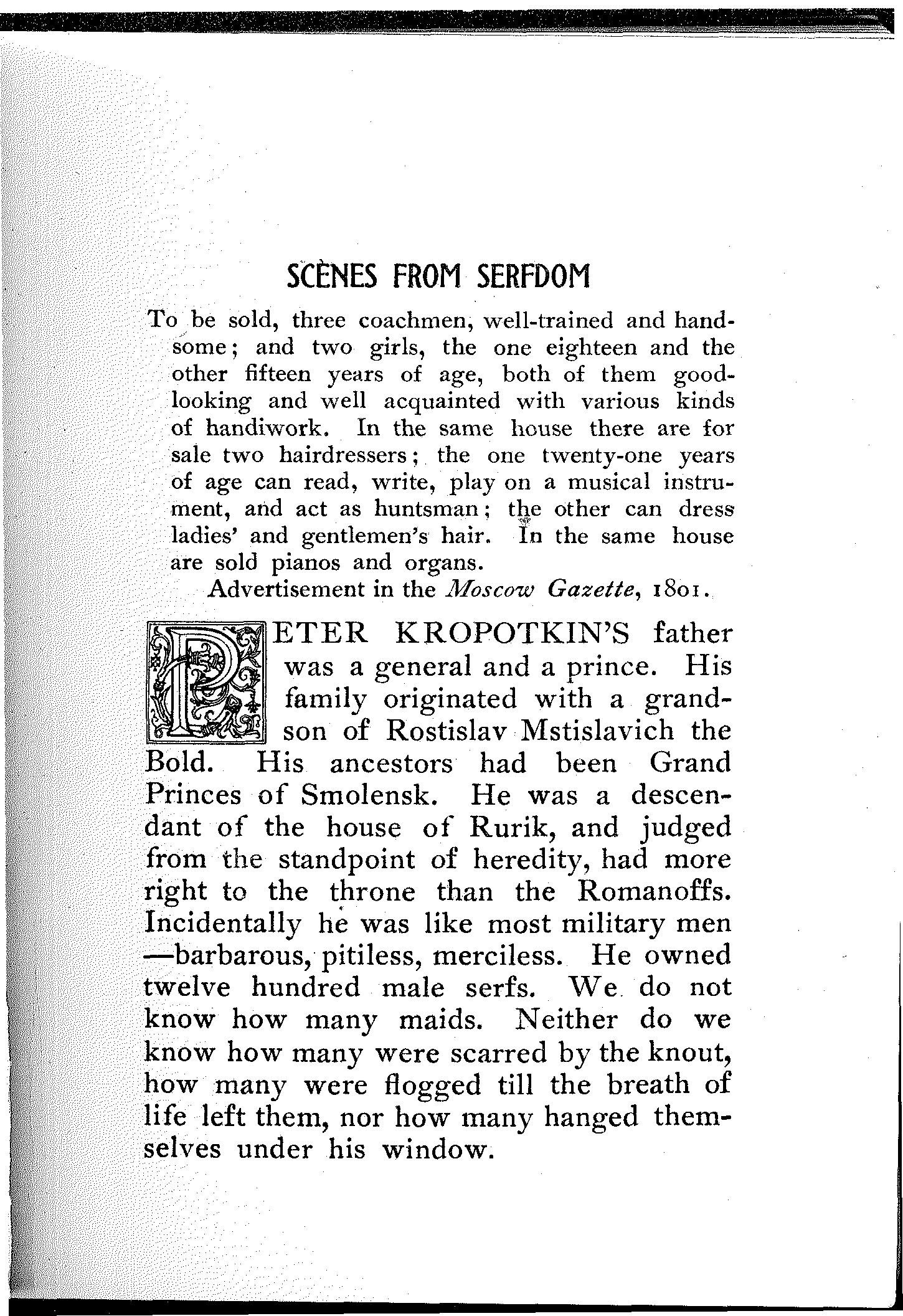 During the sixth year of the reign of Alexander II., a servant dashed wildly into Peter Kropotkin's room. It was early in the morning, and Kropotkin was still in bed. But the servant brandished the tea tray and babbled excitedly, "Prince, freedom! The manifesto is posted on the Gostinoi Dvor." In a moment Kropotkin was dressed and began to run out. Just then a friend came running in. "Kropotkin, freedom!" he shouted, "Here is the manifesto!"