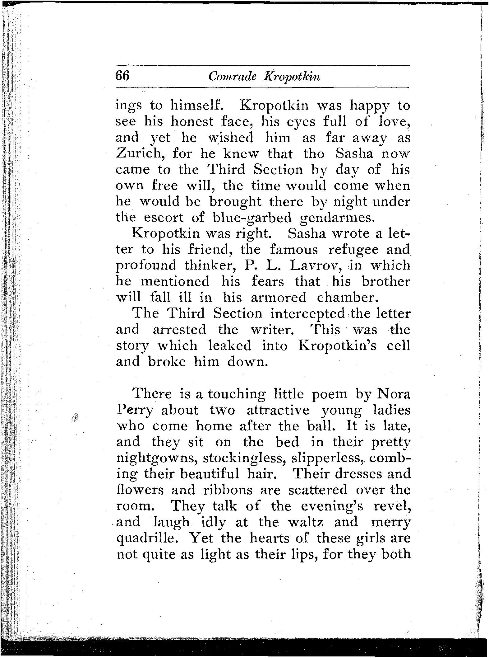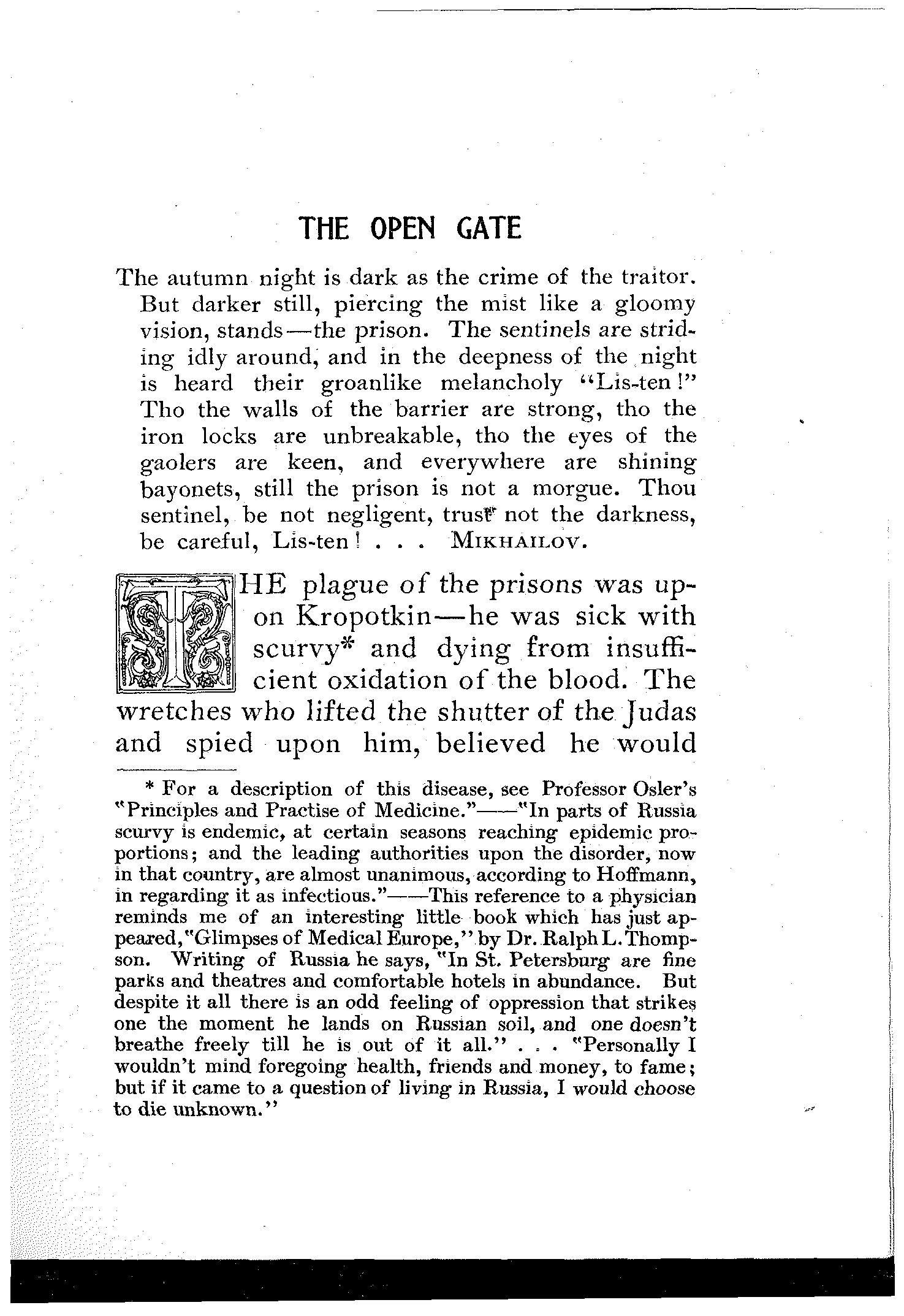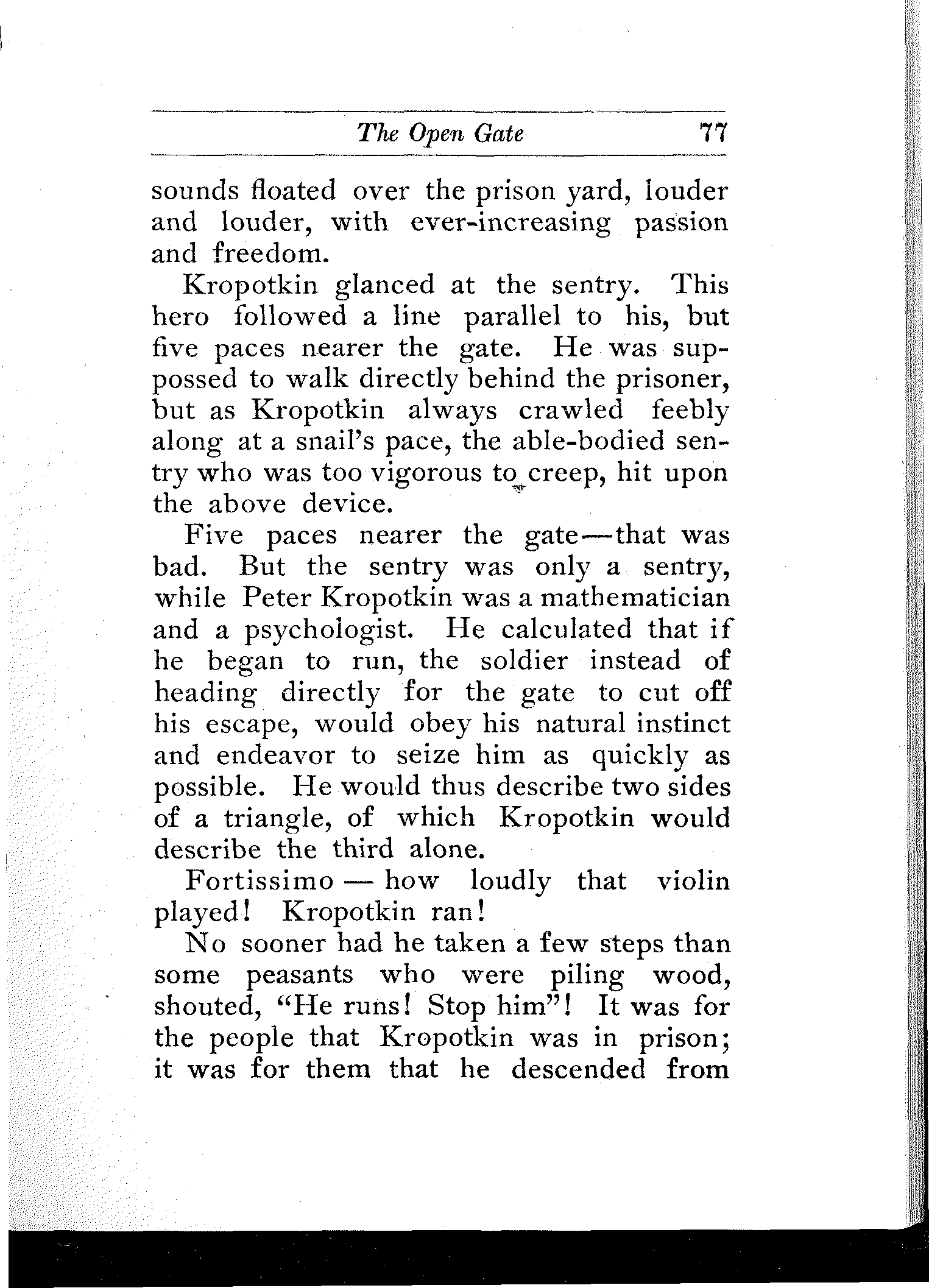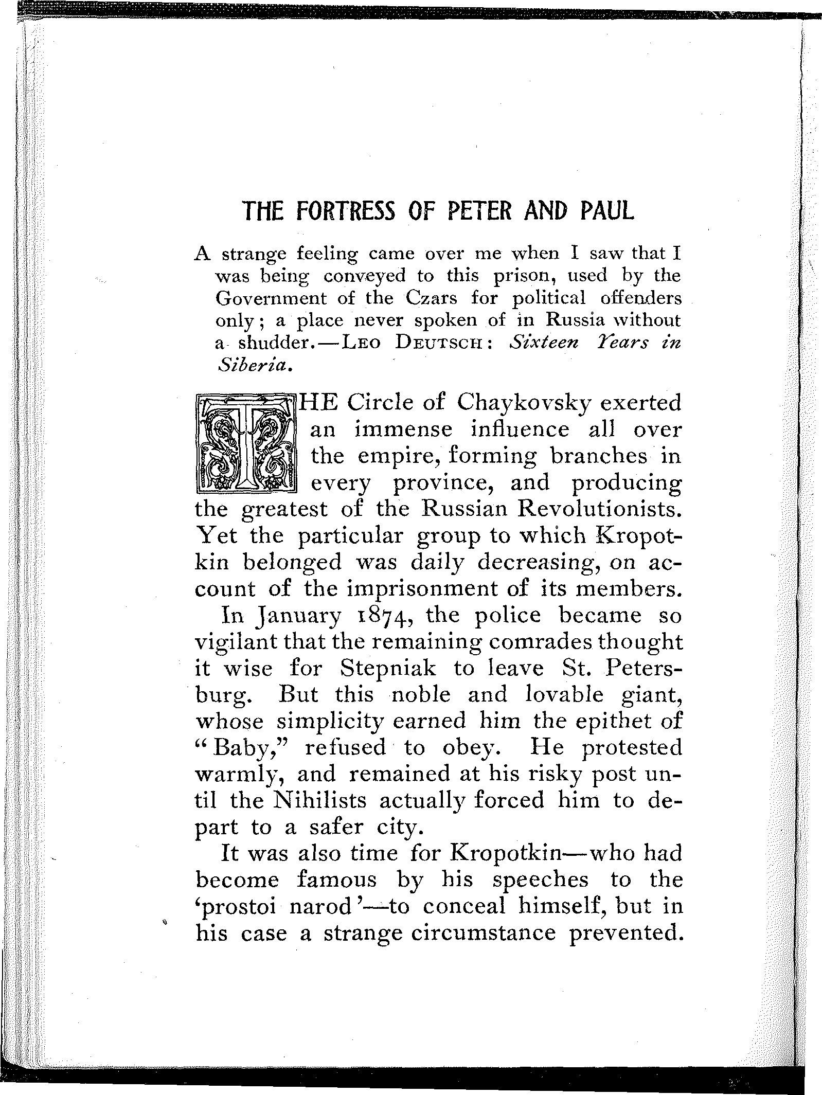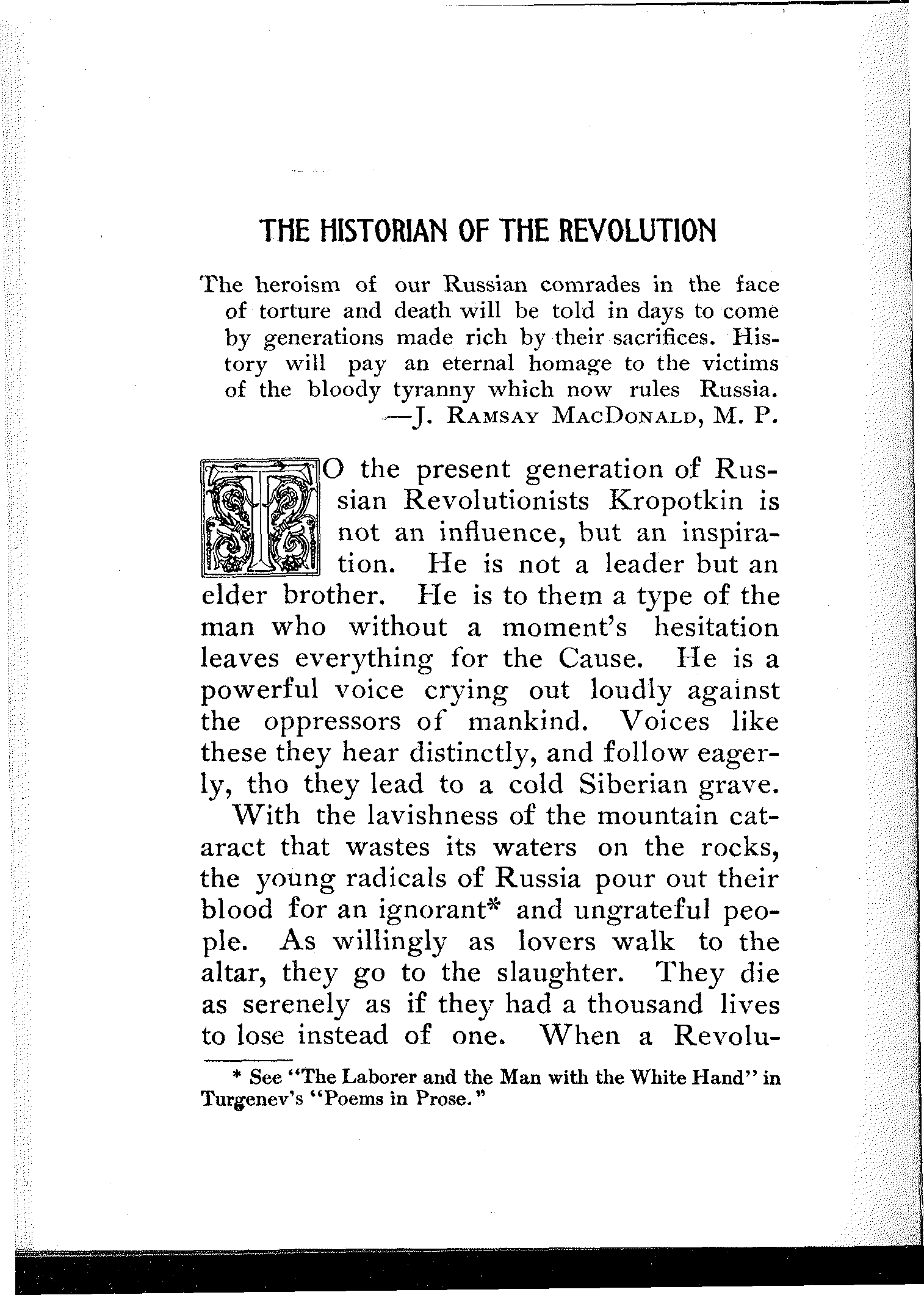 During the sixth year of the reign of Alexander II., a servant dashed wildly into Peter Kropotkin's room. It was early in the morning, and Kropotkin was still in bed. But the servant brandished the tea tray and babbled excitedly, "Prince, freedom! The manifesto is posted on the Gostinoi Dvor." In a moment Kropotkin was dressed and began to run out. Just then a friend came running in. "Kropotkin, freedom!" he shouted, "Here is the manifesto!"