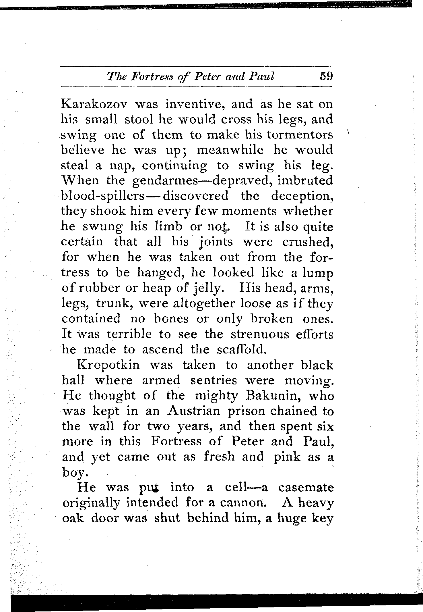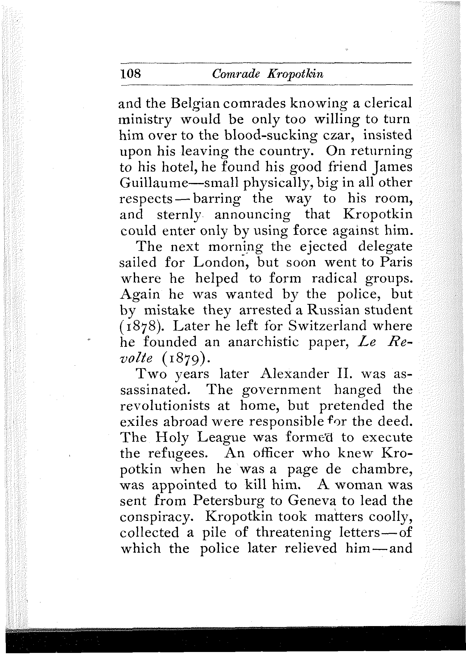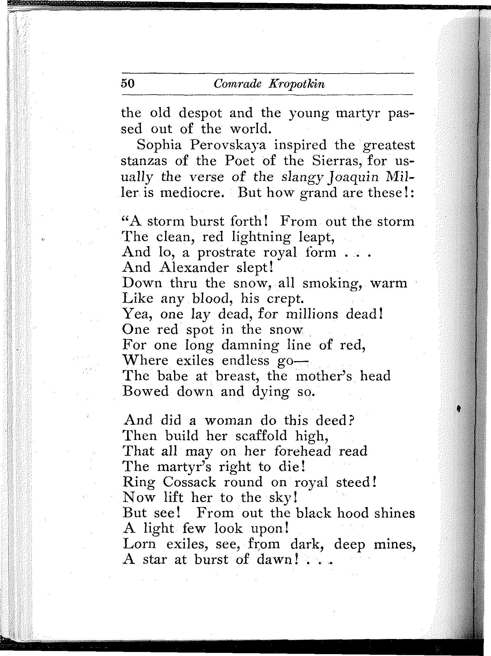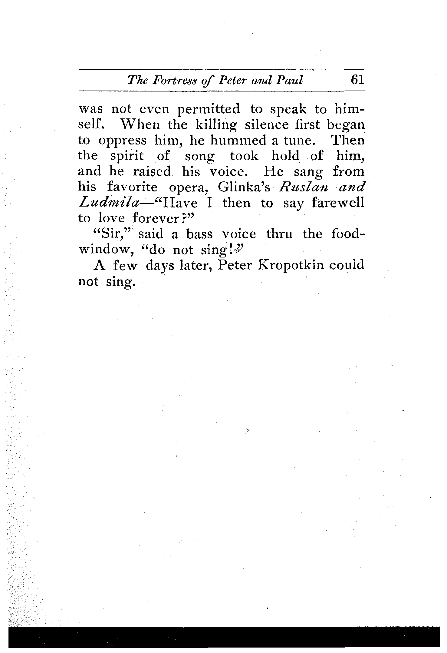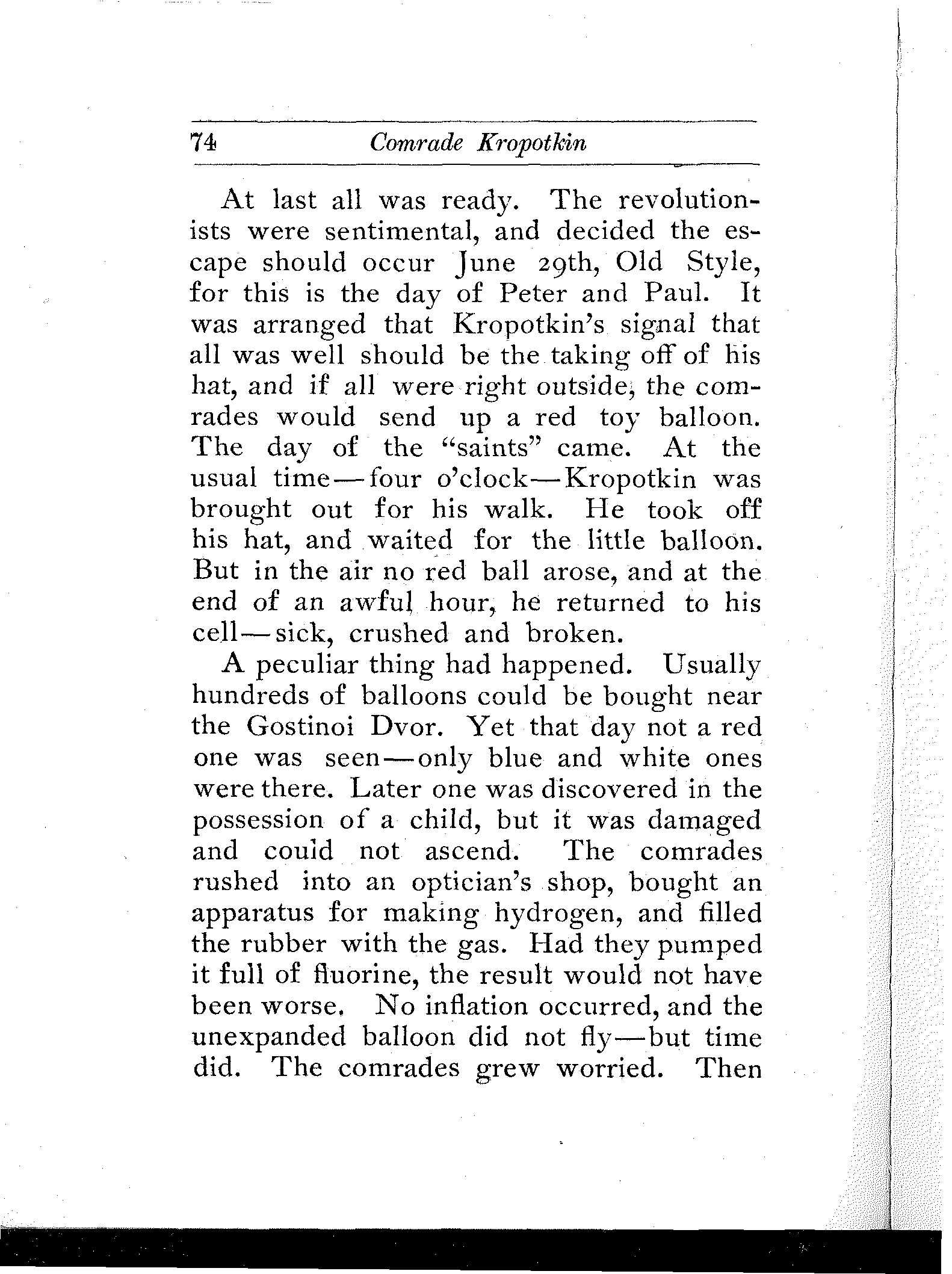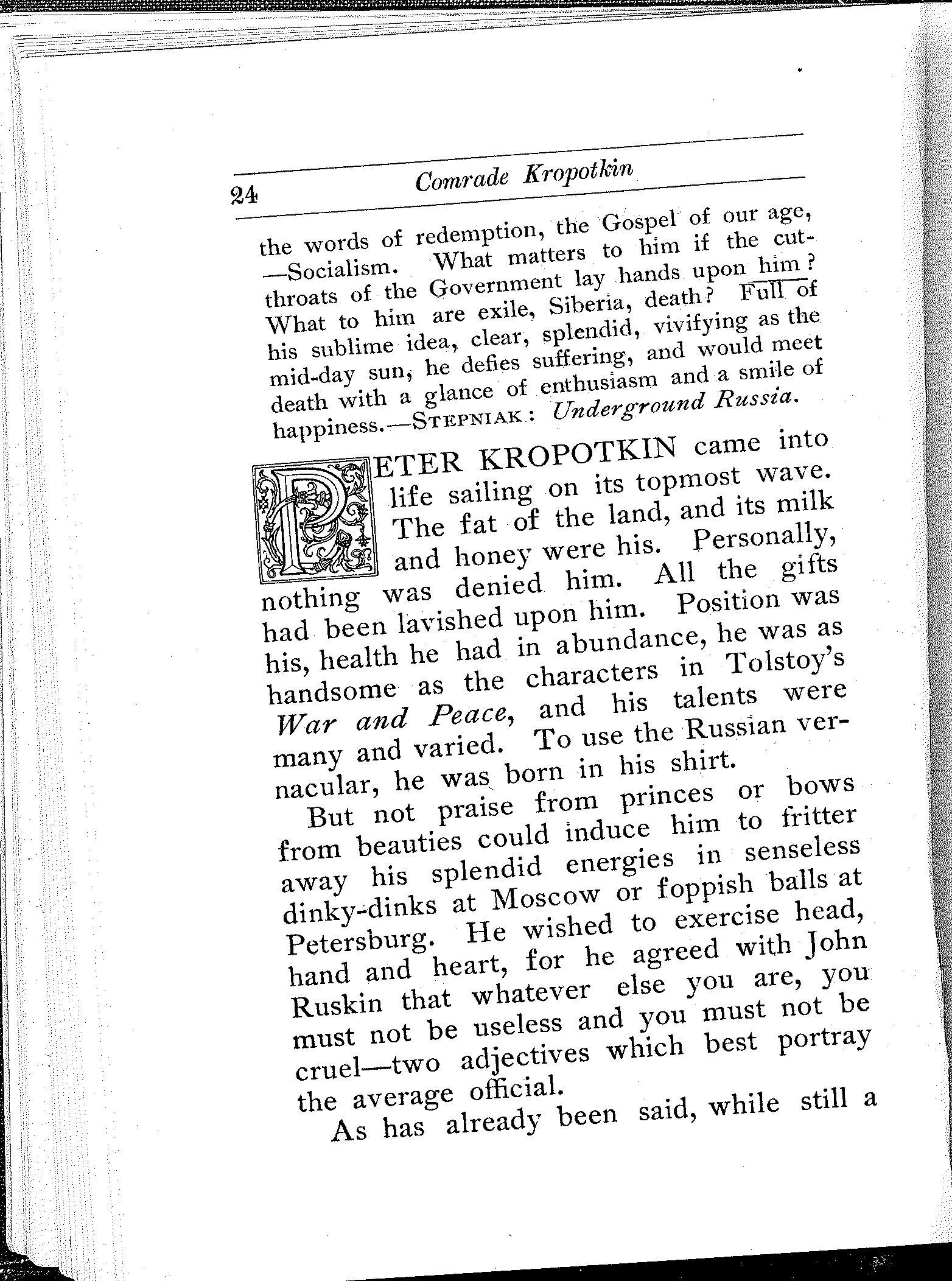 During the sixth year of the reign of Alexander II., a servant dashed wildly into Peter Kropotkin's room. It was early in the morning, and Kropotkin was still in bed. But the servant brandished the tea tray and babbled excitedly, "Prince, freedom! The manifesto is posted on the Gostinoi Dvor." In a moment Kropotkin was dressed and began to run out. Just then a friend came running in. "Kropotkin, freedom!" he shouted, "Here is the manifesto!"