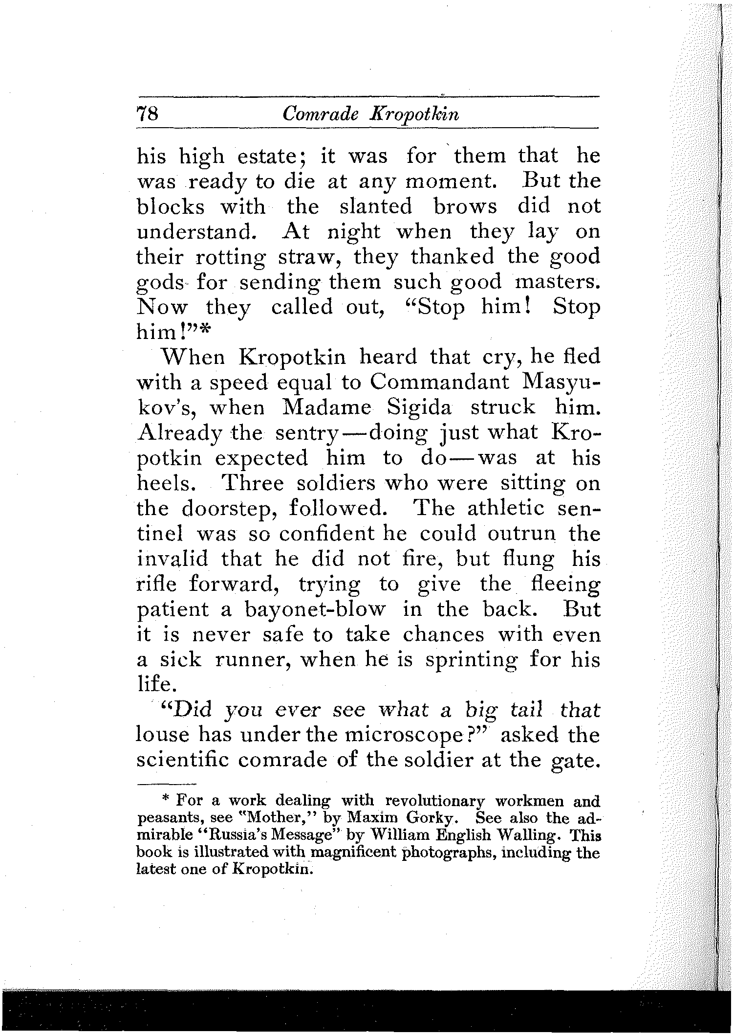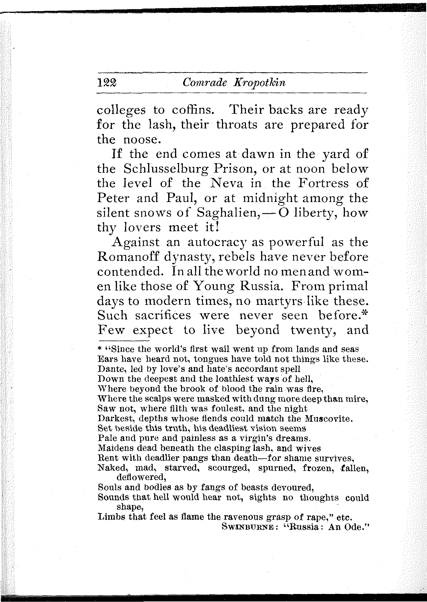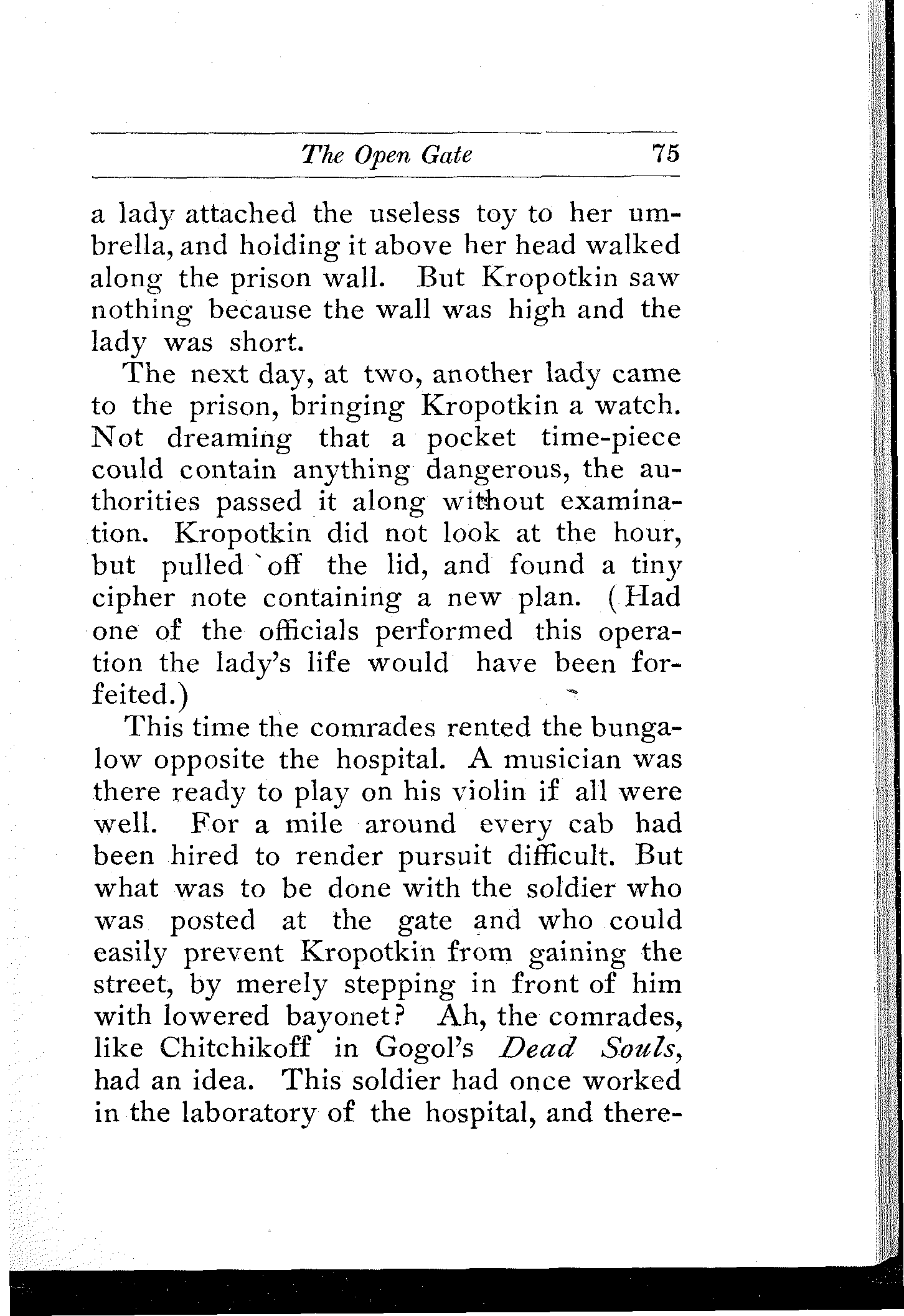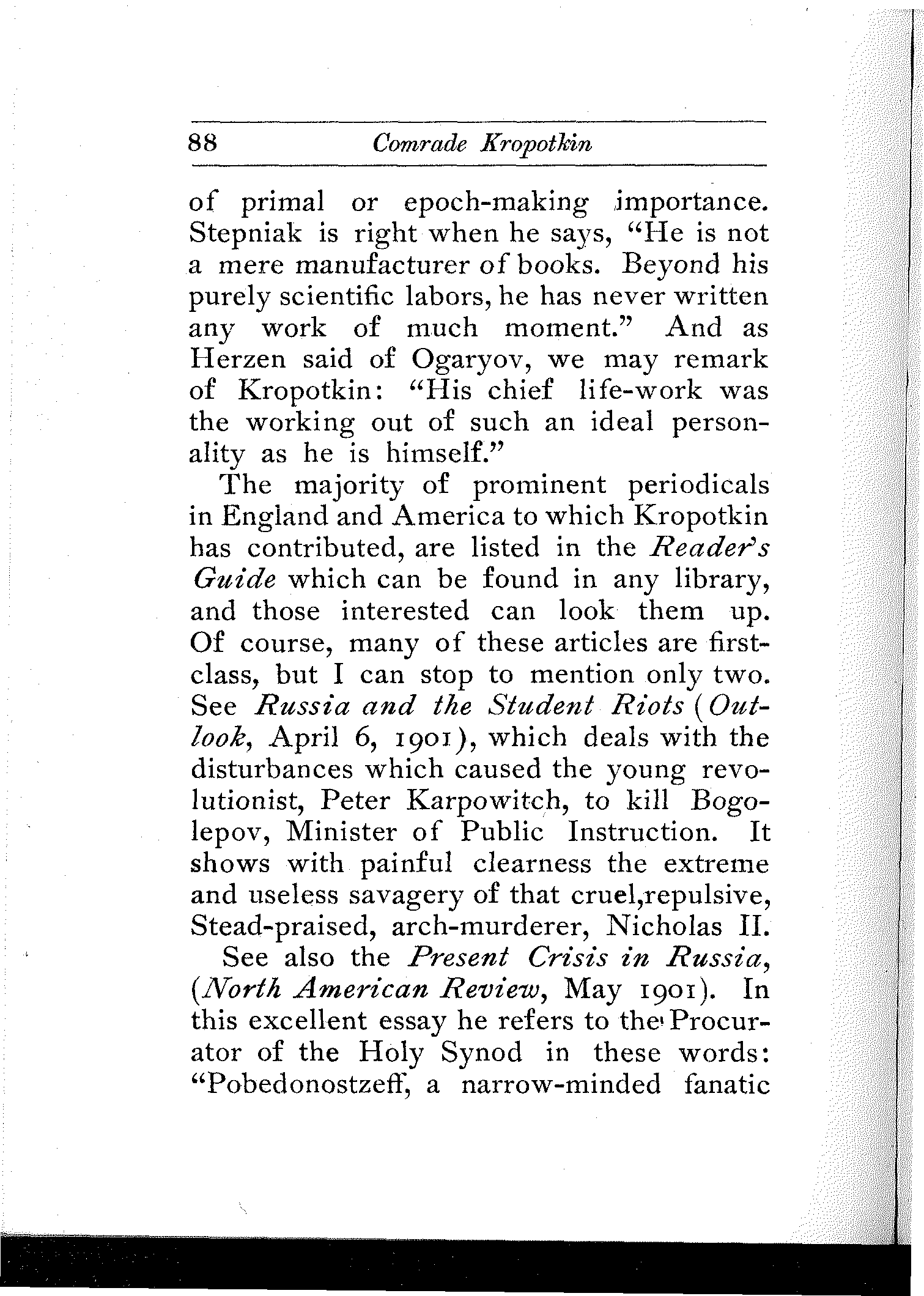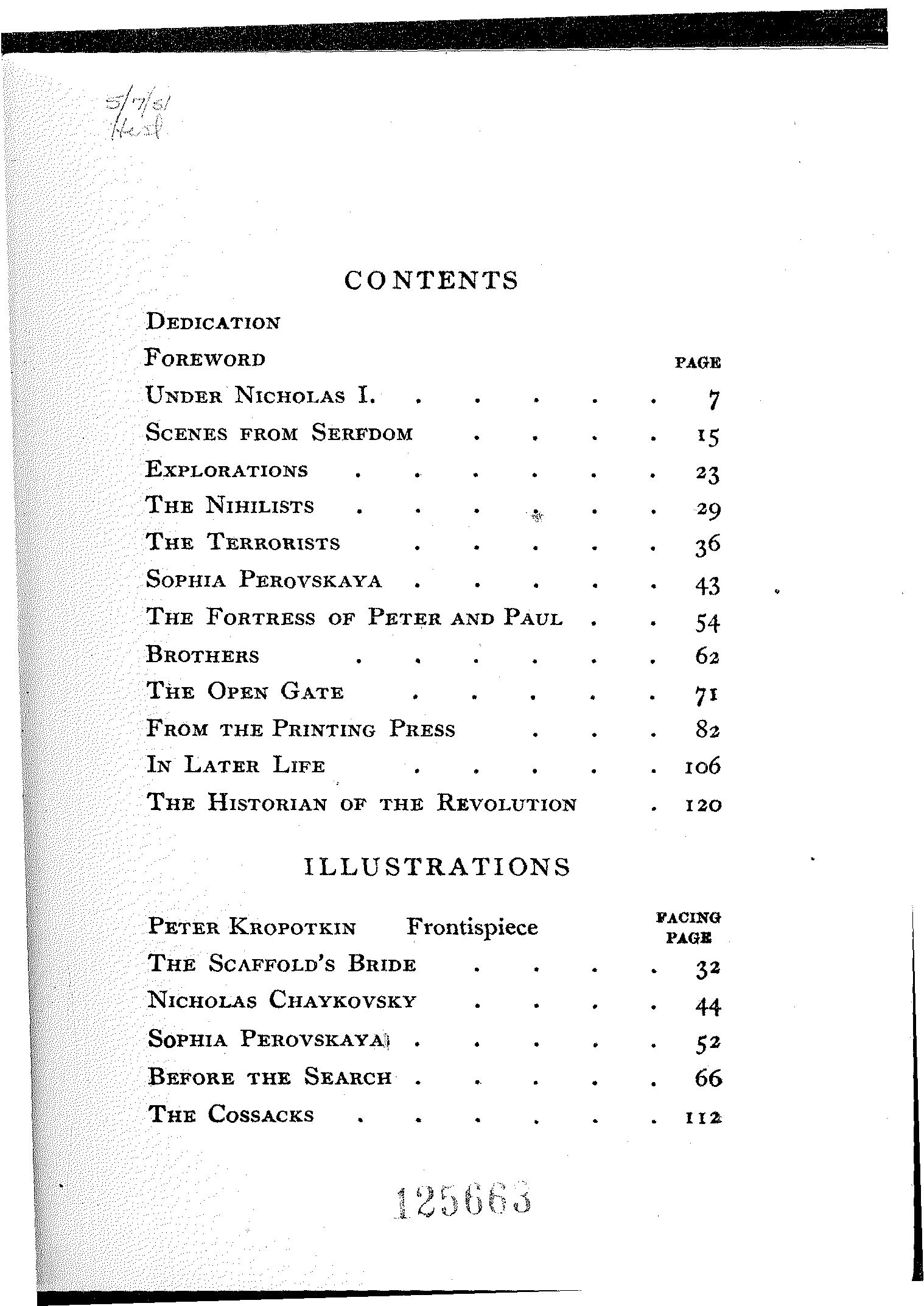 During the sixth year of the reign of Alexander II., a servant dashed wildly into Peter Kropotkin's room. It was early in the morning, and Kropotkin was still in bed. But the servant brandished the tea tray and babbled excitedly, "Prince, freedom! The manifesto is posted on the Gostinoi Dvor." In a moment Kropotkin was dressed and began to run out. Just then a friend came running in. "Kropotkin, freedom!" he shouted, "Here is the manifesto!"