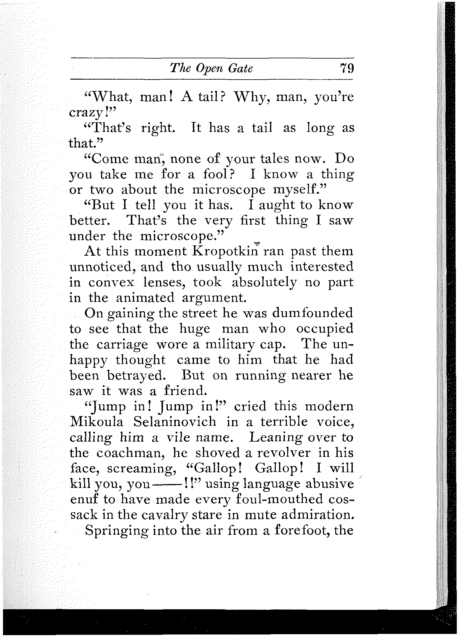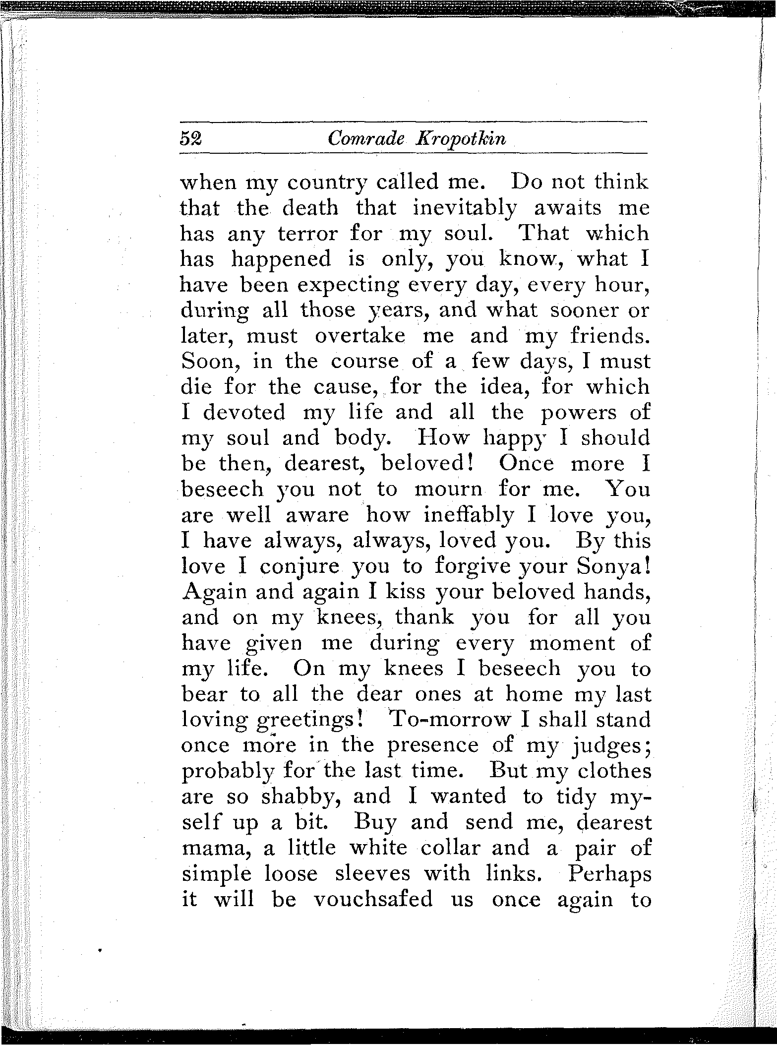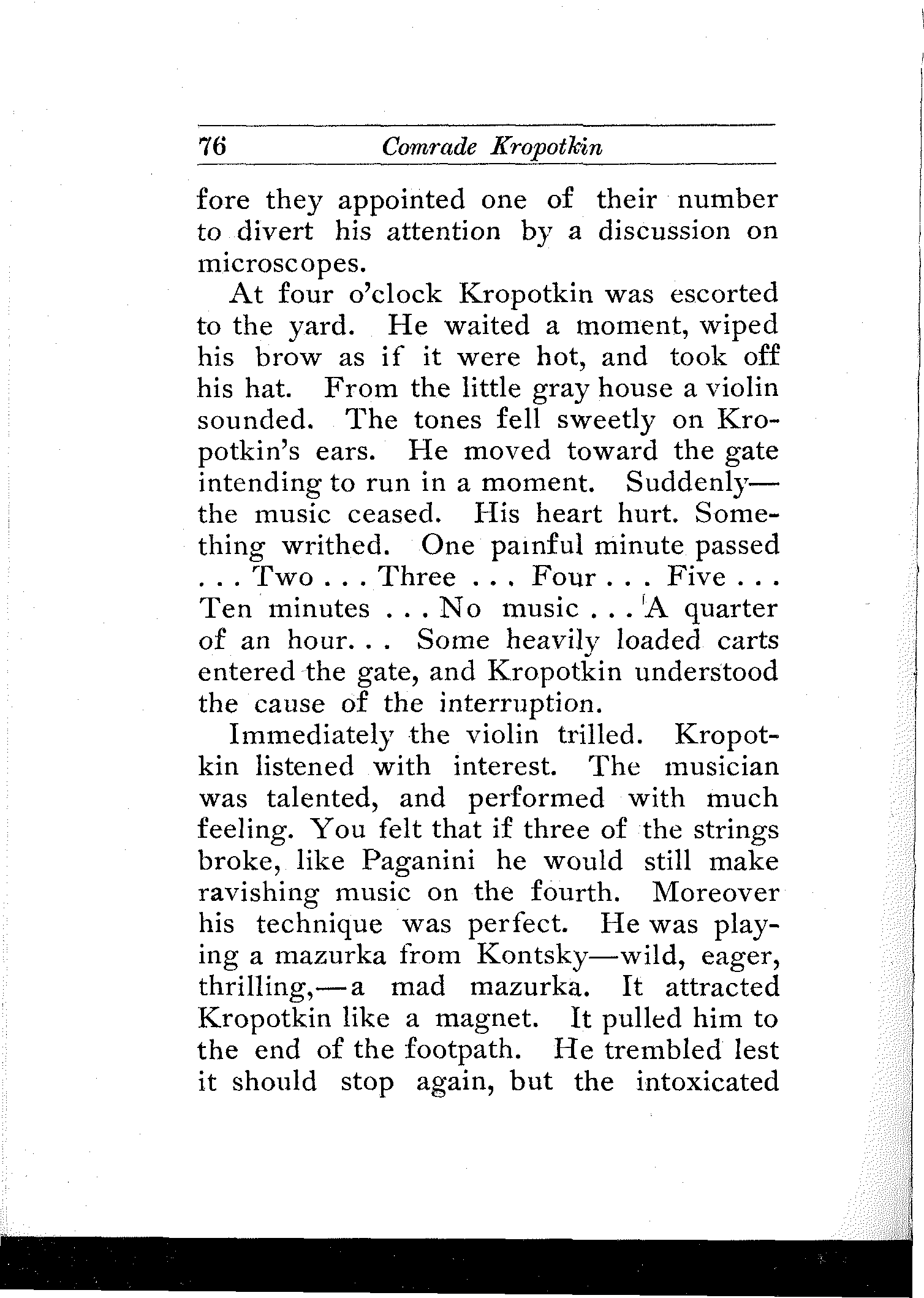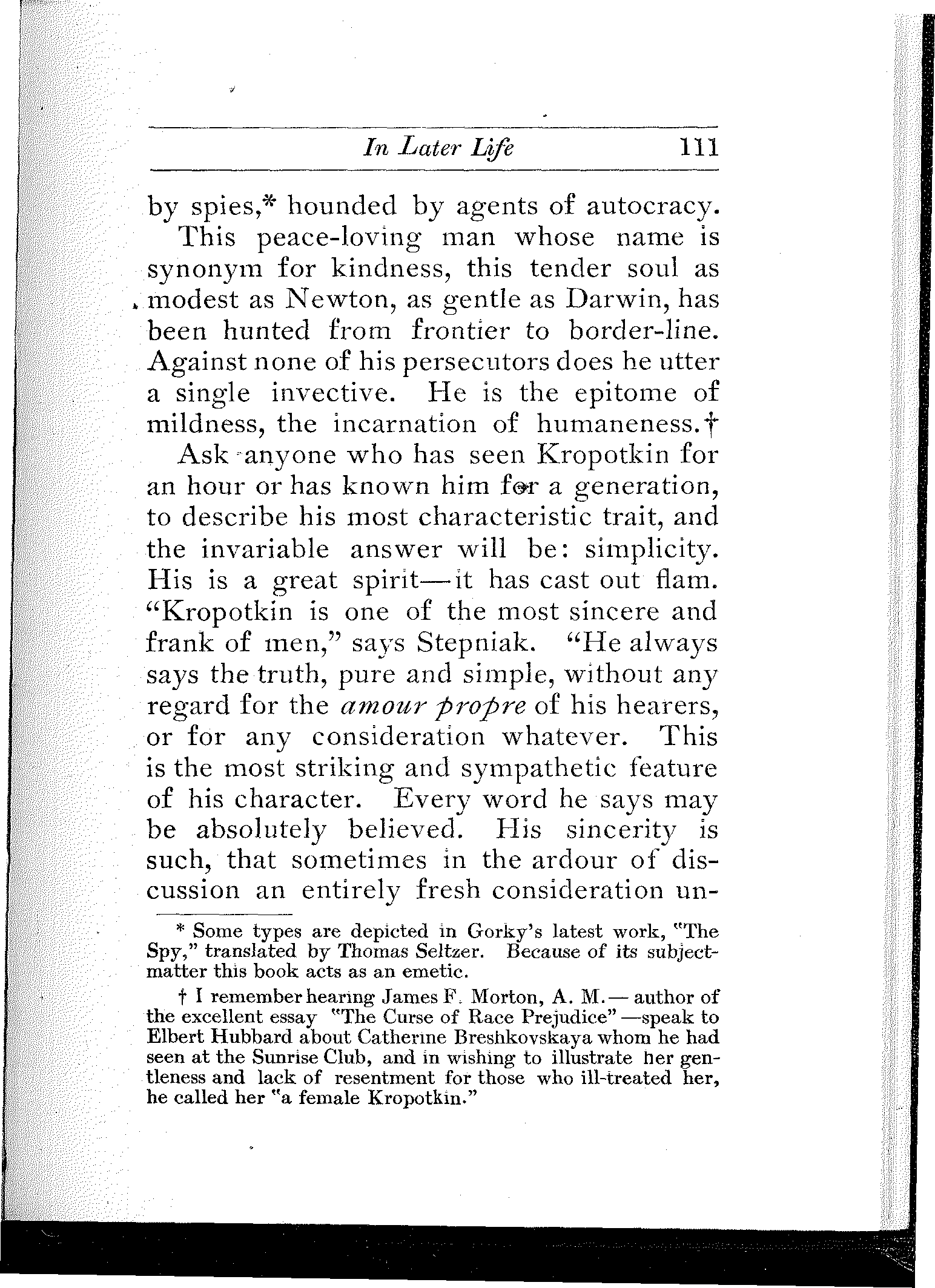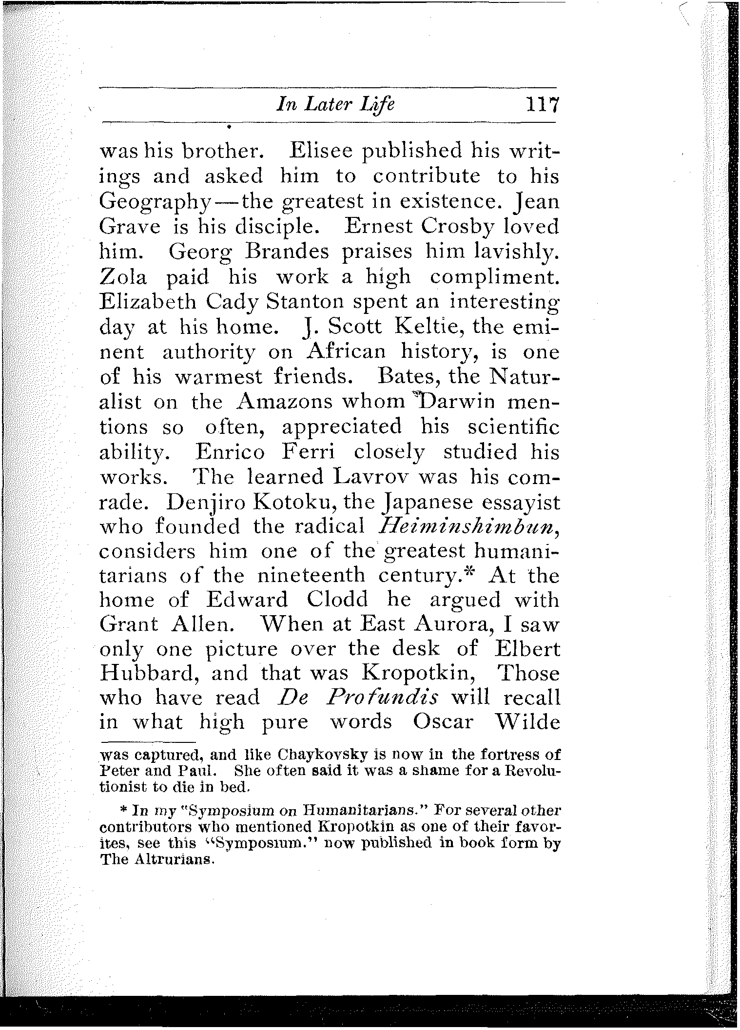 During the sixth year of the reign of Alexander II., a servant dashed wildly into Peter Kropotkin's room. It was early in the morning, and Kropotkin was still in bed. But the servant brandished the tea tray and babbled excitedly, "Prince, freedom! The manifesto is posted on the Gostinoi Dvor." In a moment Kropotkin was dressed and began to run out. Just then a friend came running in. "Kropotkin, freedom!" he shouted, "Here is the manifesto!"