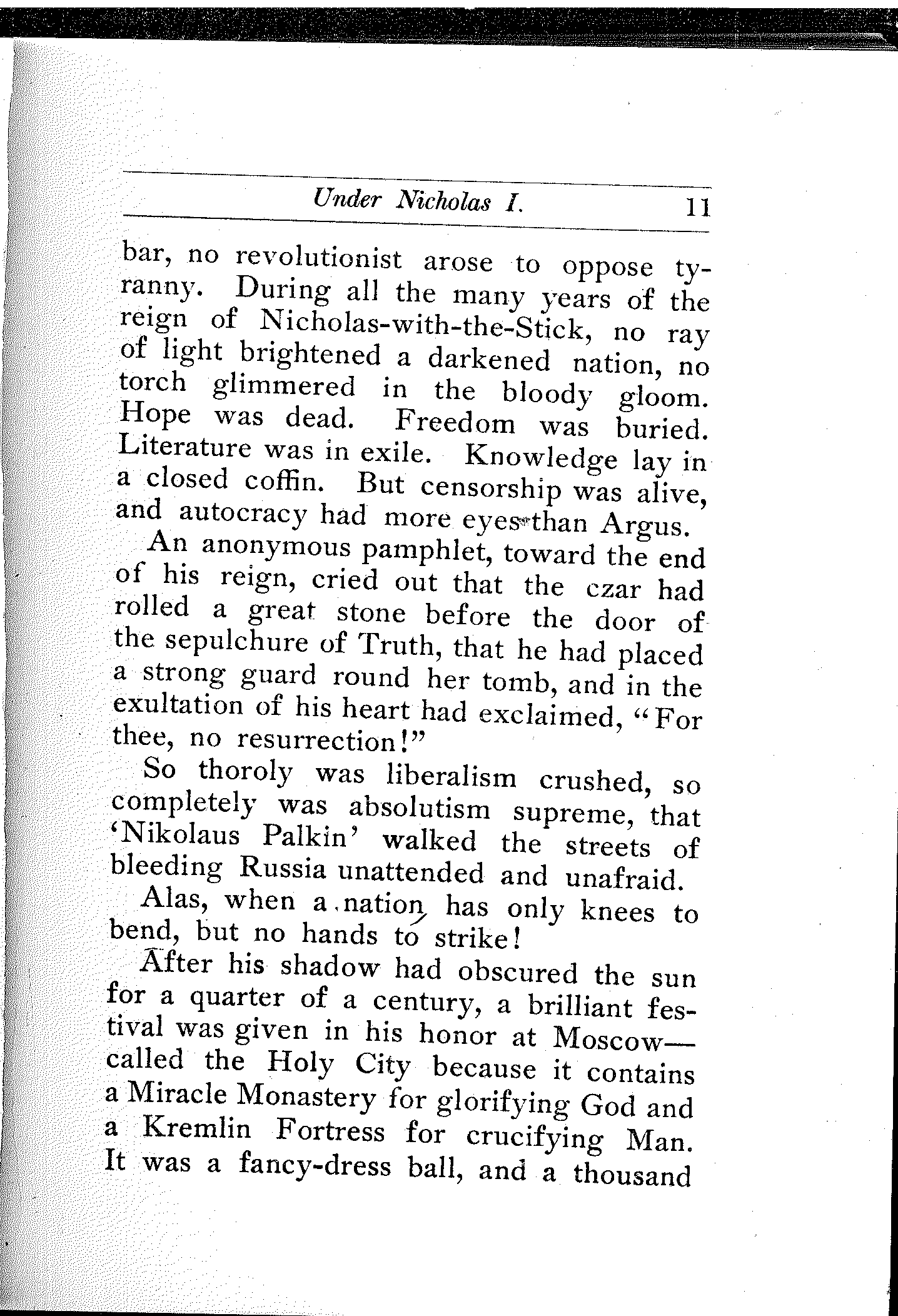 So thoroly was liberalism crushed, so completely was absolutism supreme, that 'Nikolaus Palkin' walked the streets of bleeding Russia unattended and unafraid.