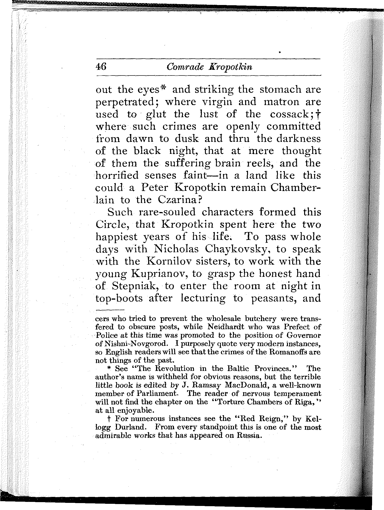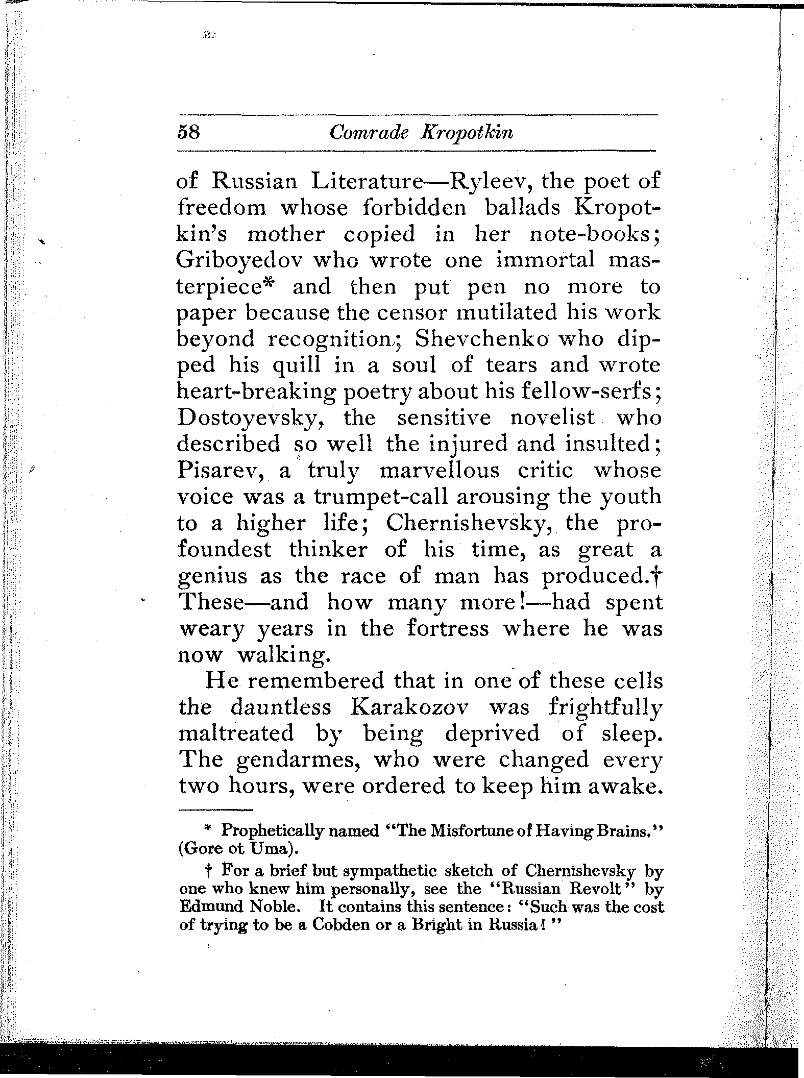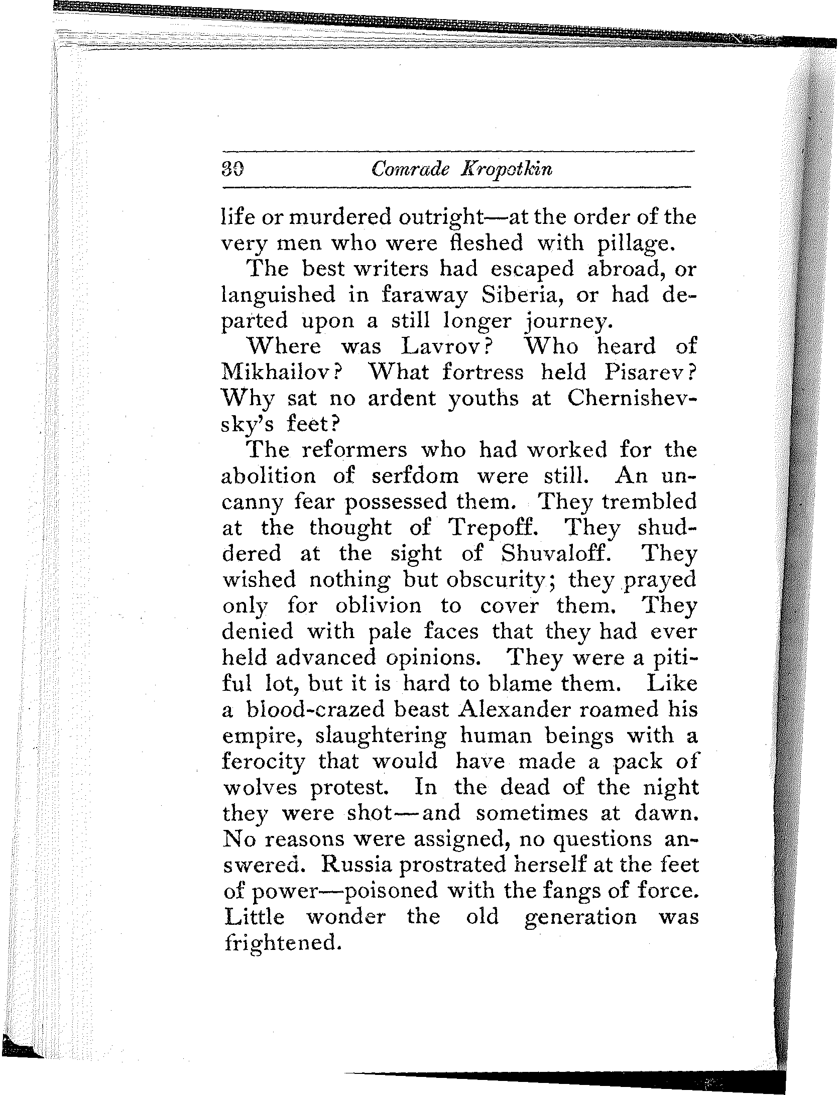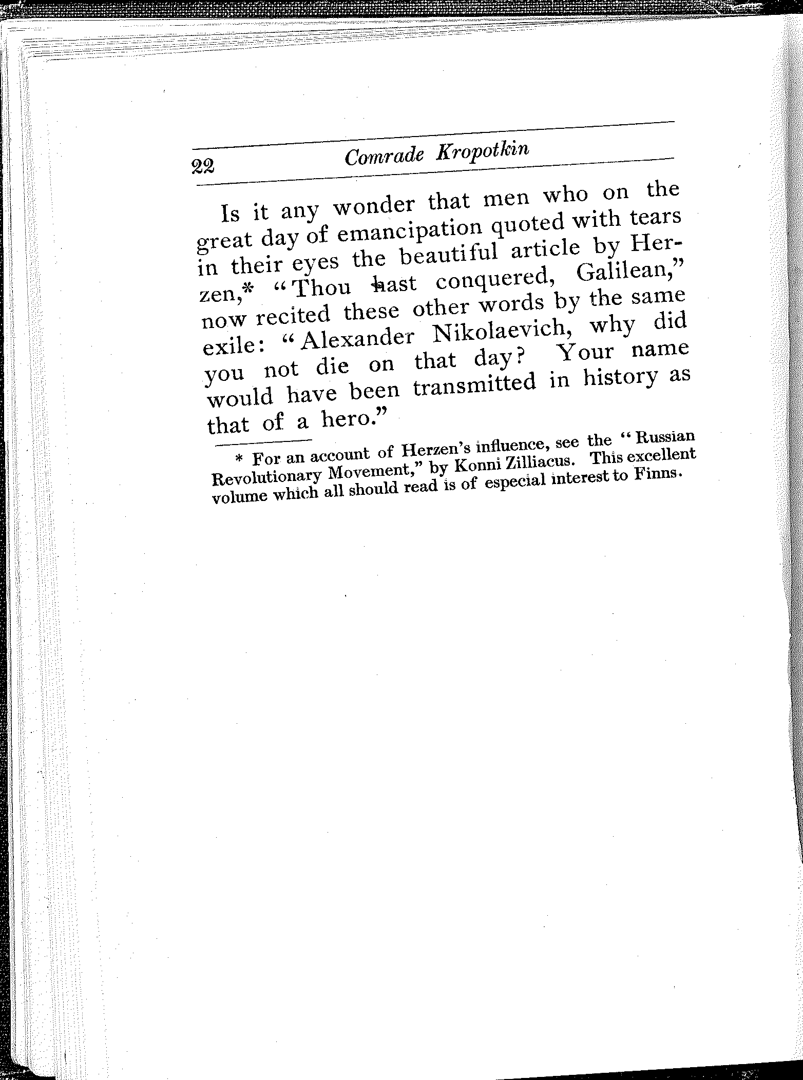 Kropotkin read it. His eyes beamed. He stamped his feet. O happy day! No more slavery—serfdom was abolished—the muzhiks were free. Not the dark ghosts of reaction, but the luminous sons of light had triumphed. Not Shuvaloff, Muravioff,[19] and Trepoff, but Herzen, Turgenev and Chernishevsky.[7]