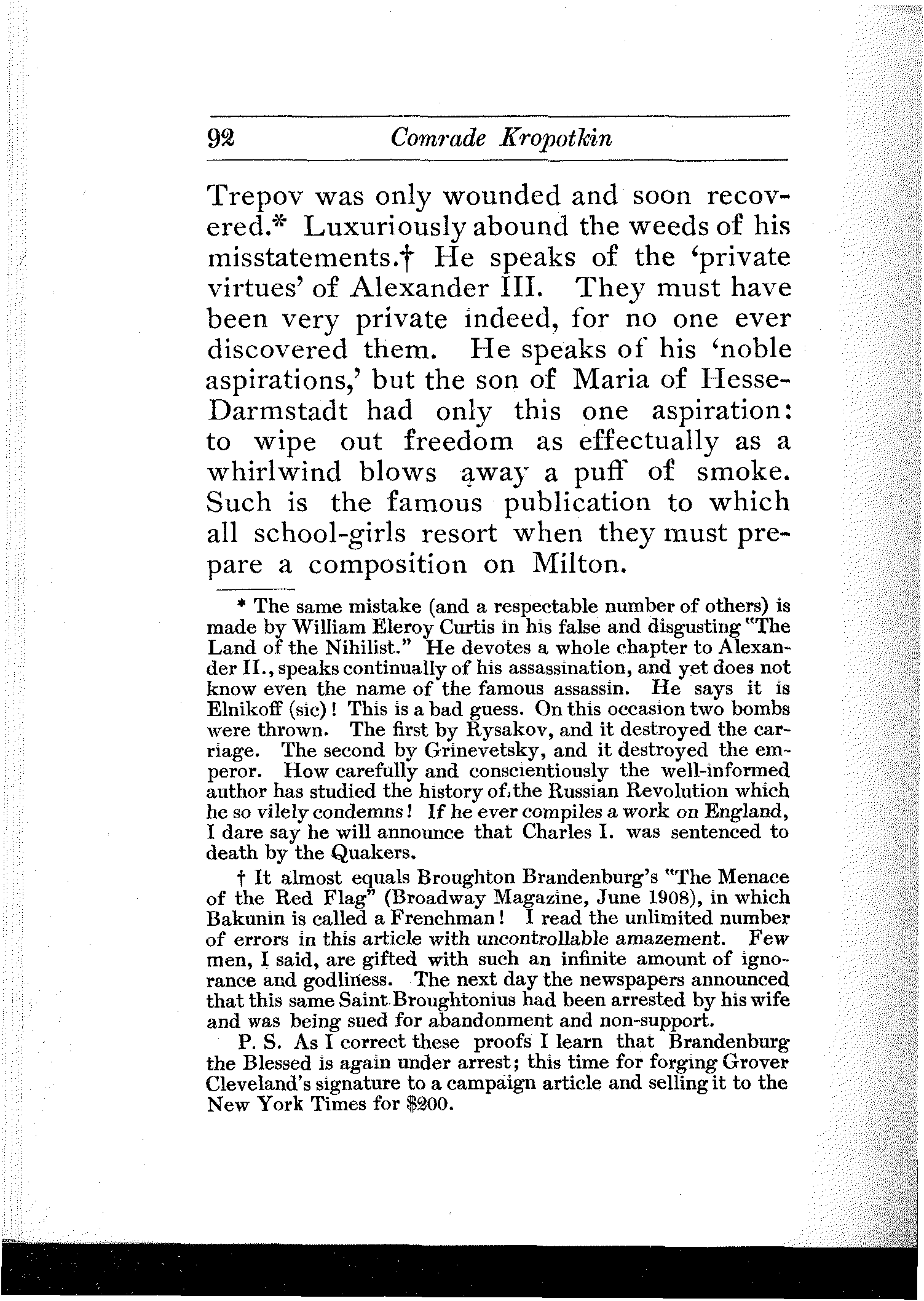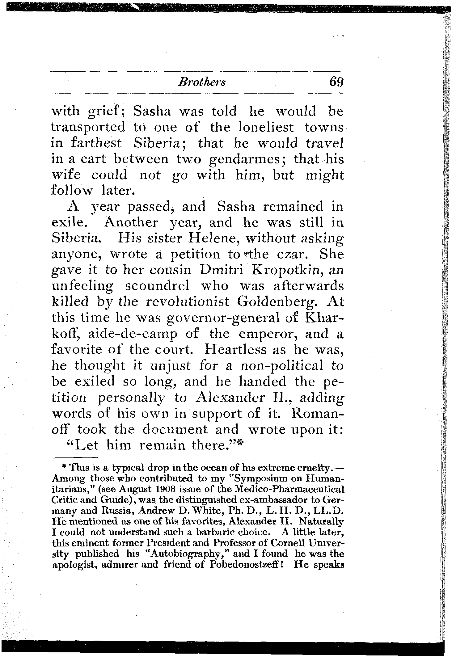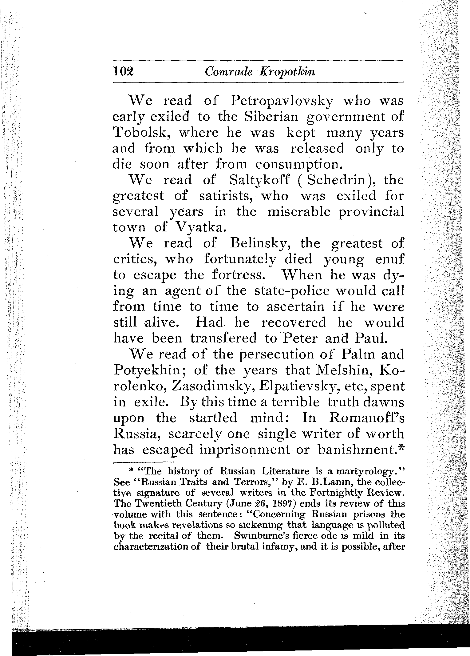 Kropotkin read it. His eyes beamed. He stamped his feet. O happy day! No more slavery—serfdom was abolished—the muzhiks were free. Not the dark ghosts of reaction, but the luminous sons of light had triumphed. Not Shuvaloff, Muravioff,[19] and Trepoff, but Herzen, Turgenev and Chernishevsky.[7]