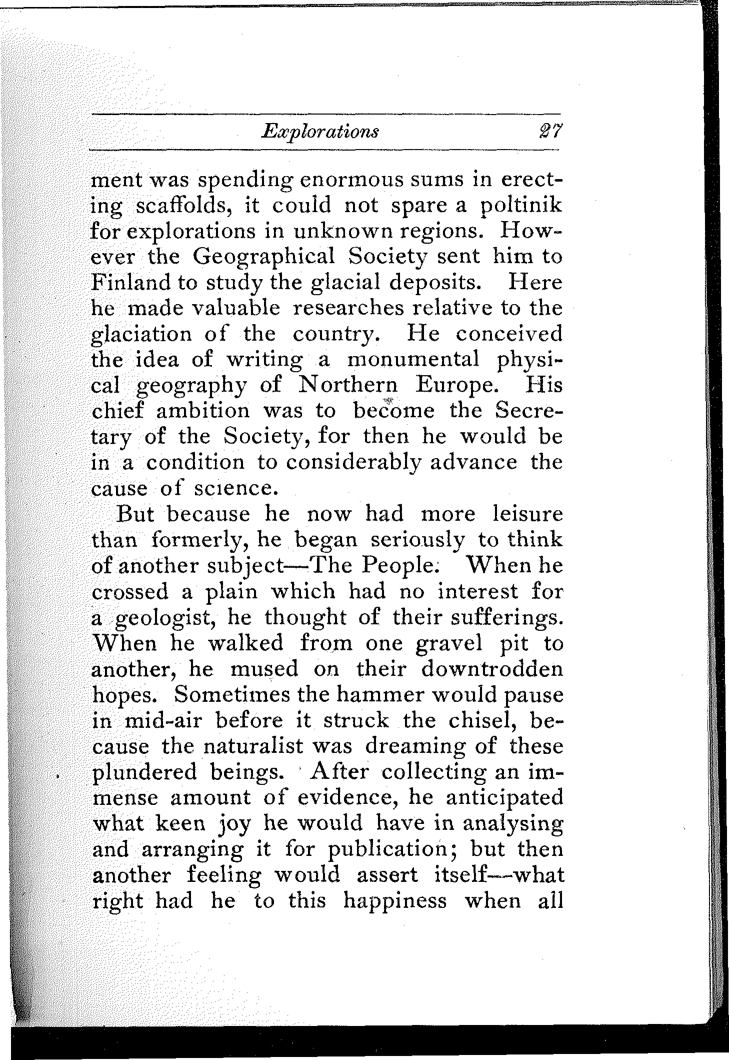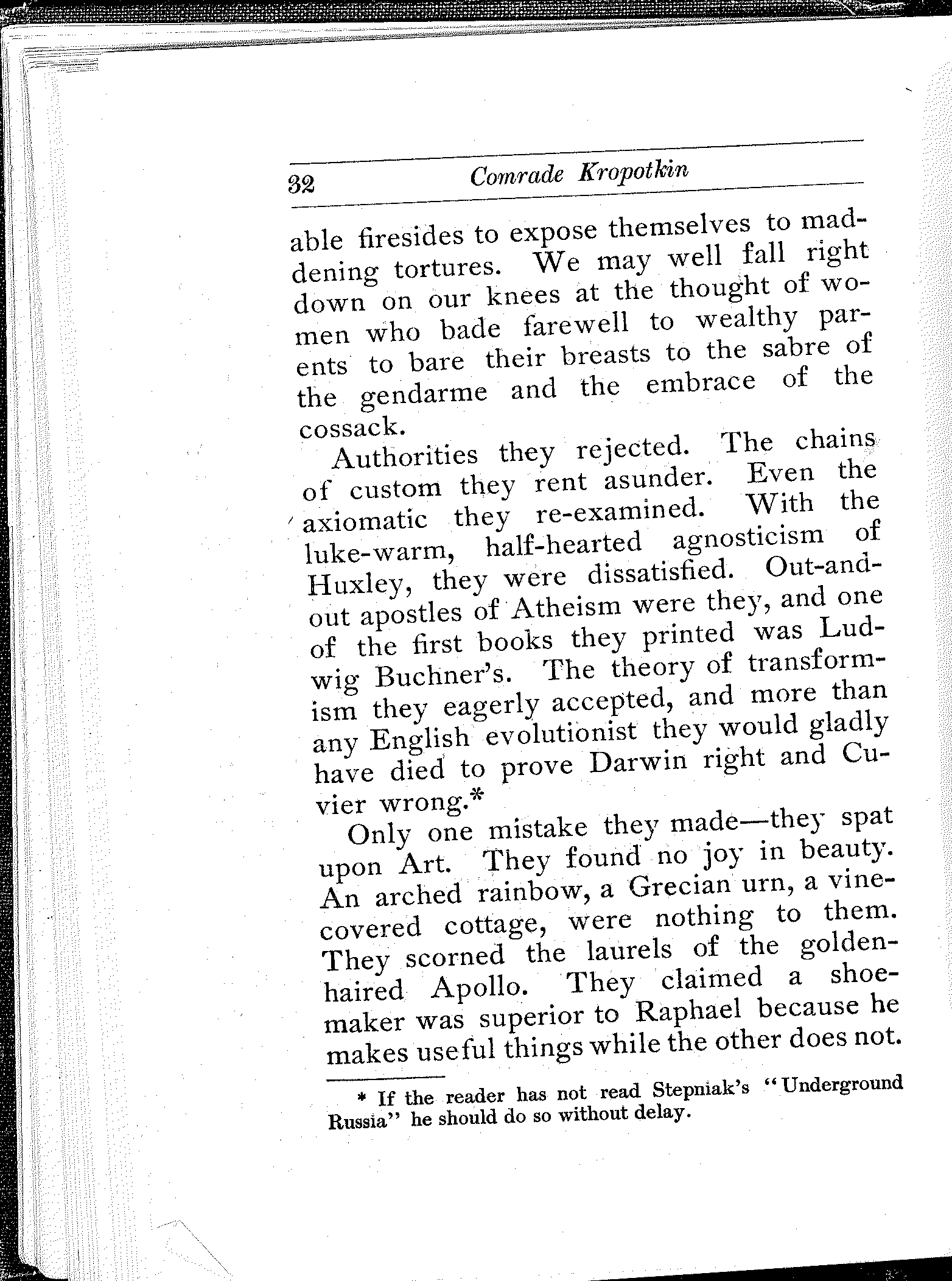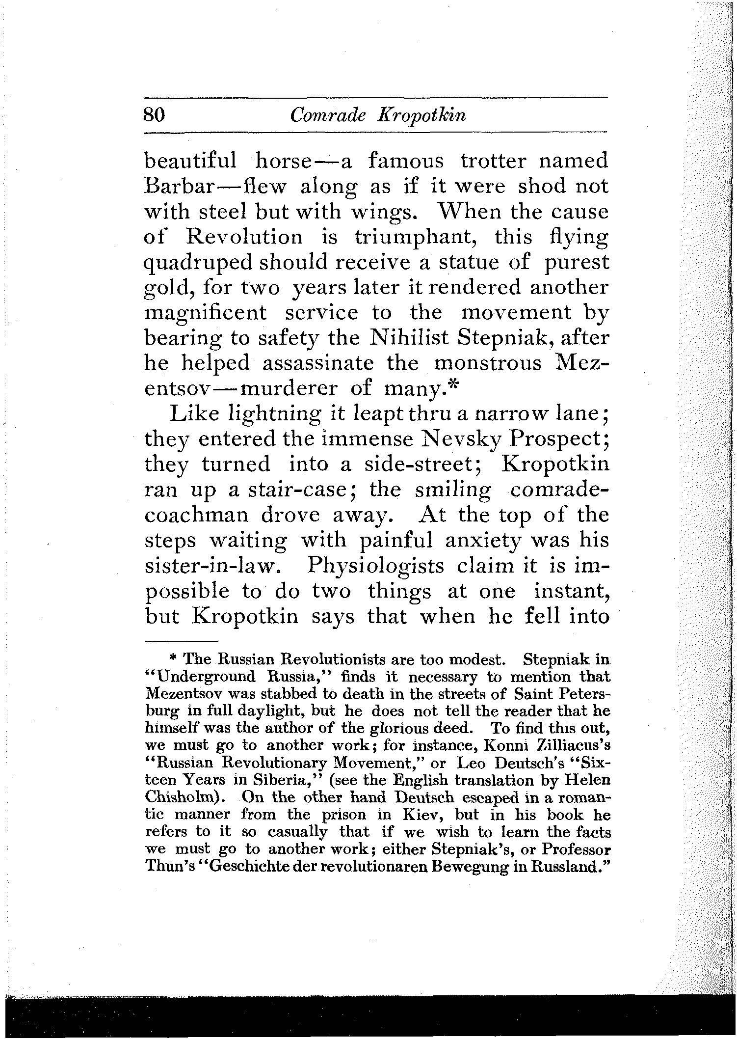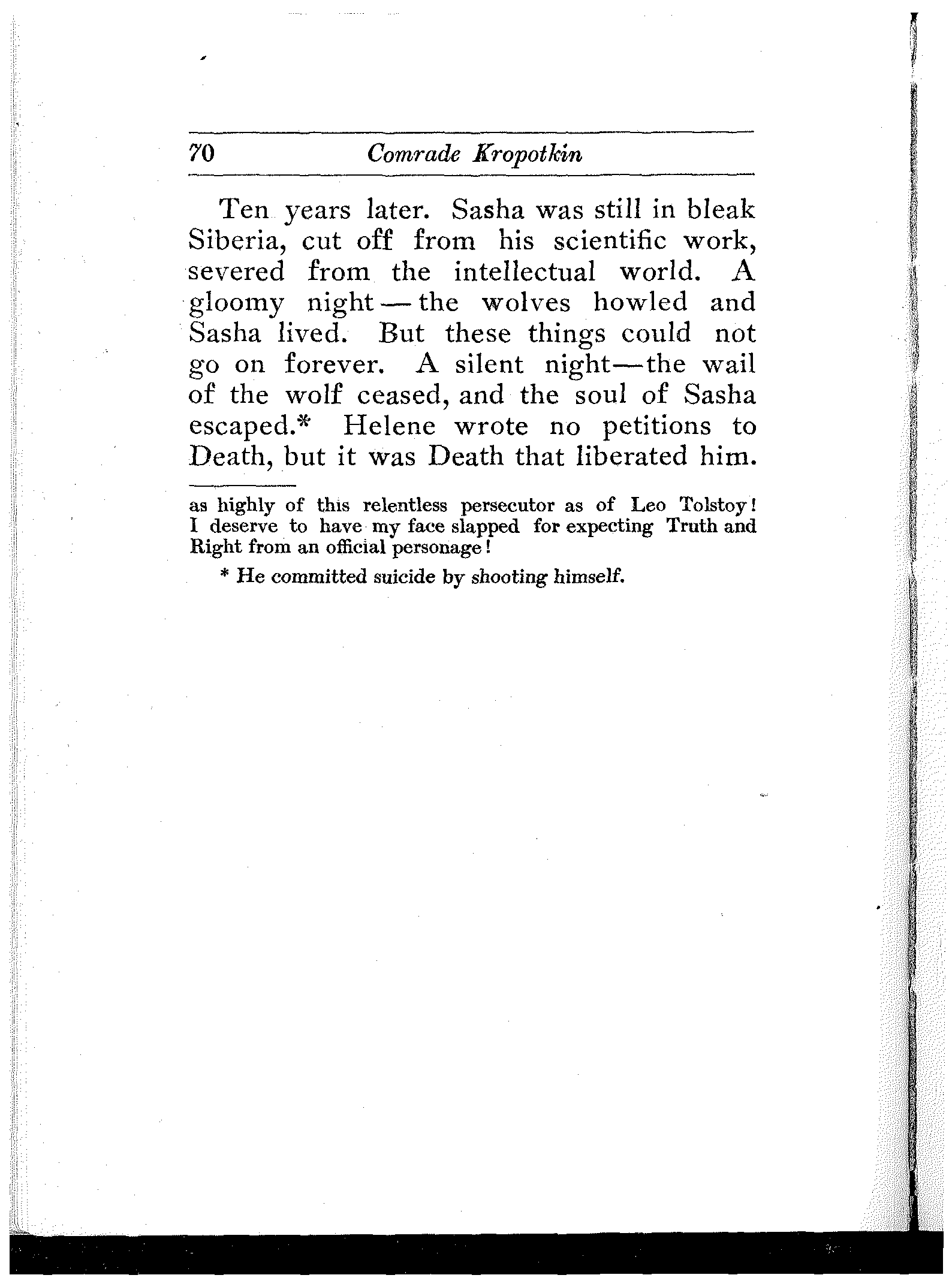 Kropotkin read it. His eyes beamed. He stamped his feet. O happy day! No more slavery—serfdom was abolished—the muzhiks were free. Not the dark ghosts of reaction, but the luminous sons of light had triumphed. Not Shuvaloff, Muravioff,[19] and Trepoff, but Herzen, Turgenev and Chernishevsky.[7]