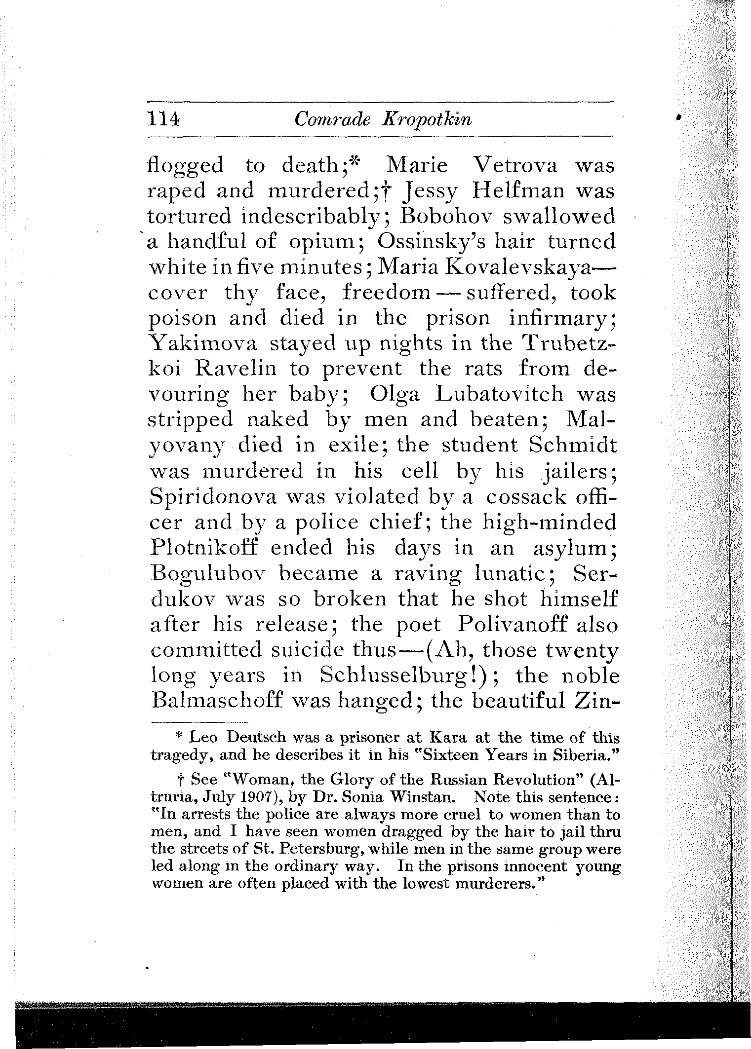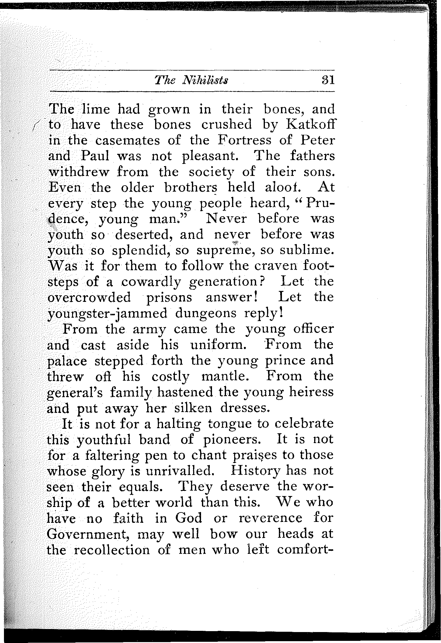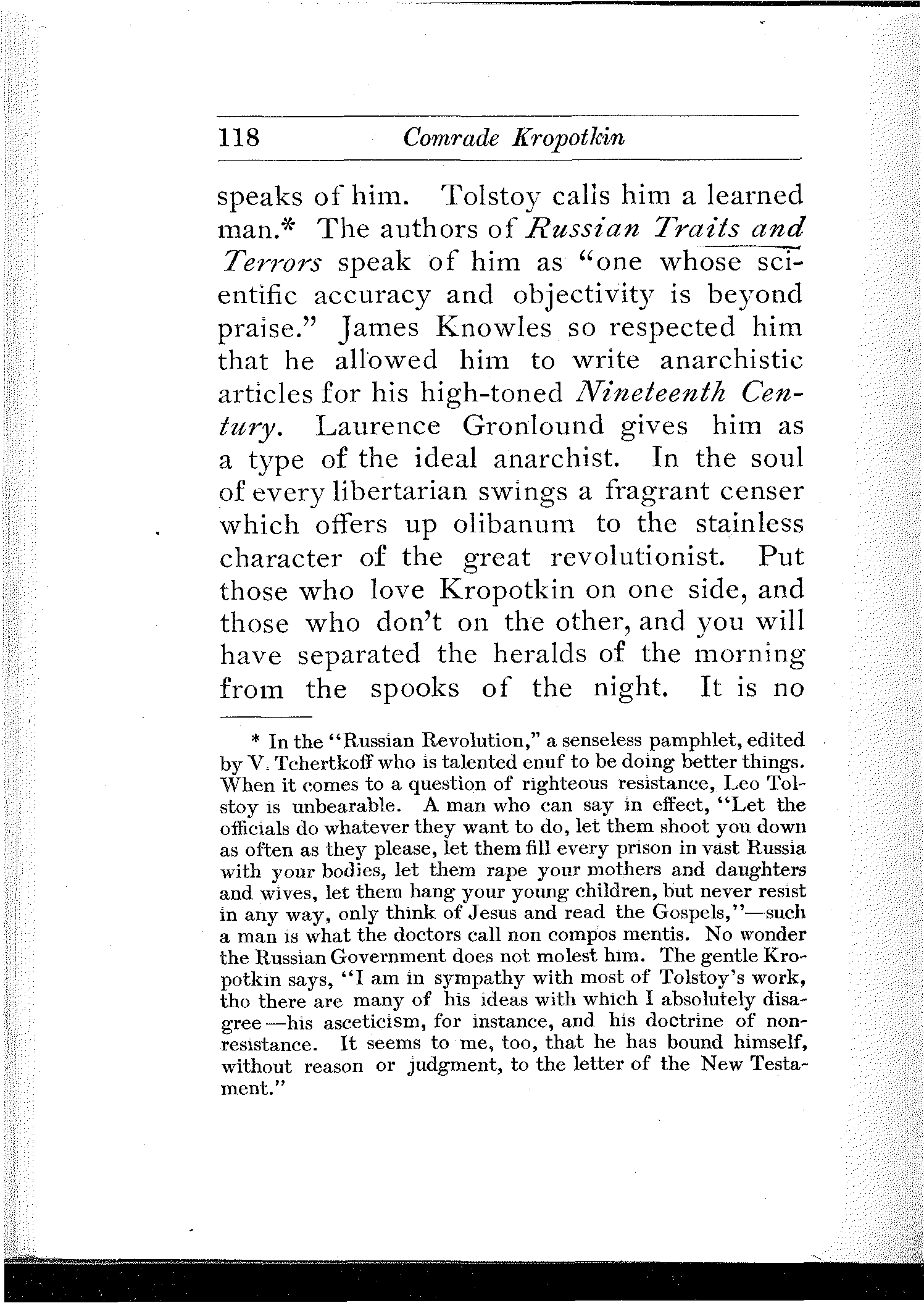 A remarkable commentary on the conditions in Russia is the fact that he who studies them carefully and thoroly, be he the gentlest and sweetest youth who would not harm a fly or tread on a worm, becomes saturated with the conviction that in Russia, the rebel's bomb and pistol and dagger are not only legitimate and necessary, but even noble weapons of defense and offense.