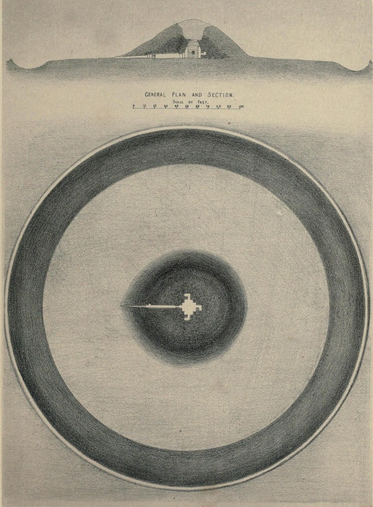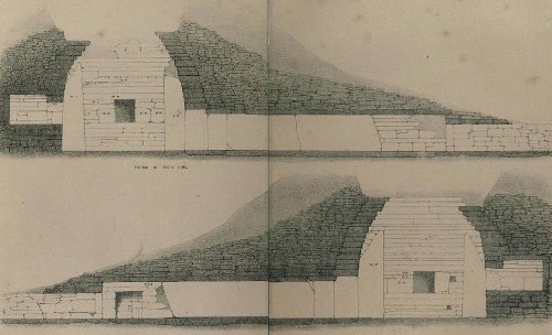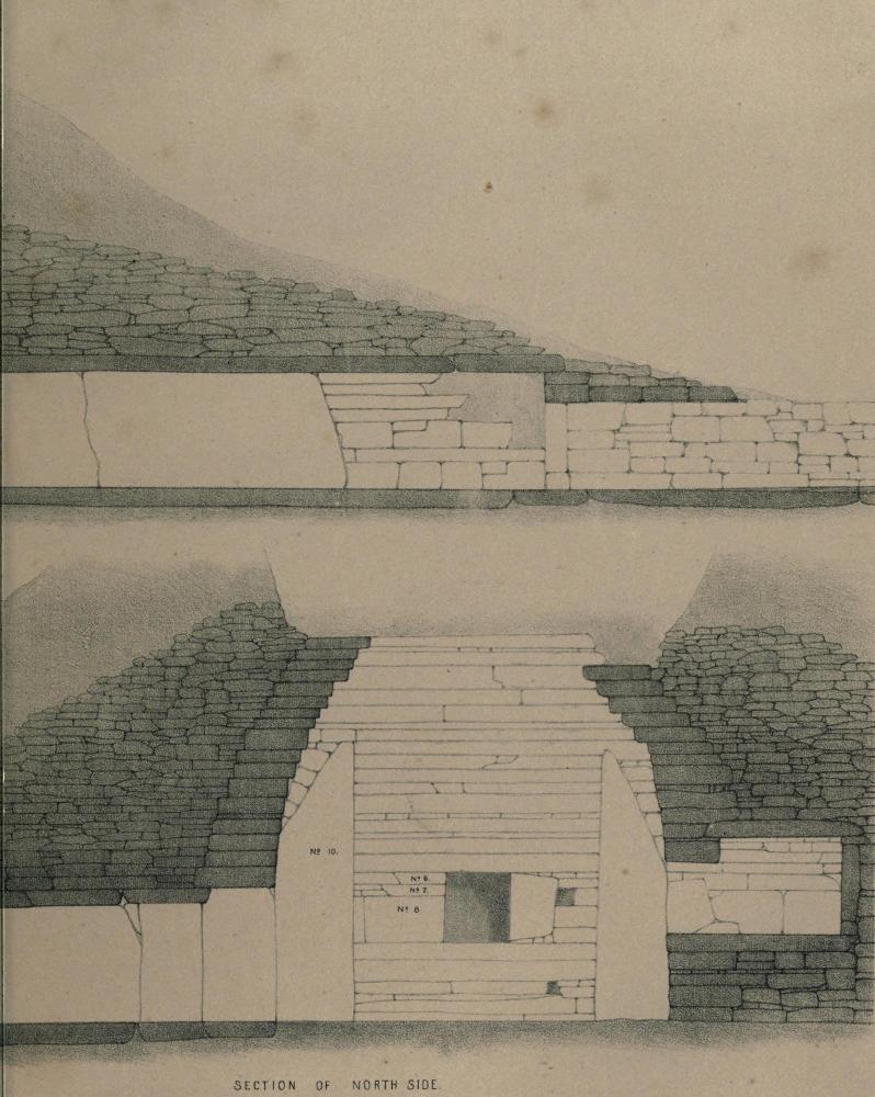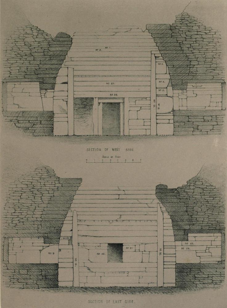 On Monday the 8th of July, a number of men under the superintendance of Alexander Johnson, Mr. Wilson’s foreman—a most active and intelligent fellow—proceeded with the work that had been commenced on the previous Saturday, and before evening discovered a passage on the west side, which afterwards proved to be the entrance into the interior of the tumulus. This passage was covered over with large flag-stones, one of which having been with some difficulty upraised, we effected an entrance, but found a considerable accumulation of earth and stones, which was removed on the following day, and Mr. Wilson, after careful examination, in which his engineering experience was of the highest importance, agreed to my suggestion that the excavation should be proceeded with from the centre of the hillock.