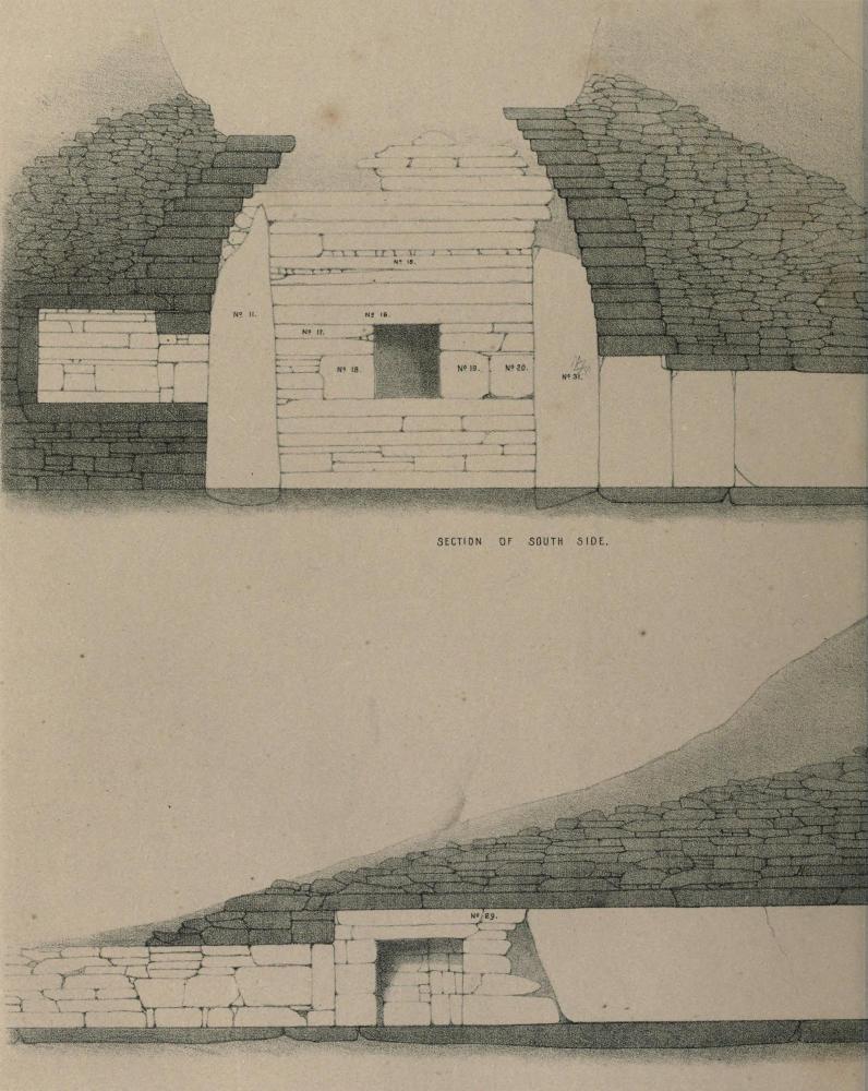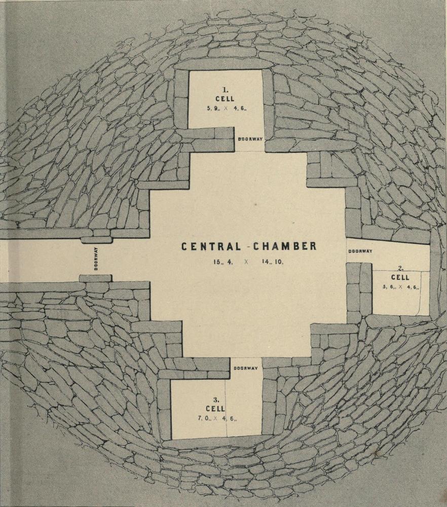 [Pg 15]The chamber when cleared out proved to be about 15 feet square on the level of the floor, and 13 feet in height, to the top of the present walls. Immediately opposite to the passage is an opening in the wall 3 feet from the floor. This is the entrance to a cell or small chamber in the wall, 5 feet 8 inches long, 4½ feet wide, and 3½ high. A large flagstone is laid as a raised floor between the entrance and the inner end of the chamber. The entrance is 2 feet wide, 2½ high, and 22½ inches long. On the two opposite walls of the chamber are similar openings in the walls. The one on the right is 2½ feet wide, 2 feet 9 inches high, and 1 foot 8 inches long. It gives admission to a cell 6 feet 10 inches long, 4 feet 7 inches wide, 3½ feet high, and has a raised flagstone floor, as in the other chamber. The opening on the left is 2¼ feet wide, 2½ high, and 1¾ long, and about 3 feet above the floor of the chamber. The cell of which this is the entrance is 5 feet 7 inches long, 4 feet 8 inches wide, and 3 feet 4 inches high. It has no raised floor like the two other cells. The roofs, floors, and back walls of the cells are each formed by a single slab of stone, and stones corresponding in size and shape to the openings in the walls were found on the floor in front of them. The natural inference is that they were originally the seals of the chambers in which the honoured dead reposed.