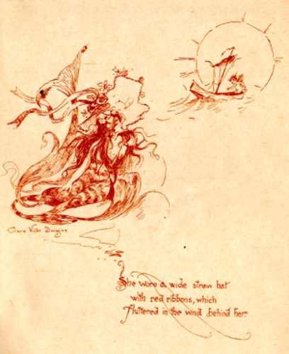 SHE WORE A WIDE STRAW HAT WITH RED RIBBONS, WHICH FLUTTERED IN THE WIND BEHIND HER