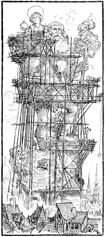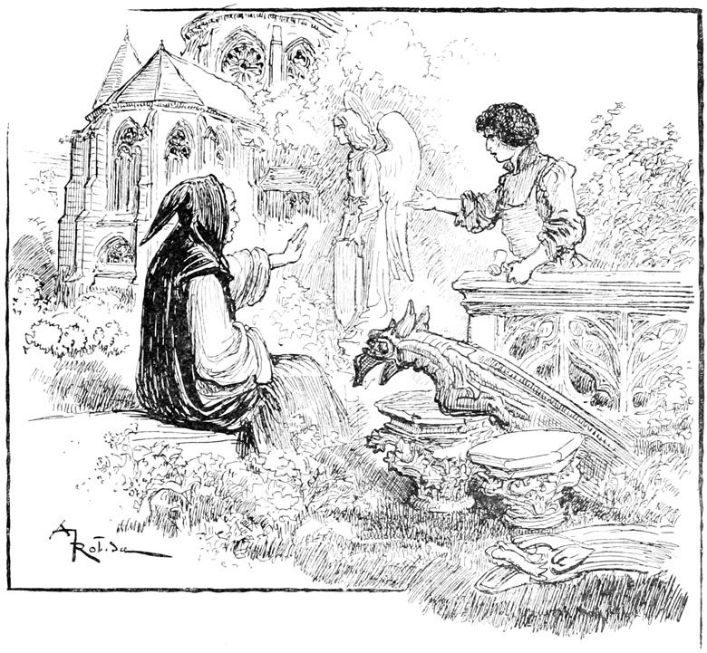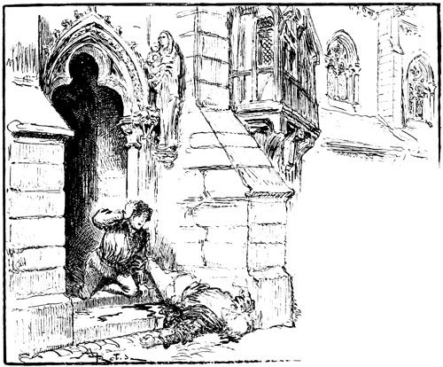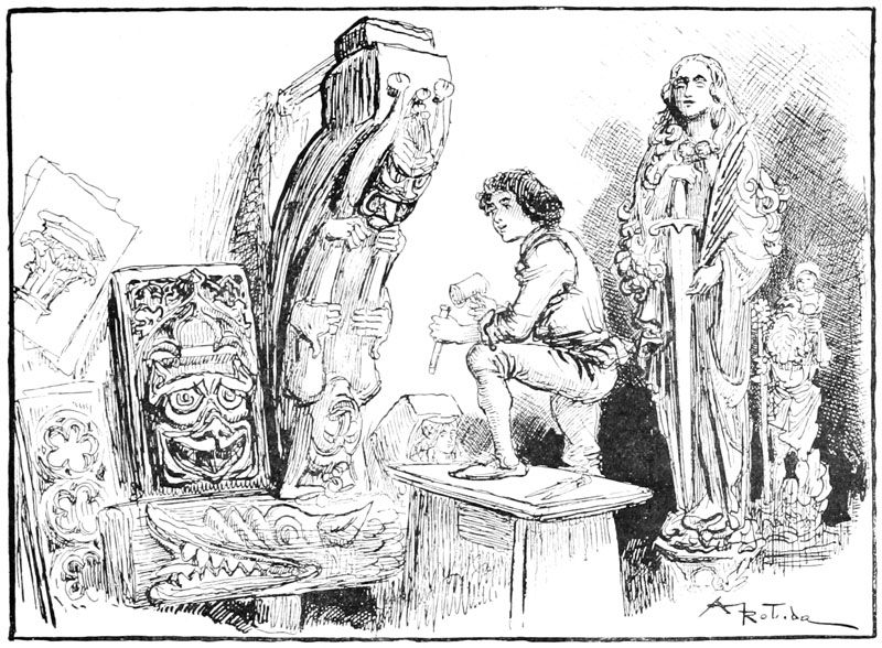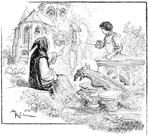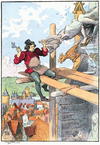 Jehan, penché sur sa planche, s'adressait à un autre sculpteur qui, sur un échafaudage placé au-dessous de lui, était très occupé à polir et affiner les longs plis tombants du manteau de la Vierge, dans un groupe de figures occupant le tympan du grand portail.