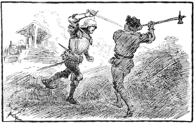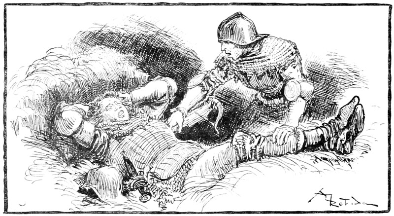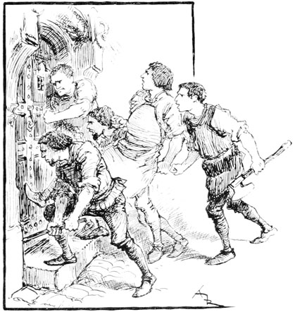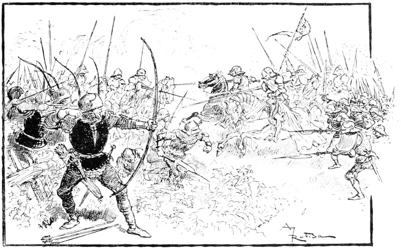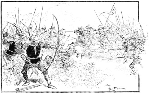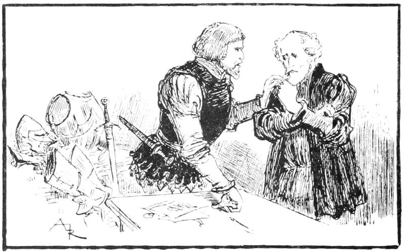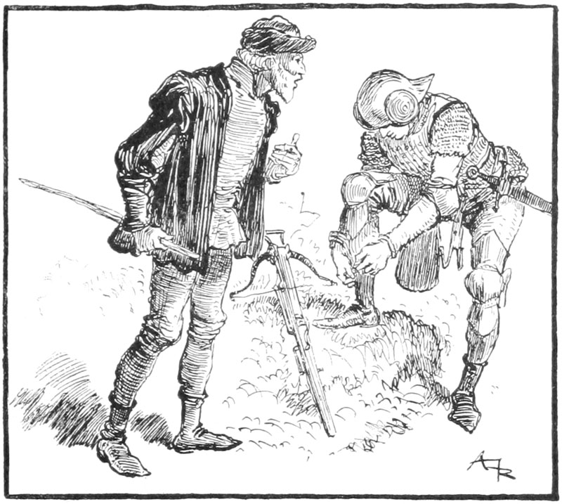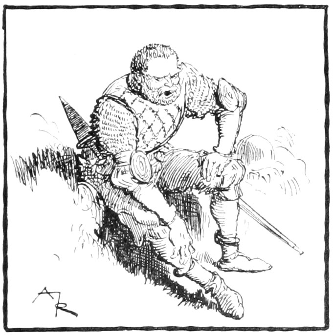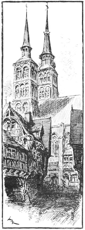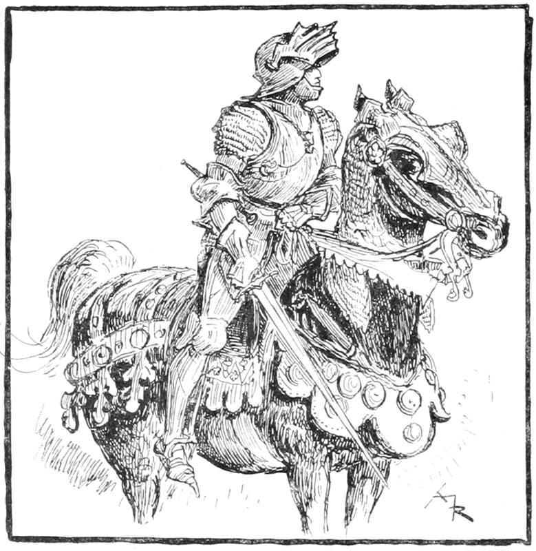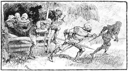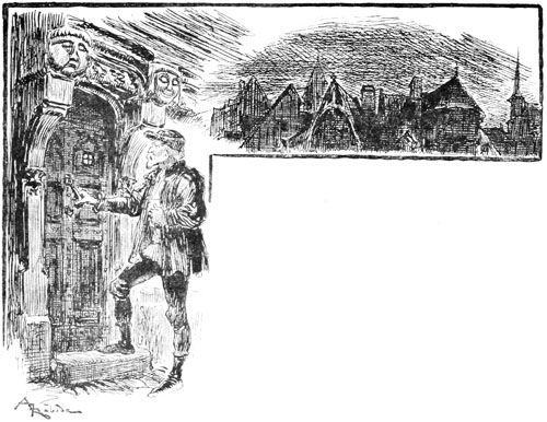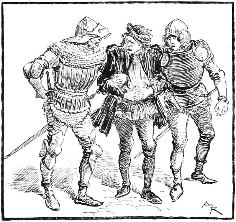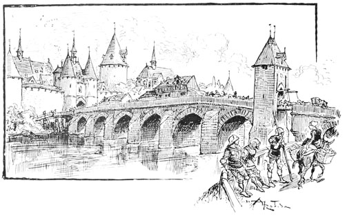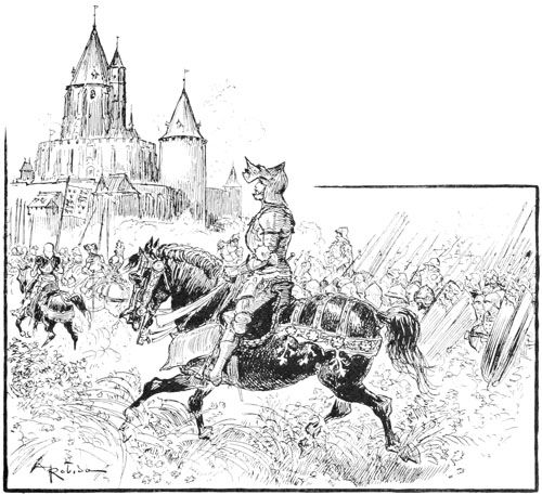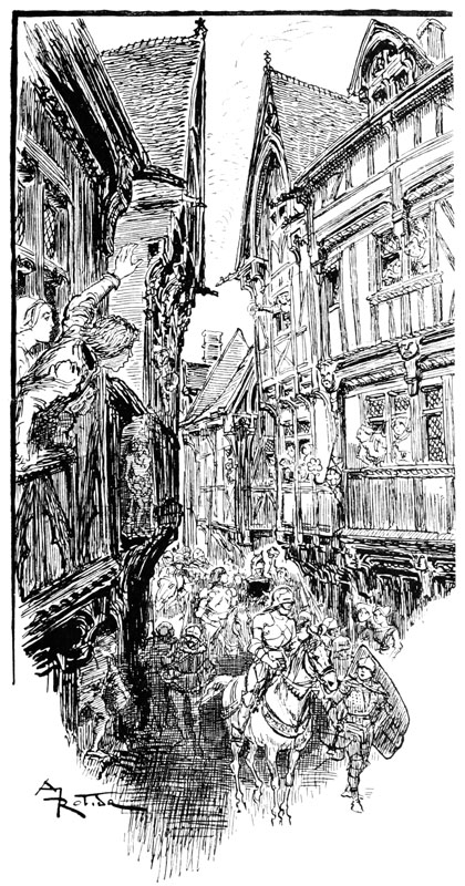Au même instant la porte des bâtiments de l'Abbaye sur la droite du parvis s'ouvrait toute grande et laissait voir messire l'abbé lui-même, accompagné de quelques moines, pendant que de l'autre côté de la place une quinzaine de soldats accouraient du poste du pont, où le tumulte de la place du Marché avait donné l'alarme. Un gentilhomme à cheval, en demi-armure, les conduisait, et ce n'était rien moins que le gouverneur lui-même, Guillaume de Flavy, chevalier de haute taille et de forte corpulence, à poing rude et mine sévère, bien propre à refréner vite toute idée de désordre parmi les plus turbulents.