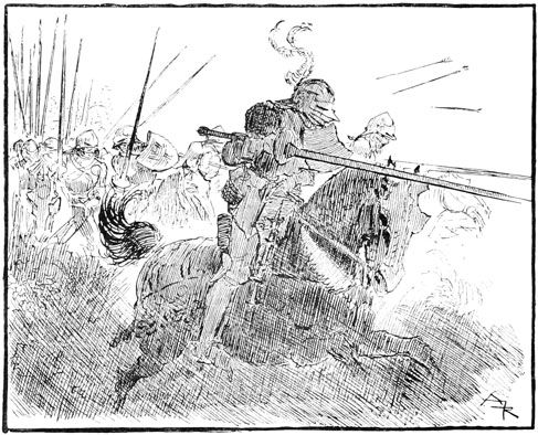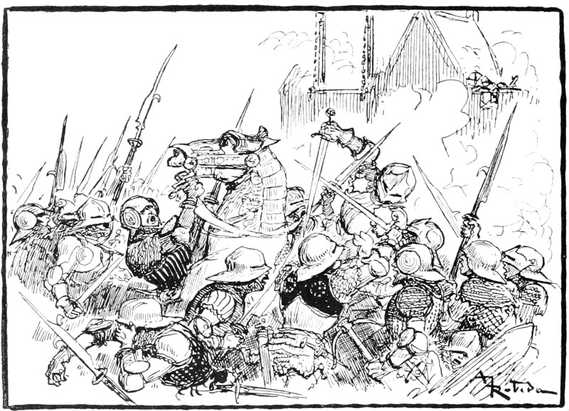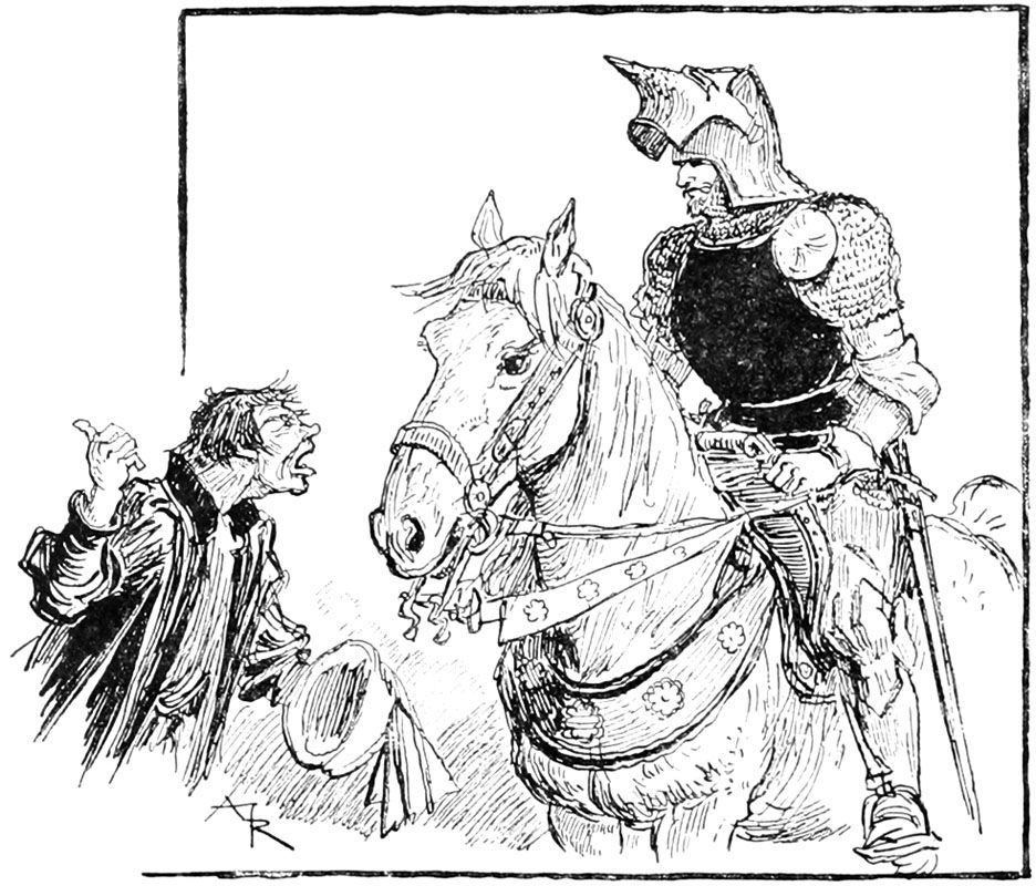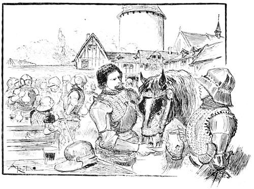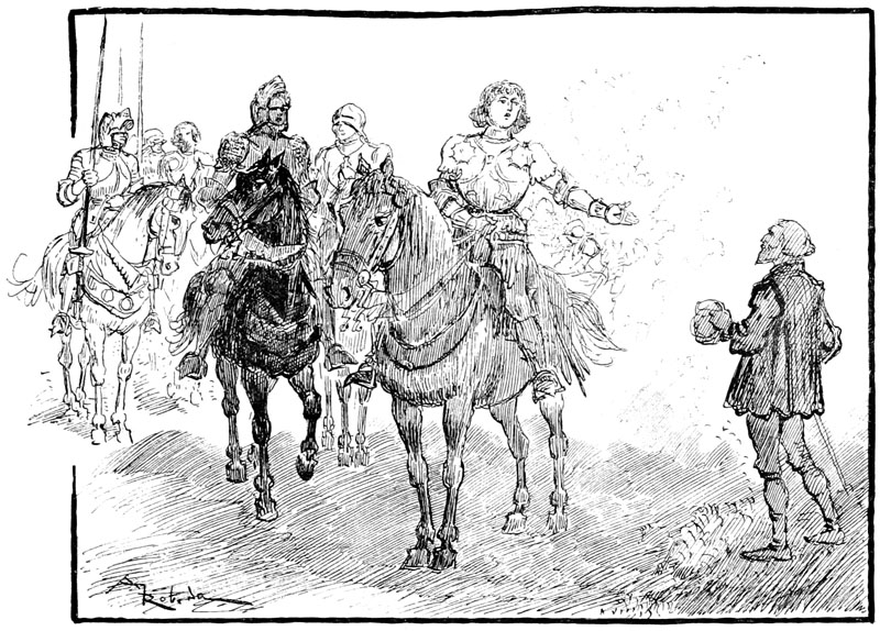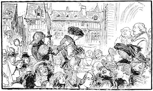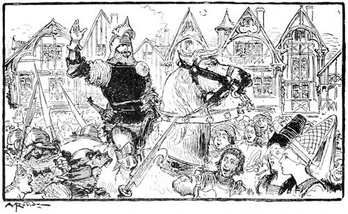 —Eh bien, qu'est-ce? une sédition?... ouvrez vos rangs, bonnes gens, que nous y mettions bon ordre! criait le sire de Flavy en poussant son cheval sans regarder s'il bousculait un peu les paniers de légumes et cages à poulets.