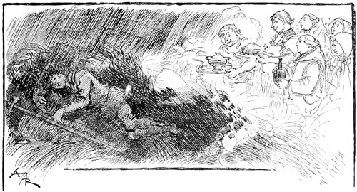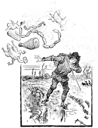 Il n'eut que le temps de rentrer la tête, car une carotte et quelques navets arrivèrent soudain, destinés à sa figure et qui endommagèrent un peu le vitrage de sa fenêtre.