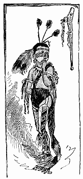 The ball was opened by an old chief, who, rising slowly, beckoned the others to follow him. In his right hand the leader carried a wooden gun, ornamented with eagles' feathers; in the left he held a short stick, with bells attached to it. He wore a cap of otter skin, from which hung a long train. His face was carefully painted in stripes of blue and yellow.