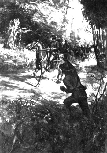The cause of the dog's excitement was apparent, for coming up the road from the west was a large body of horsemen, and a motley troop they were. They were mostly dressed in homespun, and armed with all sorts of weapons, from cavalry sabers to heavy knives fashioned out of files by some rude blacksmith; the army musket, the squirrel rifle, and the shotgun were much in evidence.