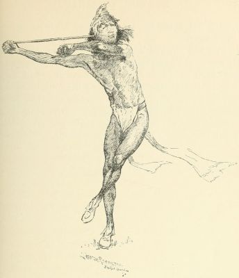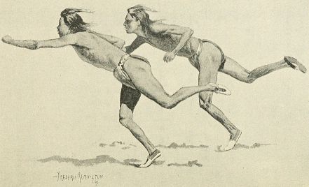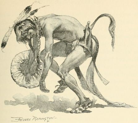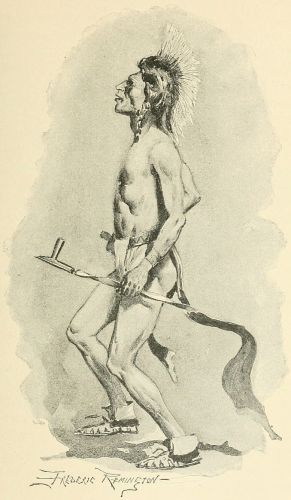Suddenly a hideously-painted naked man on horseback chased the little boys, leaving the cavalcade, and circling around the children. He rode back into the ranks, and still they loitered in the way. Then around swept the horsemen once more, and this time the naked rider flung himself from his horse, and seizing one boy and then the other, bore each to the ground, and made as if he would brain them with his hatchet and lift their scalps with his knife. The sight was one to paralyze an on-looker. But it was only a theatrical performance arranged for the occasion. The man was acting over again the proudest of his achievements. The boys played the parts of two white men whose scalps now grace his tepee and gladden h[51]is memory.