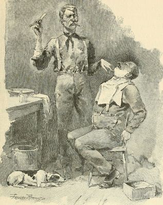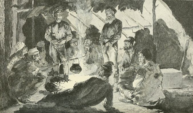 The sun blazed down on the great camp that afternoon and glorified the place so that it looked like a miniature Switzerland of snowy peaks. But it was hot, and blankets were stretched from the tent tops, and the women sat under them to catch the air and escape the heat. The salaried native policeman of the reserve, wearing a white stove-pipe hat with feathers, and a ridiculous blue coat, and Heaven alone knows what other absurdities, rode around, boasting of deeds he never performed, while a white cur made him all the more ridiculous by chasing him and yelping at his horse's tail.