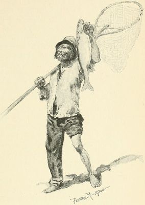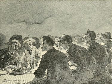 When we entered the big tepee we saw twenty-one men seated in a circle against the wall and facing the open centre, where the ground was blackened by the ashes of former fires. Three Bulls sat exactly opposite the queer door, a horseshoe-shaped hole reaching two feet above the ground, and extended by the partly loosened lacing that held the edges of the tent-covering together. Mr. L'Hereux, the interpreter, made a long speech in introducing each of us. We stood in the middle of the ring, and the chief punctuated the interpreter's remarks with that queer Indian grunt which it has ever been the custom to spell "ugh," but which you may imitate exactly if you will try to say "Ha" through your nose while your mouth is closed. As Mr. L'Hereux is a great talker, and is[29] of a poetic nature, there is no telling what wild fancy of his active brain he invented concerning us, but he made a friendly talk, and that was what we wanted. As each speech closed, Three Bulls lurched forward just enough to make the putting out of his hand a gracious act, yet not enough to disturb his dignity. After each salutation he pointed out a seat for the one with whom he had shaken hands. He announced to the council in their language that we were good men, whereat the council uttered a single "Ha" through its twenty-one noses. If you had seen the rigid stateliness of Three Bulls, and had felt the frigid self-possession of the twenty-one ramrod-mannered under-chiefs, as well as the deference which was in the tones of the other white men in our company, you would comprehend that we were made to feel at once honored and subordinate. Altogether we made an odd picture: a circle of men seated tailor fashion, and my own and Mr. Remington's black shoes marring the gaudy ring of yellow moccasins in front of the savages, as they sat in their colored blankets and fringed and befeathered gear, each with the calf of one leg crossed before the shin of the other.