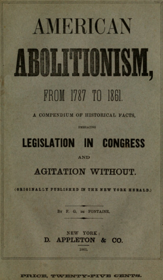 Project Gutenberg's History of American Abolitionism, by F. G. De Fontaine This eBook is for the use of anyone anywhere at no cost and with almost no restrictions whatsoever. You may copy it, give it away or re-use it under the terms of the Project Gutenberg License included with this eBook or online at www.gutenberg.org Title: History of American Abolitionism Author: F. G. De Fontaine Release Date: March 27, 2011 [EBook #35693] Language: English Character set encoding: ISO-8859-1 *** START OF THIS PROJECT GUTENBERG EBOOK HISTORY OF AMERICAN ABOLITIONISM *** Produced by Bryan Ness and the Online Distributed Proofreading Team at https://www.pgdp.net (This file was produced from images generously made available by The Internet Archive.)