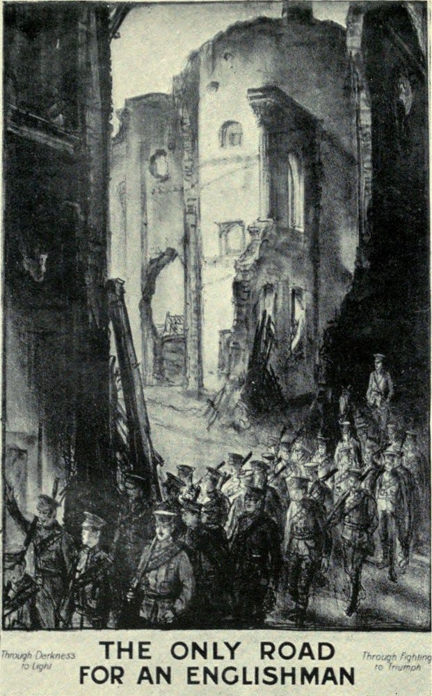 The Only Road for an Englishman. Through Darkness to Light; Through Fighting to Triumph. The first war poster by Spencer Pryse. Published by the Underground Electric Railways Company of London, 1914.