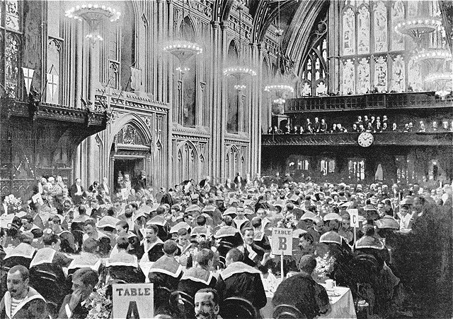 | A la sortie du Guildhall: formation du cortège pour se rendre à l'Alhambra. | Le banquet offert aux officiers de l'escadre française, à Westminster, le 12 août. |