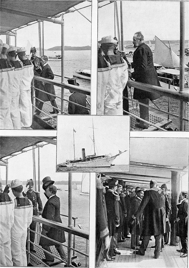 Il appartenait au président Roosevelt, après avoir pris l'initiative des négociations pour la paix entre la Russie et le Japon, de présenter les uns aux autres, à leur arrivée aux États-Unis, les plénipotentiaires russes et japonais. Cette formalité protocolaire a eu lieu le 5 août, dans les eaux américaines, à Oyster-Bay, à bord du yacht présidentiel Mayflower. Le président y était venu de son cottage de Sagamore Hill. Bientôt après, le croiseur Tacoma arrivait portant les délégués du Japon qui, représentants du vainqueur, devaient être reçus les premiers par M. Roosevelt, tandis que le croiseur Chattanooga amenait, à quelques minutes de là, les plénipotentiaires russes. Les présentations eurent lieu dans la grande salle du yacht, où se tenaient M. Witte, et ses collaborateurs, et où l'on introduisit cérémonieusement le baron Komura et, les délégués japonais qui, à l'arrivée des Russes, s'étaient retirés dans un petit salon voisin. Les figures des Japonais étaient graves, leurs yeux froids, on le remarqua. Et l'on constata par contre, non sans quelque sympathie, que l'attitude de M. Witte était cordiale, ronde, franche; elle séduisit fort les Américains.