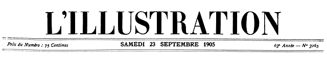 Project Gutenberg's L'Illustration, No. 3265, 23 Septembre 1905, by Various This eBook is for the use of anyone anywhere at no cost and with almost no restrictions whatsoever. You may copy it, give it away or re-use it under the terms of the Project Gutenberg License included with this eBook or online at www.gutenberg.org Title: L'Illustration, No. 3265, 23 Septembre 1905 Author: Various Release Date: April 23, 2011 [EBook #35938] Language: French Character set encoding: ISO-8859-1 *** START OF THIS PROJECT GUTENBERG EBOOK L'ILLUSTRATION, NO. 3265, 23 SEPTEMBRE 1905 *** Produced by Jeroen Hellingman and Rénald Lévesque