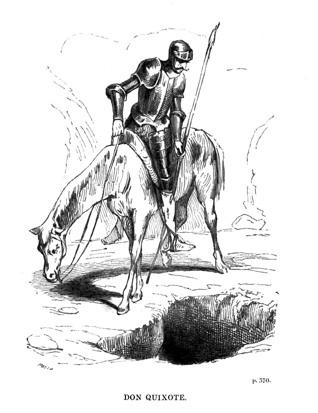But surely such censure is misdirected—surely the downfall of Spain may be traced to other causes. It is not the spirit of heroism, or of Christian self-devotion, which Cervantes would put down. His manly writing can never be accused of that: misfortune had taught him too well in his own earlier days how to appreciate such a virtue. In nothing is his consummate skill perceived more than in the way in which he prevents us from confounding the follies of the knights-errant, and of the debased books of romance, with the generous heart and actions of the true Christian gentleman. In spite of all his hallucination, who can help respecting Don Quixote himself? We laugh, indeed, at the ludicrous situations into which his madness is for ever getting him; but we must reverence the good Christian cavalier who, amidst all, never thinks less of any thing than of himself and of his own interest. What is his character? It is that of one possessing virtue, imagination, genius, kind feeling,—all that can distinguish an elevated soul, and an affectionate heart. He is brave, faithful, loyal, always keeping his word; he contends only for virtue and glory. Does he wish for kingdoms? it is only that he may give them to his good squire Sancho Panza. He is a constant lover, a humane warrior, an affectionate master, an accomplished gentleman. It is not, then, by describing such a man that Cervantes desired to ridicule real heroism; surely not: he would only shew that, even with all these good qualities, if they were misdirected or spoiled by vain imaginations, the most noble could only become ridiculous. He would teach us, that this is a world of action, and not of fancy; that it will not do for us to go out of ourselves and out of the world, and lead an ideal life: our duties are around us and within us; and we need not leave our own homes in order to seek adventures wherein those duties may be acceptably performed. He perceived that by knight-errantry and romances some of the holiest aspirations of the human heart were, according to the adage, which affirms that "there is but one step from the sublime to the ridiculous," by over-description and fulsome language, in danger of being exposed to ridicule, and so of being crushed; and he resolved, by excess of satire, to put a [Pg xxvi] stop at once to such a danger,—to crush those books which were daily destroying that which he held most dear—the true spirit of chivalry, the true devotion of the Christian gentleman. "When the light of chivalry was expiring, Cervantes put his extinguisher upon it, and drove away the moths that alone still fluttered around it. He loved chivalry too well to be patient when he saw it parodied and burlesqued; and he perceived that the best way of preserving it from shame was, to throw over it the sanctity of death."[3]