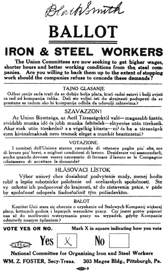From past events in the steel industry it was evident that in the proposed campaign radical departures would have to be made from the ordinary organizing tactics. Without question the steel workers' unions have always lacked efficiency in their organizing departments. This was a cardinal failing of the Amalgamated Association and it contributed as much, if not more than anything else to its downfall. If, when in its prime, this organization had shown sufficient organizing activity in the non-union mills, and especially by taking in the unskilled, it would have so intrenched itself that Carnegie and his henchman, Frick, never could have dislodged it. But, unfortunately, it undertook too much of its organization work at the conference table and not enough at the mill gates. Consequently, more than once it found itself in deadly quarrels with the employers over the unionization of certain mills, when a live organizer working among the non-union men involved would have solved the problem in a few weeks.