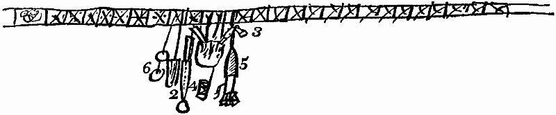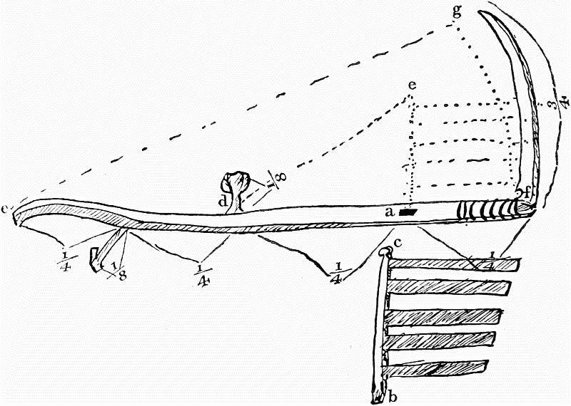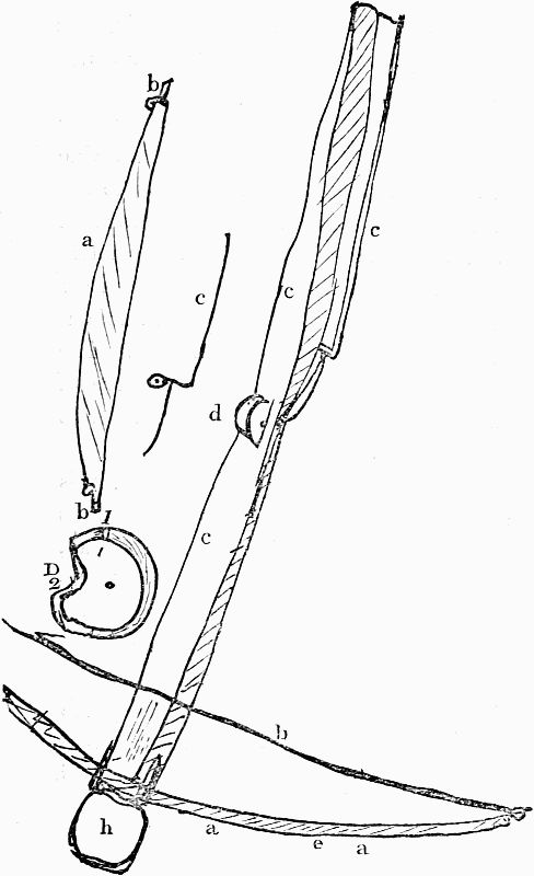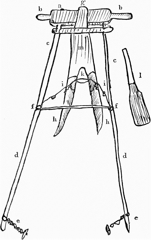The first figure represents two connected[Pg 8] beams, which compose the frame-work of one side of the hut; and these meet at the[Pg 9] top with two similar ones, forming the opposite side. A solitary beam is placed on each side, in the middle of the arch formed by these four, so that the whole edifice has six angles. Two more slender sticks, but equally tall, are then erected between every two angles, or main ribs, of the building. Over the whole is spread the covering of the tent (made of walmal cloth). The usual height of the structure is about a fathom and half, and the breadth two fathoms. A flap of cloth is left, so as to open and shut by way of a door, between two of the main beams.
