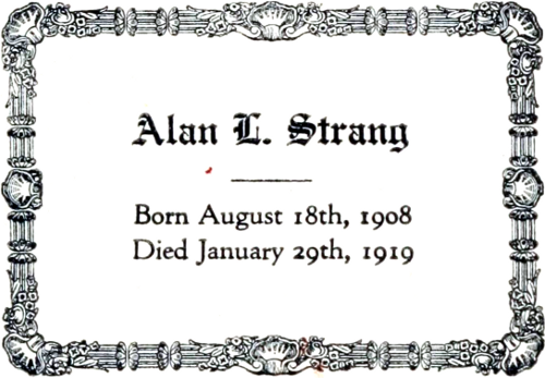 He had a gentle, loving disposition, was always frail and delicate and possessed a mental development far in advance of his years. He was taken to the Great Beyond January 29, 1919.