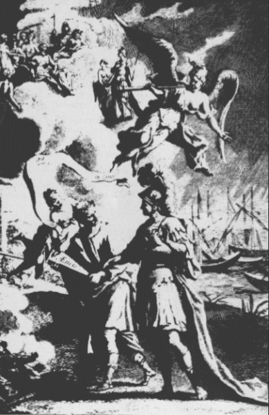 The conventional view that Trapp wished to change by the interpolation of Milton was that, whereas Virgil merited the laurel for judgment and decorum, Homer possessed greater "fire," "sublimity," "fecundity," "majesty," and "vastness" (to use Trapp's terms). Homer was praised as the great original and inventor; Virgil followed in his steps with more refinement and rationality, showing everywhere that good sense and polished concision of expression characteristic of the Augustan age (so, for instance, René Rapin claimed in the well-known Comparaison).[3] One blossomed with the wild abundance and grandeur of nature; the other displayed that cultivated order shown in fields and gardens. Trapp accepts all that was granted to the Roman poet, but he claims for Virgil, Homeric qualities also: his borrowings are merely the basis for his invention (witness the tale of Dido); and as for the fire of sublimity, Trapp, like a critical Prometheus, filches that also. Among the many instances of the Virgilian fire given in the Preface, he cites "the Arrival of Aeneas with his Fleet and Forces" in the tenth book. His translation runs thus: