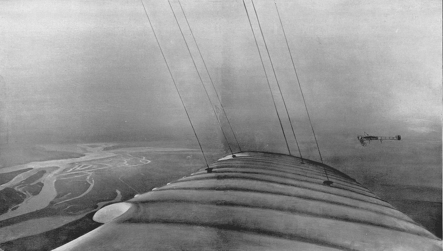 Nous avions laissé les aviateurs à Schaffhouse; une panne de moteur les arrête près de la vieille cité; ils reprennent leur vol le 28 octobre: «...Un industriel du pays nous donne une lettre pour son frère qui habite Alexandrie. C'est la dernière levée.» Le temps s'éclaircit; nous atteignons Constance, puis Friedrichshafen. Le comte Zeppelin nous ayant interdit de survoler son terrain, bien qu'il ne figure pas sur la carte des zones interdites, nous passons prudemment à un kilomètre des hangars. Le champ paraît avoir 800 mètres de côté; un grand hangar, probablement tournant, occupe le centre. Je regrette de n'avoir pas mon appareil photographique; je l'ai laissé à mon mécanicien pour la traversée de l'Allemagne.
