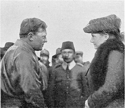 | A Varna, en Bulgarie, au bord de la mer Noire: la foule entourant le monoplan qui vient d'atterrir.--Phot. H. Roux. | Daucourt ayant à sa droite Mme Duchesne, femme du consul de France, à sa gauche Mme Stancioff, femme du ministre de Bulgarie à Paris. |