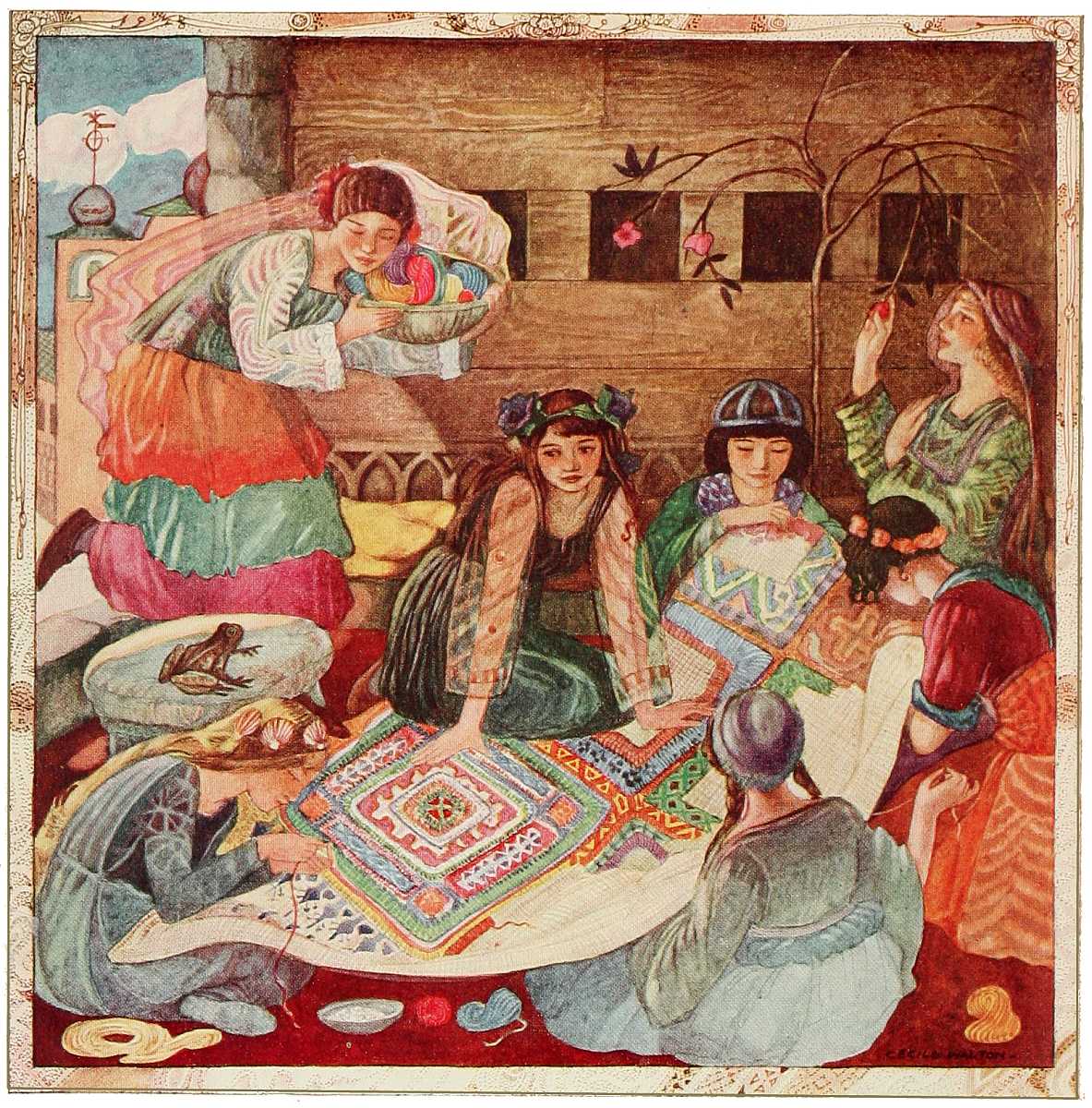 Meanwhile the wives of the other princes bought the most beautifully coloured wools, and the best designs they could find, and worked hard at their looms all the next day.[5]