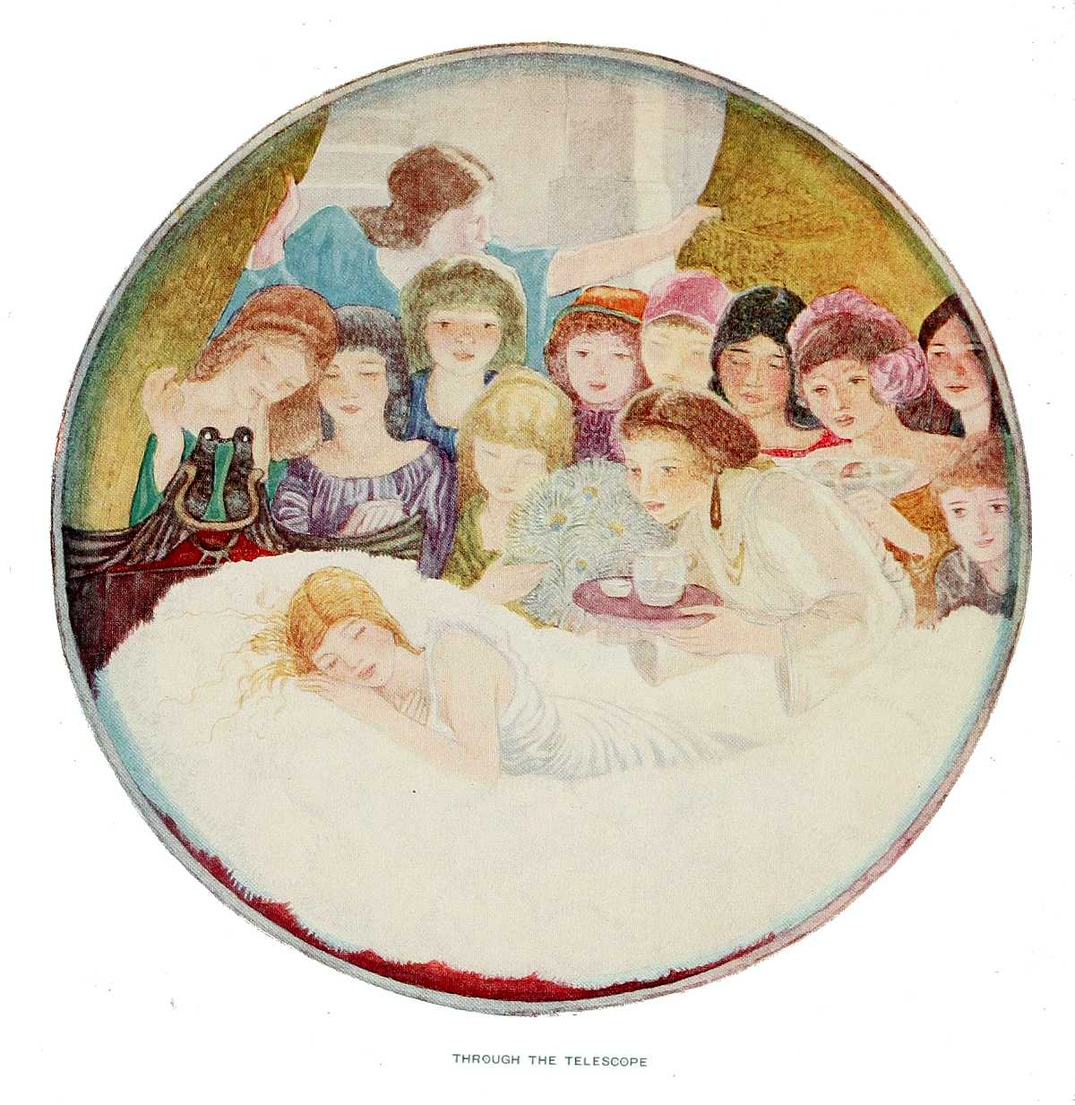 The winds began to rise, and the seven beautiful maidens floated down into the room, carrying baskets, with flour, water, sweetmeats, and all sorts of dainties. They curtsied to the little frog, and got the cake ready in a few minutes; curtsied again, and flew away.