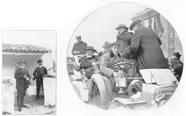 Pendant les dernières journées du séjour de M. Loubet en Espagne, le programme a fait la part belle à l'élément sportif. C'est ainsi qu'il y eut consécutivement deux chasses, et ce ne fut pas trop au gré du souverain et de son hôte, étant donné leur goût personnel prononcé pour ce passe-temps favori de la plupart des chefs d'État. La première, une chasse à la grosse bête, eut lieu le mercredi 25, sous la direction du comte de San-Roman, grand veneur, dans le domaine royal de Rio-Frio, situé à trois heures de chemin de fer de, Madrid, et dont les tirés abondent en cerfs, daims et chevreuils. Les chasseurs, divisés en groupes de deux ou trois, étaient placés derrière des abris, de manière à pouvoir viser tranquillement les pièces de choix parmi le gibier que poussaient devant eux une centaine de rabatteurs. Le jeudi 26, le roi et le président, accompagné encore, de M. Paul Loubet, son fils aîné, employaient leur matinée à chasser le lapin et le perdreau dans la Casa del Campo, autre parc royal, mais voisin, celui-là, du palais de Madrid. Ajoutons que, la veille, à la suite de la chasse, Alphonse XIII, plein d'un entrain juvénile, avait improvisé une excursion au château de la Granja et à Ségovie, conduisant lui-même d'une main sûre l'automobile où il emportait son illustre visiteur.