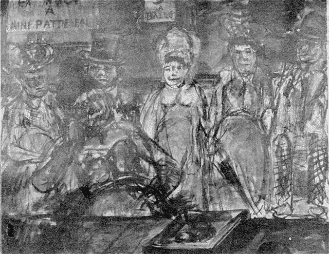 Il est représenté ici par une série d'études de forains dont l'énergie d'accent et la robustesse de dessin sont extrêmes. Rouault a l'étoffe d'un maître et je serais tenté de voir là le prélude d'une période d'affranchissement que des créations originales et des travaux définitifs marqueront. Thiébault-Sisson, le Temps.