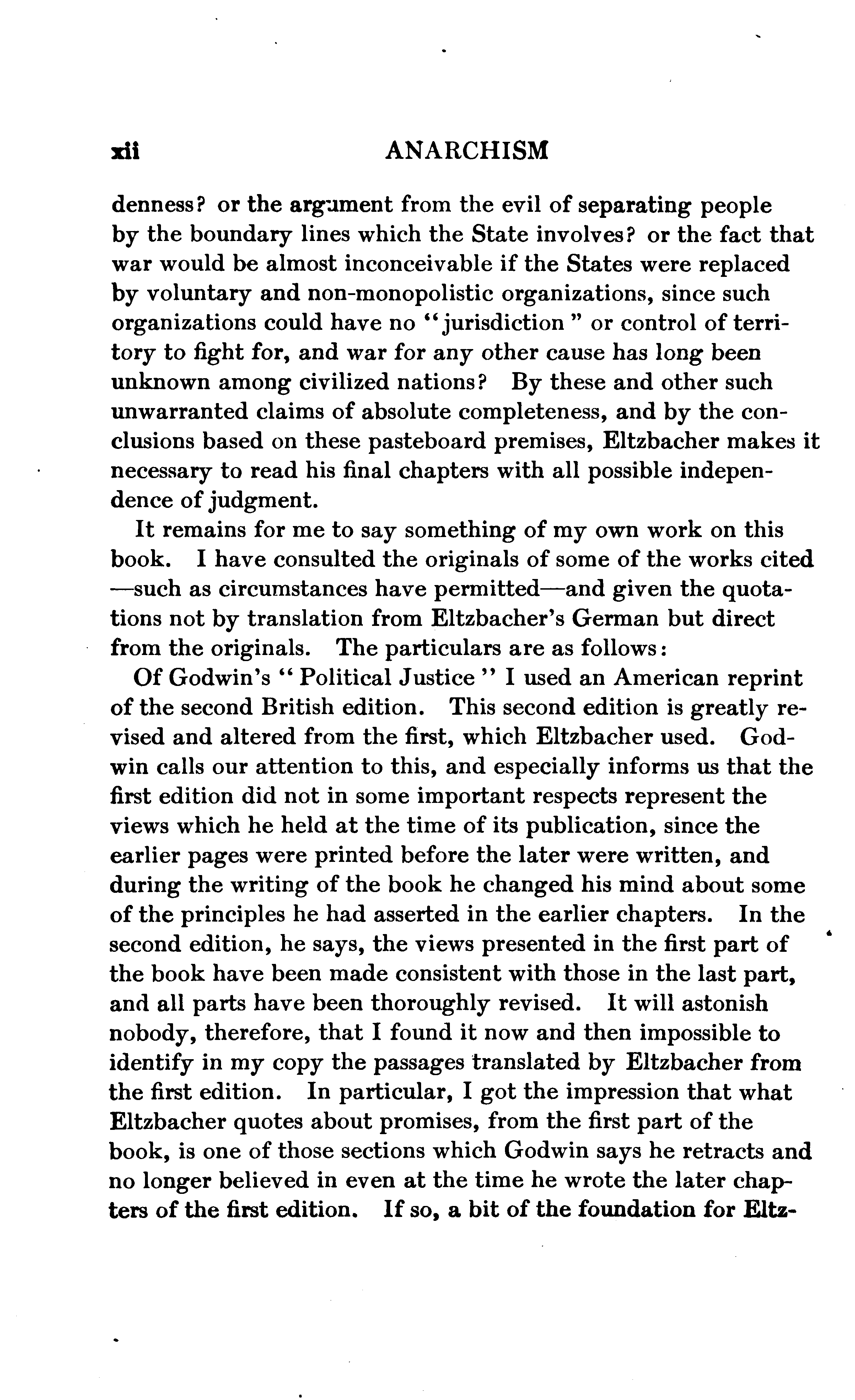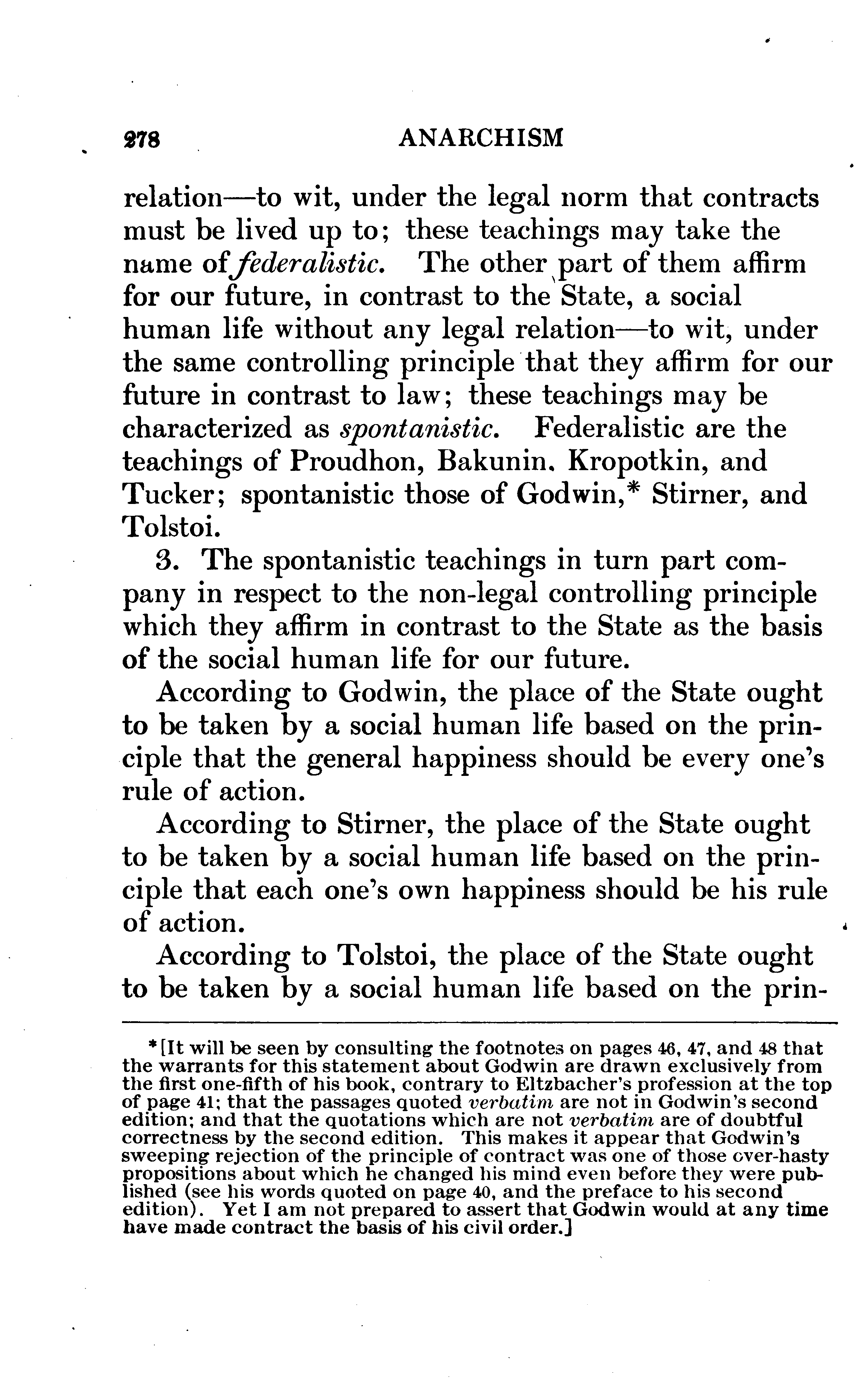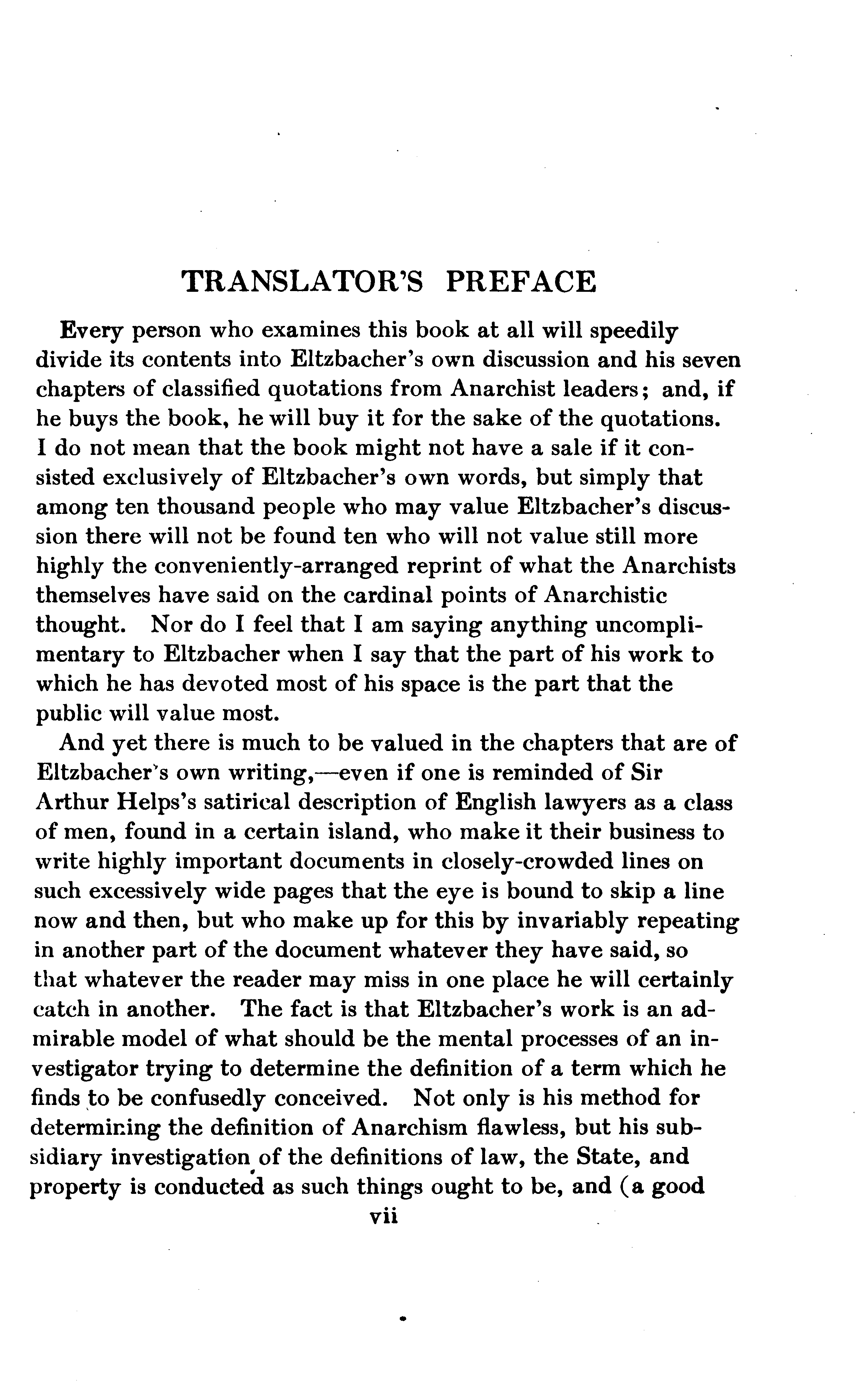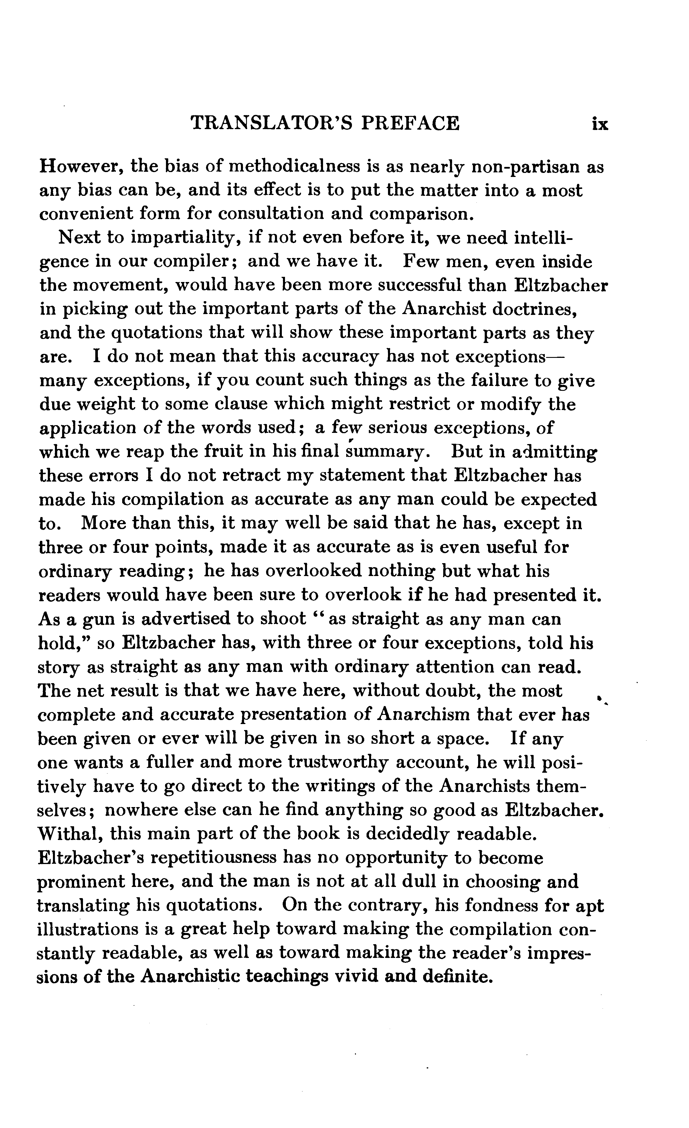 Every person who examines this book at all will speedily divide its contents into Eltzbacher's own discussion and his seven chapters of classified quotations from Anarchist leaders; and, if he buys the book, he will buy it for the sake of the quotations. I do not mean that the book might not have a sale if it consisted exclusively of Eltzbacher's own words, but simply that among ten thousand people who may value Eltzbacher's discussion there will not be found ten who will not value still more highly the conveniently-arranged reprint of what the Anarchists themselves have said on the cardinal points of Anarchistic thought. Nor do I feel that I am saying anything uncomplimentary to Eltzbacher when I say that the part of his work to which he has devoted most of his space is the part that the public will value most.