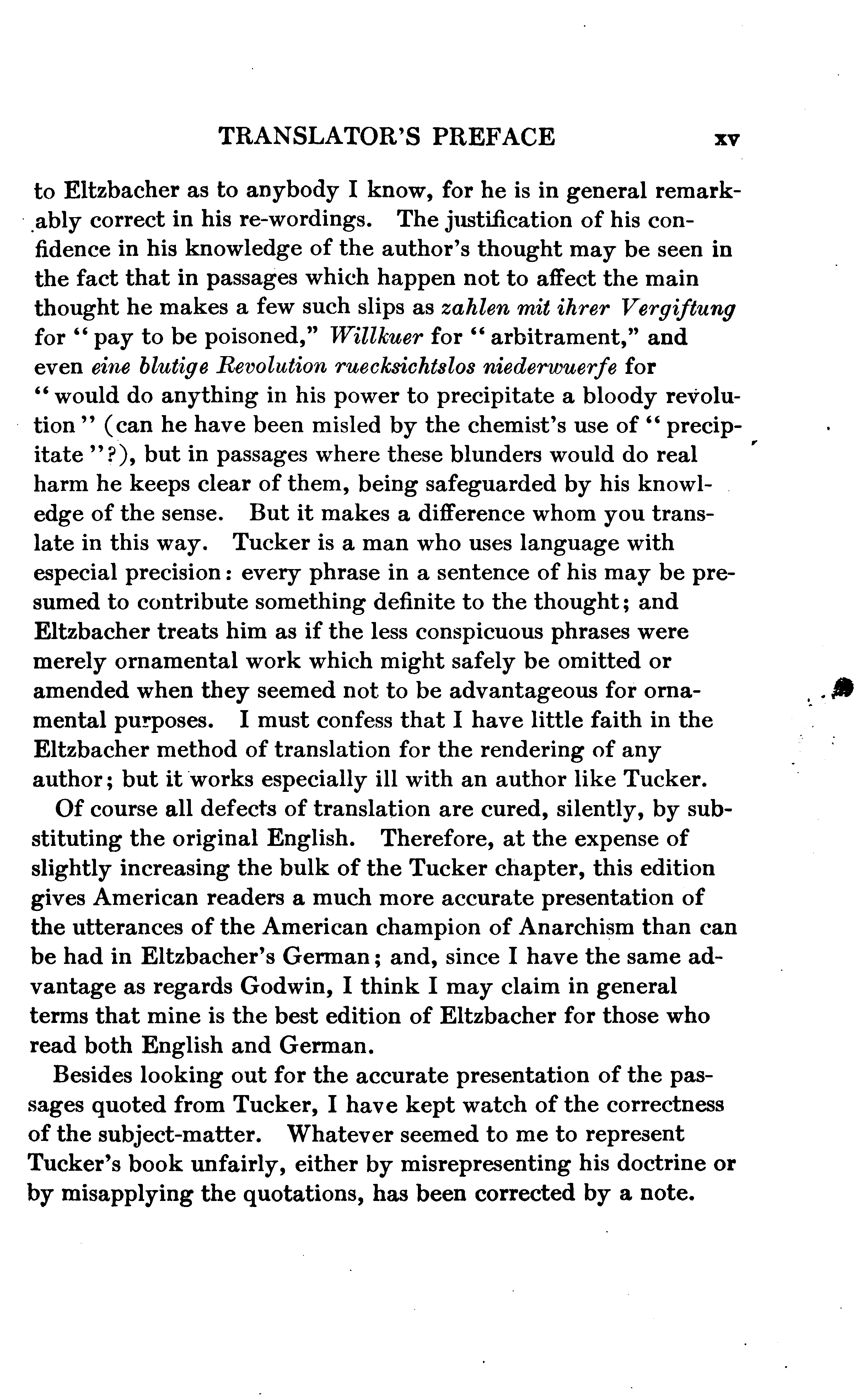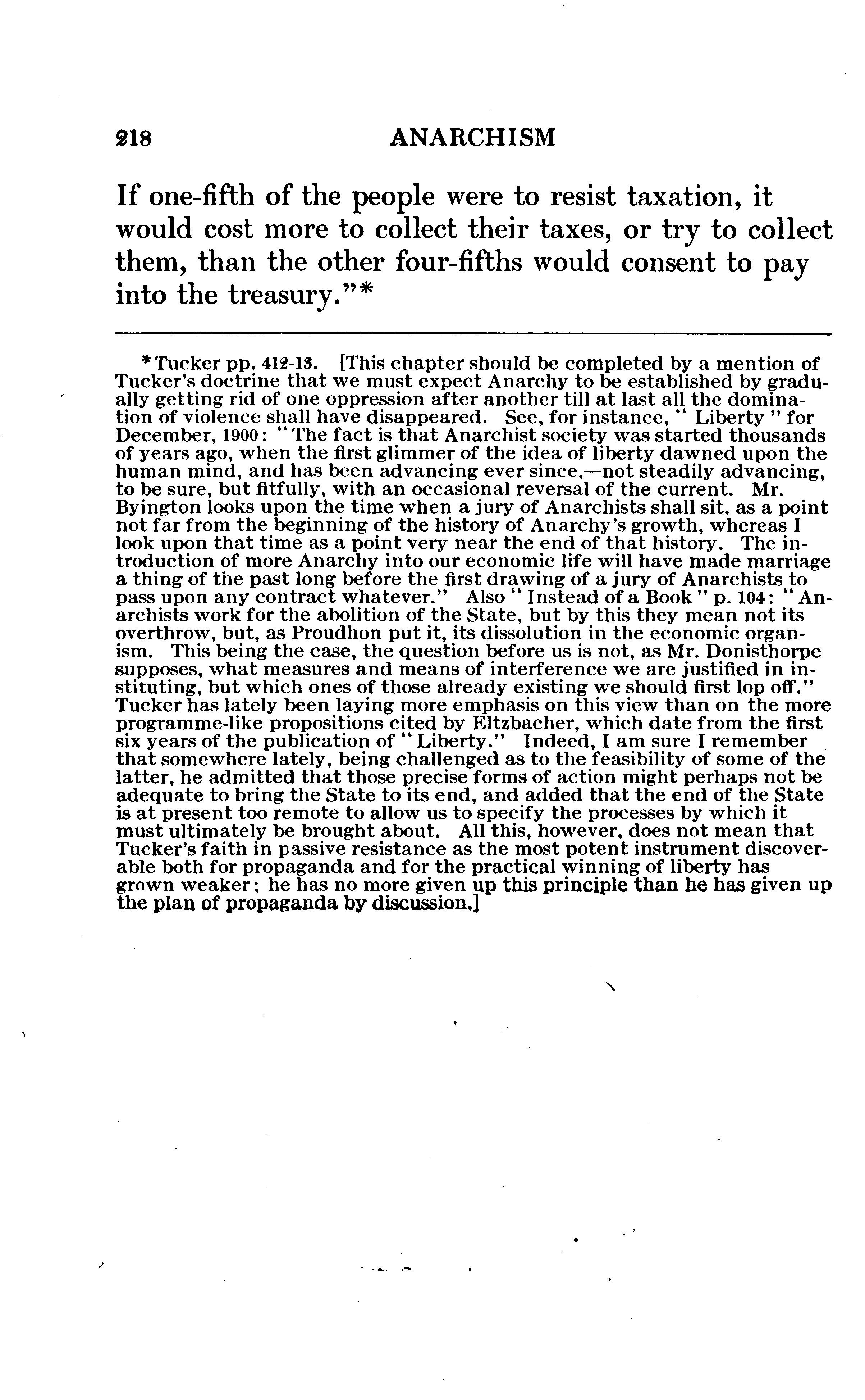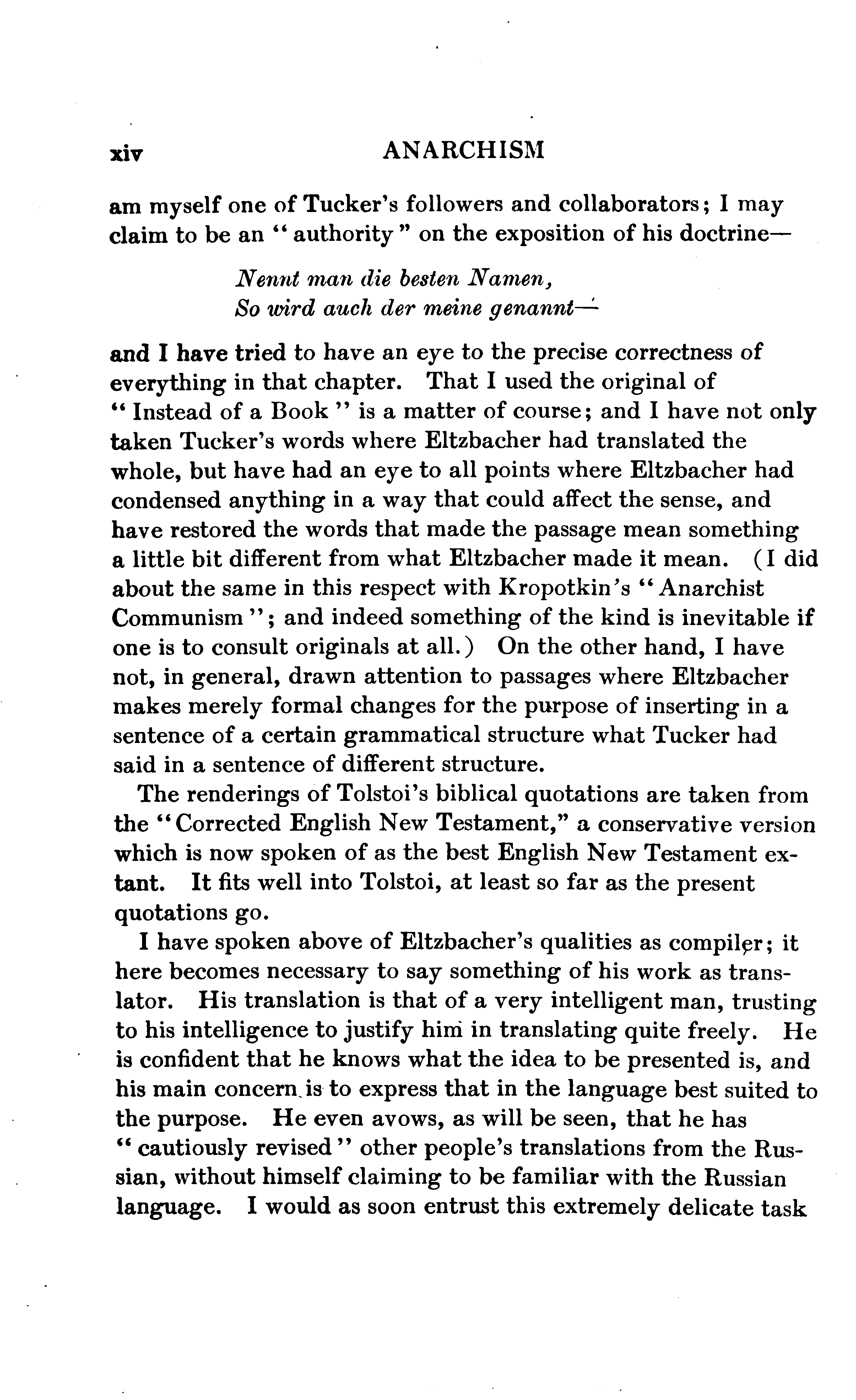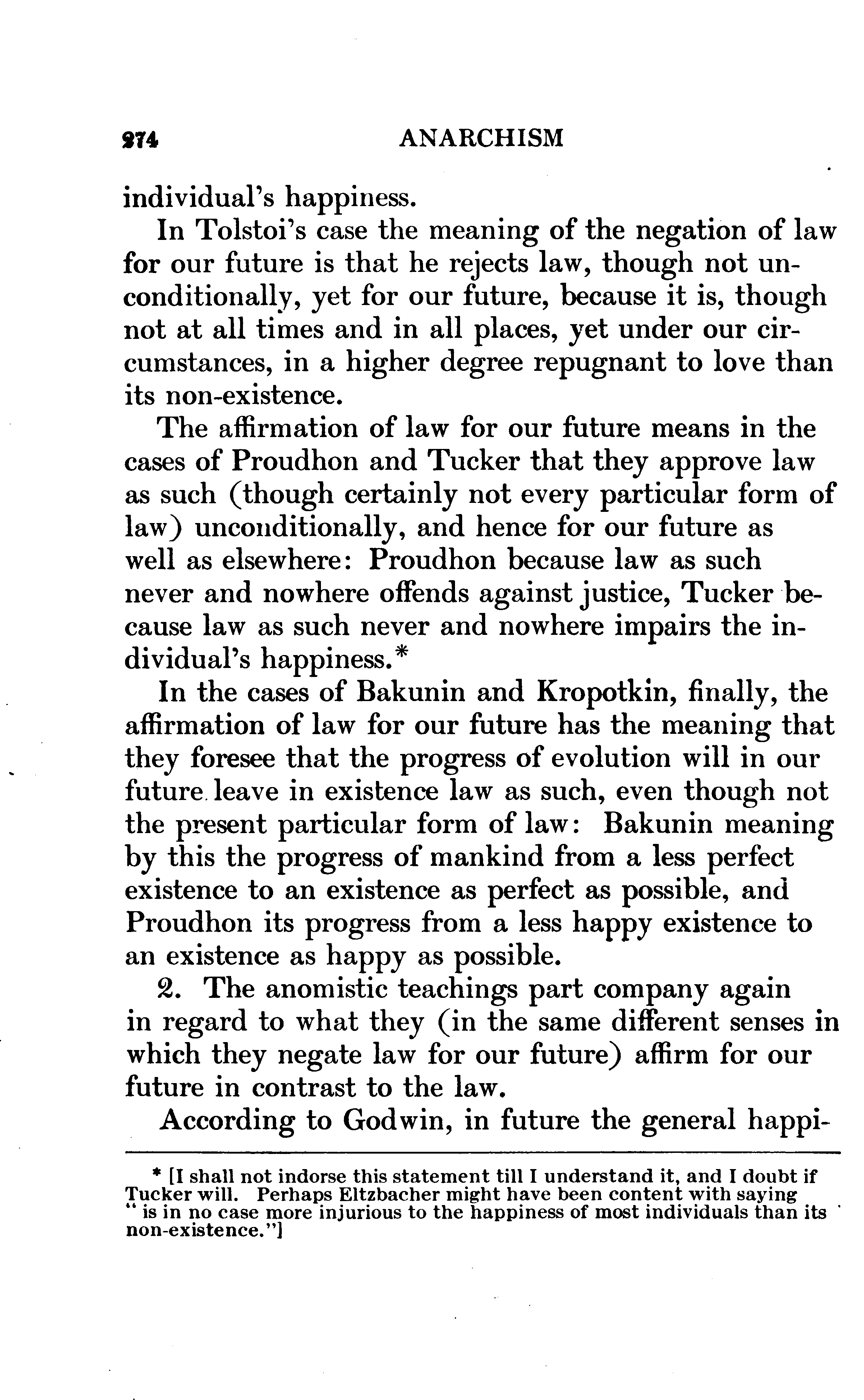 Every person who examines this book at all will speedily divide its contents into Eltzbacher's own discussion and his seven chapters of classified quotations from Anarchist leaders; and, if he buys the book, he will buy it for the sake of the quotations. I do not mean that the book might not have a sale if it consisted exclusively of Eltzbacher's own words, but simply that among ten thousand people who may value Eltzbacher's discussion there will not be found ten who will not value still more highly the conveniently-arranged reprint of what the Anarchists themselves have said on the cardinal points of Anarchistic thought. Nor do I feel that I am saying anything uncomplimentary to Eltzbacher when I say that the part of his work to which he has devoted most of his space is the part that the public will value most.