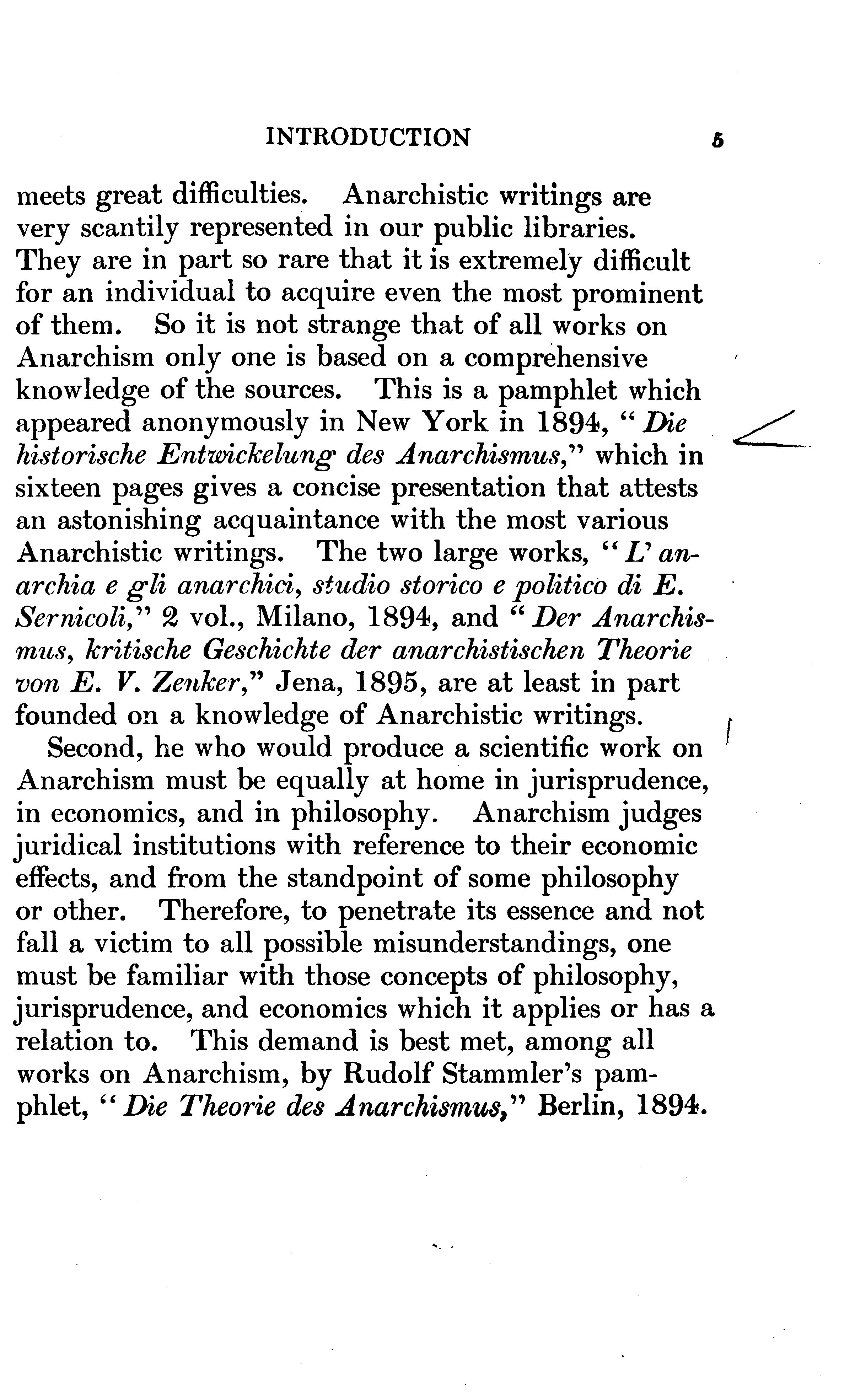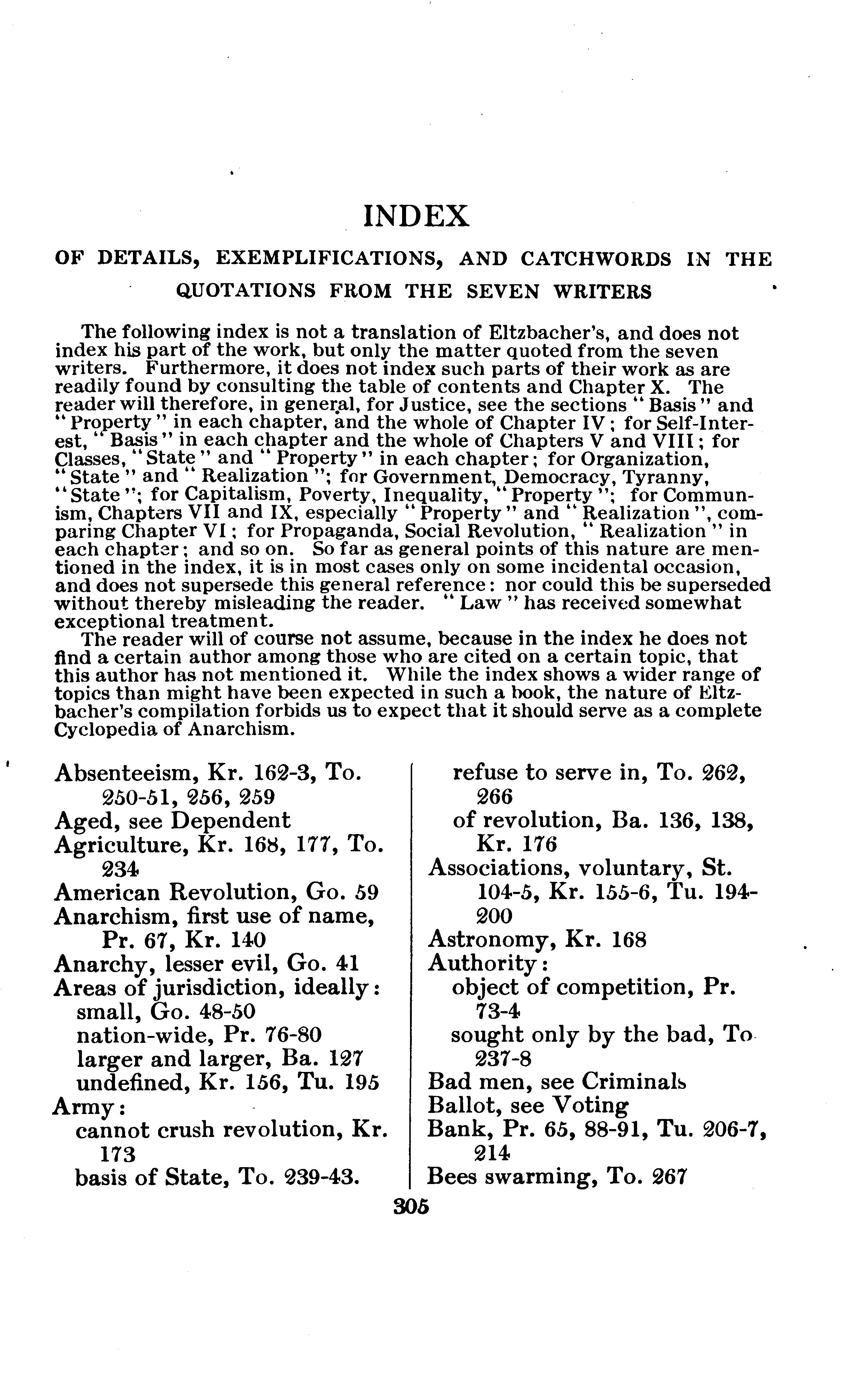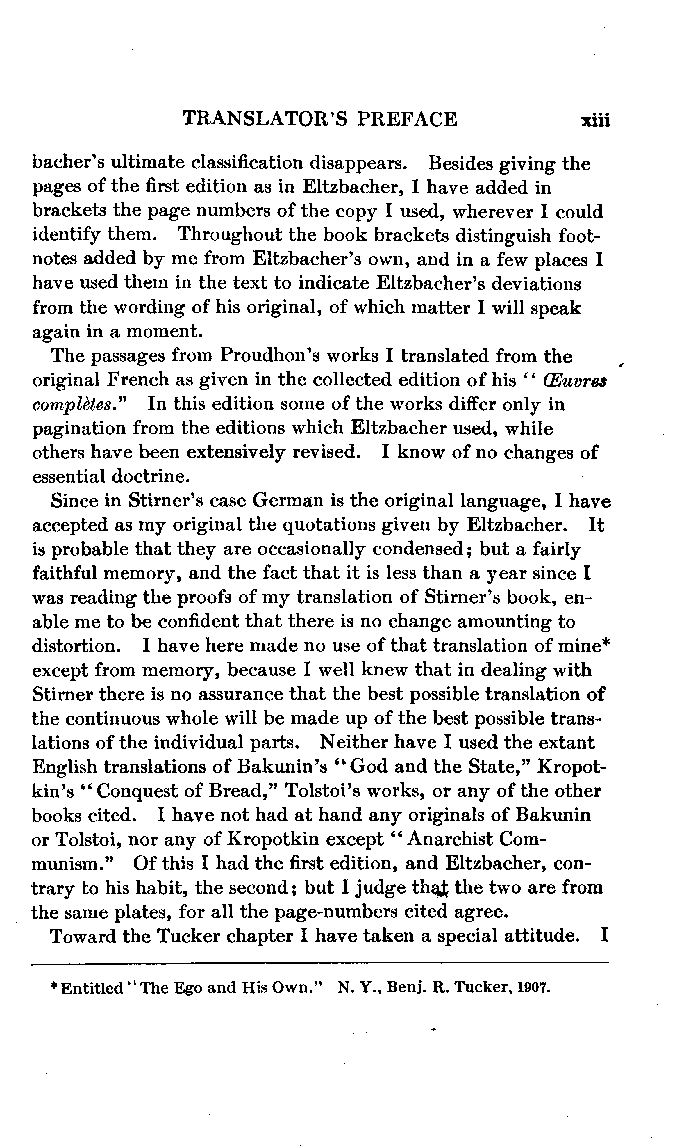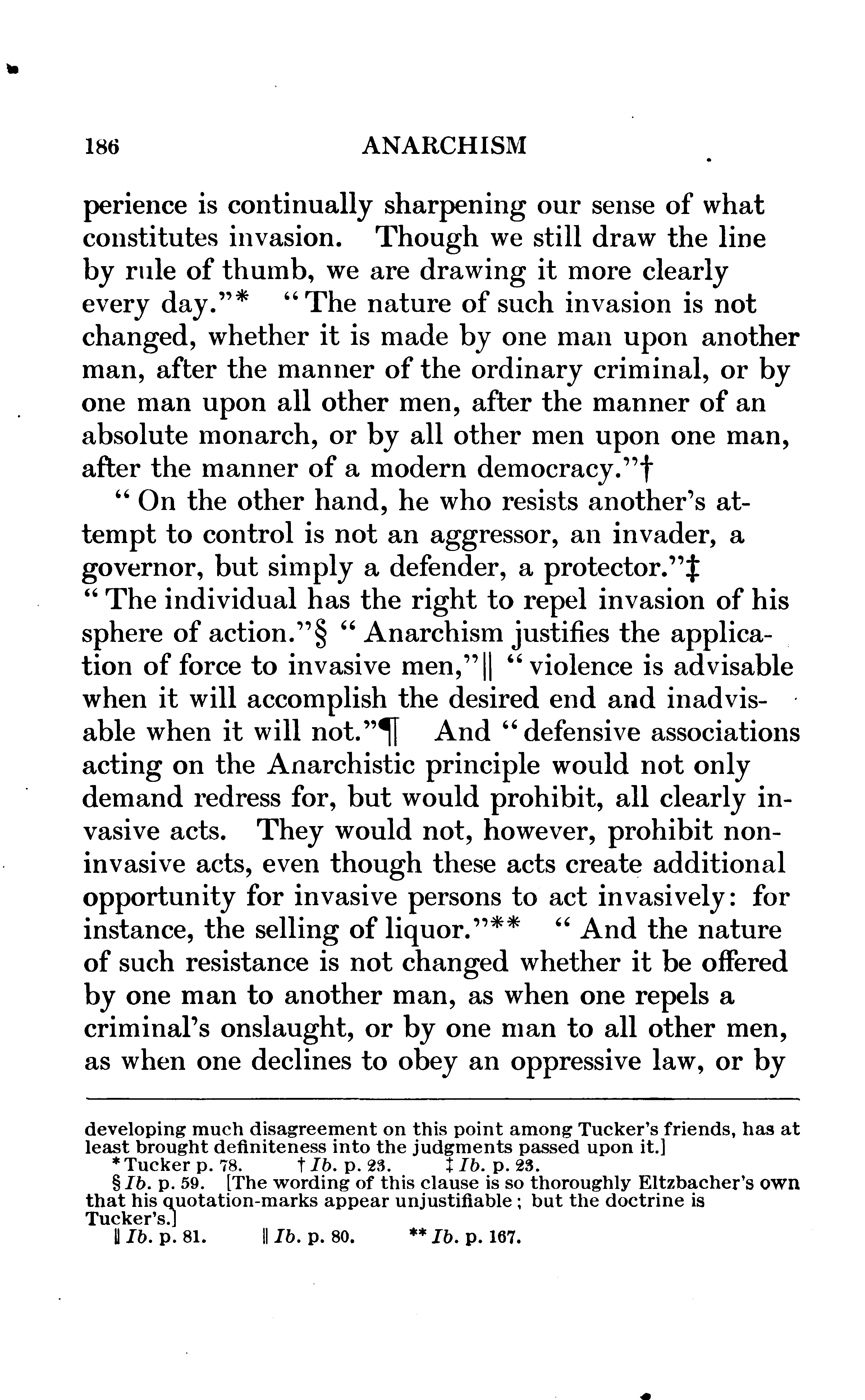 Every person who examines this book at all will speedily divide its contents into Eltzbacher's own discussion and his seven chapters of classified quotations from Anarchist leaders; and, if he buys the book, he will buy it for the sake of the quotations. I do not mean that the book might not have a sale if it consisted exclusively of Eltzbacher's own words, but simply that among ten thousand people who may value Eltzbacher's discussion there will not be found ten who will not value still more highly the conveniently-arranged reprint of what the Anarchists themselves have said on the cardinal points of Anarchistic thought. Nor do I feel that I am saying anything uncomplimentary to Eltzbacher when I say that the part of his work to which he has devoted most of his space is the part that the public will value most.
