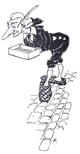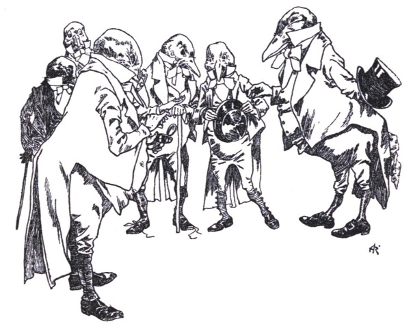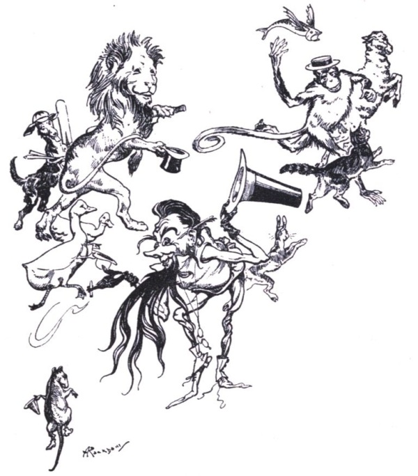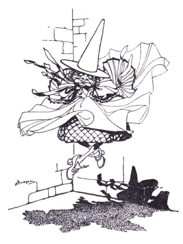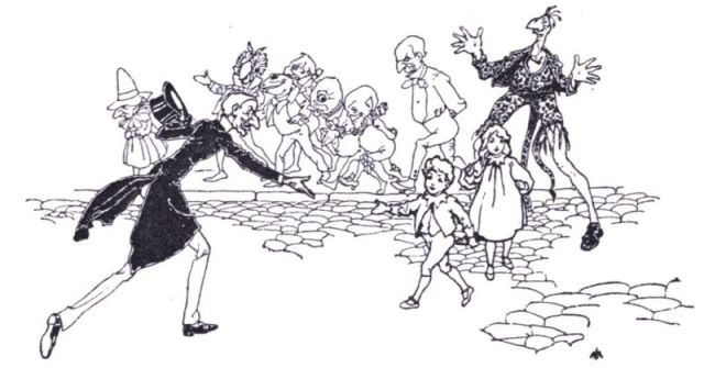 It was the Zankiwank, who was doing some conjuring tricks for the benefit of the Jackarandajam and Mr Swinglebinks, to whom Willie referred. The Zankiwank was certainly a very curious person to look at. He had very long legs, very long arms, and a very small body, a long neck and a head like a peacock. He was not wearing a bathing suit as Willie imagined, because there were tails to his jacket, hanging down almost to his heels. He wore a sash round his waist, and his clothes were all speckled as though he had been peppered with the colours out of a very large kaleidoscope. The Jackarandajam was also rather tall and thin, but dressed in the very height of fashion, with a flower in his coat and a cigarette in his mouth, which he never smoked because he never lit it. He was believed by all the others—you shall know who all the others were presently—to know more things than the Man-in-the-Moon, because he nearly always said something that nobody else ever thought of. And the Man-in-the-Moon knows more things than the Old Woman of Mars. You have naturally heard all about Mars—at least, if you have not heard all about her, you all have heard about her, which is just the same thing, only reversed.
