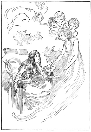 After tea Meg took Lilian to bed, and Toby showed Will Fern where he was to sleep. Then he went to sit by the fire and read his paper, and fell asleep, to have a wonderful dream so terrible and sad, that it was a great relief when he woke to find Meg sitting near him, putting some ribbons on her simple gown for her wedding, and looking so happy and young and blooming, that he jumped up to clasp her in his arms.