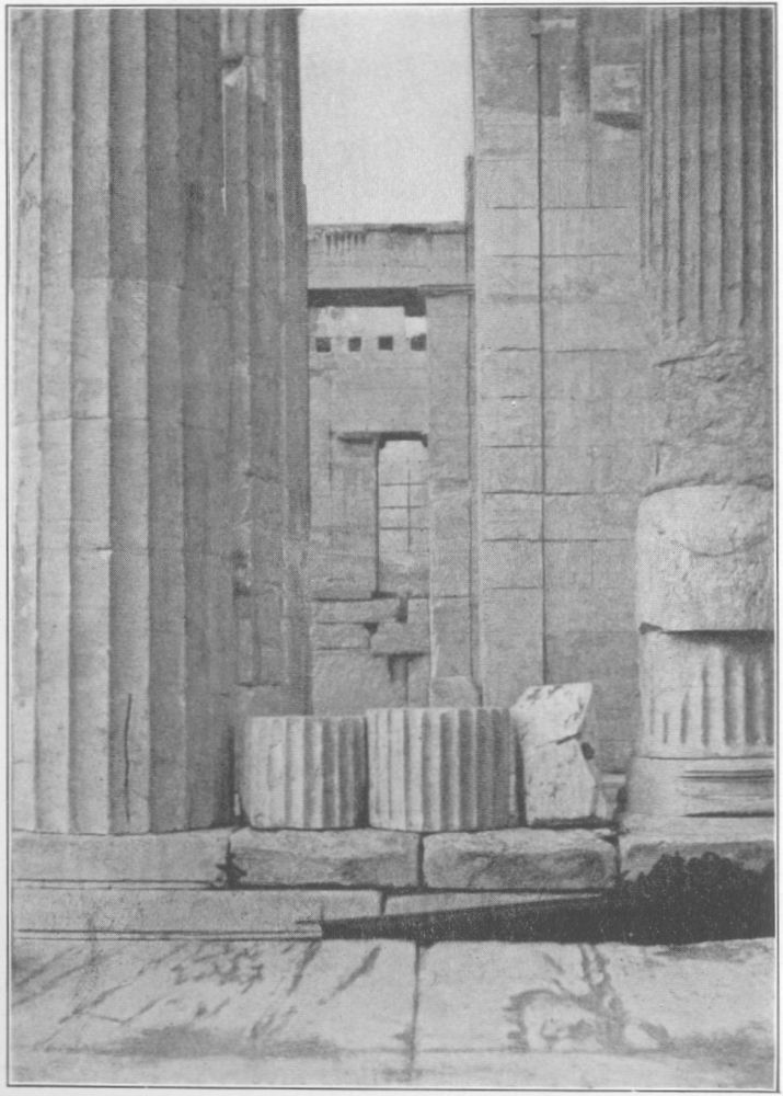 The irregular position of the door and the windows of the north-west wing of the Propylaea has long been remarked, though no explanations of the phenomenon have been offered. Bohn, Die Propylaeen der Akropolis zu Athen, p. 23, says of the south wall of this wing: "Die Wand welche die Halle von dem eigentlichen Gemach trennt, ist von einer Tür und zwei Fenstern durchbrochen. Erstere liegt jedoch nicht in der Mitte, die letzteren wiederum unsymmetrisch zu ihr. Irgend einen Grund, irgend eine axiale Beziehung zu den Säulen vermochte ich in dieser abweichenden Anordnung nicht zu finden." The east wall of the Erechtheum, on the other hand (A. J. A., 1906, Pl. 8), was pierced by a central door and two windows equidistant from it. That such symmetrical arrangement should obtain in the Erechtheum and not in the closely contemporary Propylaea very justly occasions surprise. It is the purpose of this study to attempt to explain the irregularity in the latter.