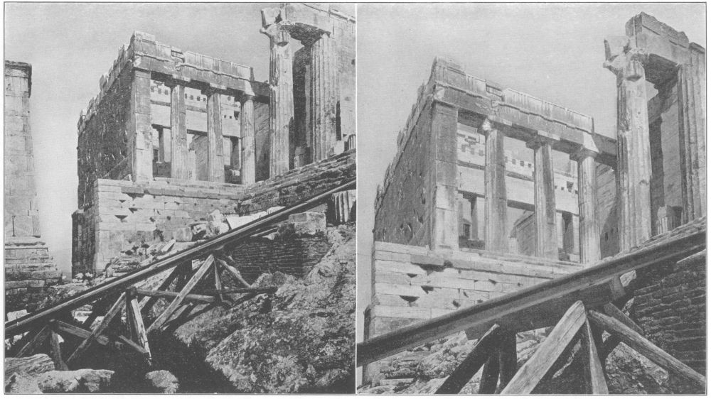 It will be readily seen that if the S.W. wing, which was never completed, had been built as an exact counterpart of the N.W. wing, the three parts would have been designed to be seen from a common point at the beginning of the straight road through the portal, and the structure though tripartite would have been a symmetrical unit. Professor Dörpfeld (Ath. Mitt., 1885, p. 45 ff.) has shown that the architect planned at one time a south-west wing with a colonnade instead of a closed west wall, and that the present curtailed wing could have been incorporated in the wing as planned, if permission had ever been given to encroach upon adjacent sanctuaries. There is, of course, no gainsaying that a colonnade was at one time projected for the west side of the wing, but does this fact in any wise exclude the possibility of a still earlier plan? The only reason given by Prof. Dörpfeld for the colonnade is that access might be had to the Nike temple. But a closed wall in place of the colonnade would not have made the temple inaccessible so long as there remained at the north-west corner of the wing the steps which afforded a far more convenient approach to the temple for those coming up to the Acropolis. Indeed, it seems quite possible that the architect, Mnesicles, originally planned a south-west wing (Stuart & Revett, The Antiquities of Athens, II, V, Pl. III) exactly like the north-west wing, but that he was compelled to give it up, that his compromise of a colonnade was also rejected, and that he had to content himself with the curtailed form in which the wing now exists, but that he so placed the back wall of the chamber that it might ultimately be incorporated in a wing with a colonnade on the west side.