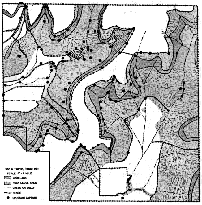 Earlier field studies of the opossum have produced somewhat conflicting evidence and conclusions regarding the extent and manner of the opossum's travels. Lay (1942:158) live-trapped and marked 117 opossums on an 86-acre study area in eastern Texas over a two-year period and caught 29 of them at three or more different [Pg 316] trapping stations. He found that "The average minimum area between the stations in these 29 home ranges was 11.5 acres. The mean of the greatest distances traveled between stations was 1460 feet, which would form a theoretical circle of 38.4 acres.... Separate individual territories are not important to opossums as home ranges overlapped in every instance." Reynolds, in central Missouri, concluded that: "The subsequent recovery of only 5 of 68 released animals, the reported capture of one individual 7 miles from the point of release nine months later, and the rapid repopulation of an area devoid of opossums at the close of the hunting season indicate that most opossums are nomadic." In southeastern Iowa, Wisemann and Hendrickson (1950:336) found that: "Recaptures, in 1942, of three opossums tagged in 1941 indicated a yearly mobility of one-fourth mile; four tagged in 1942 were recaptured within one-half mile from sites of tagging."