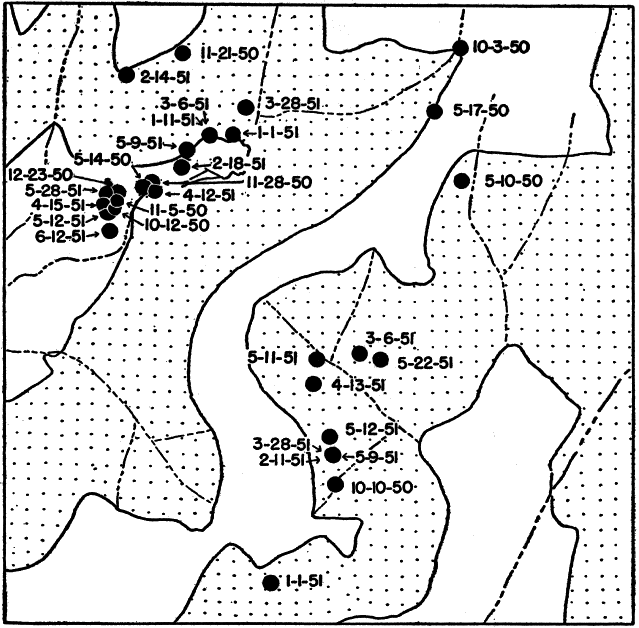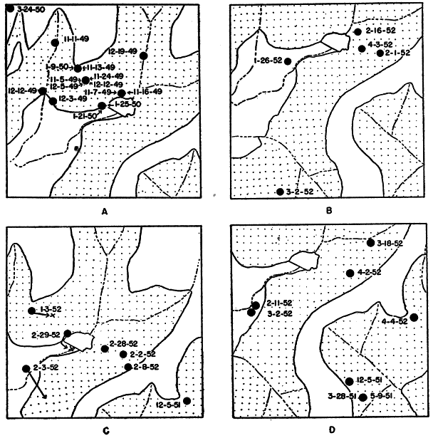 Approximate size of the usual home range is apparent from the several figures although various unknown or unmeasurable factors distort the data. The usual home range of the opossum in the area of the study is in the neighborhood of 50 acres or a little less. With the data available no significant differences in sizes of home ranges are [Pg 320] discernible between males and females nor between adults and young of the year. Shifts occur frequently, contributing to population turnover, which may result in almost complete replacement of individuals in the course of a year's time, on an area of less than a square mile.